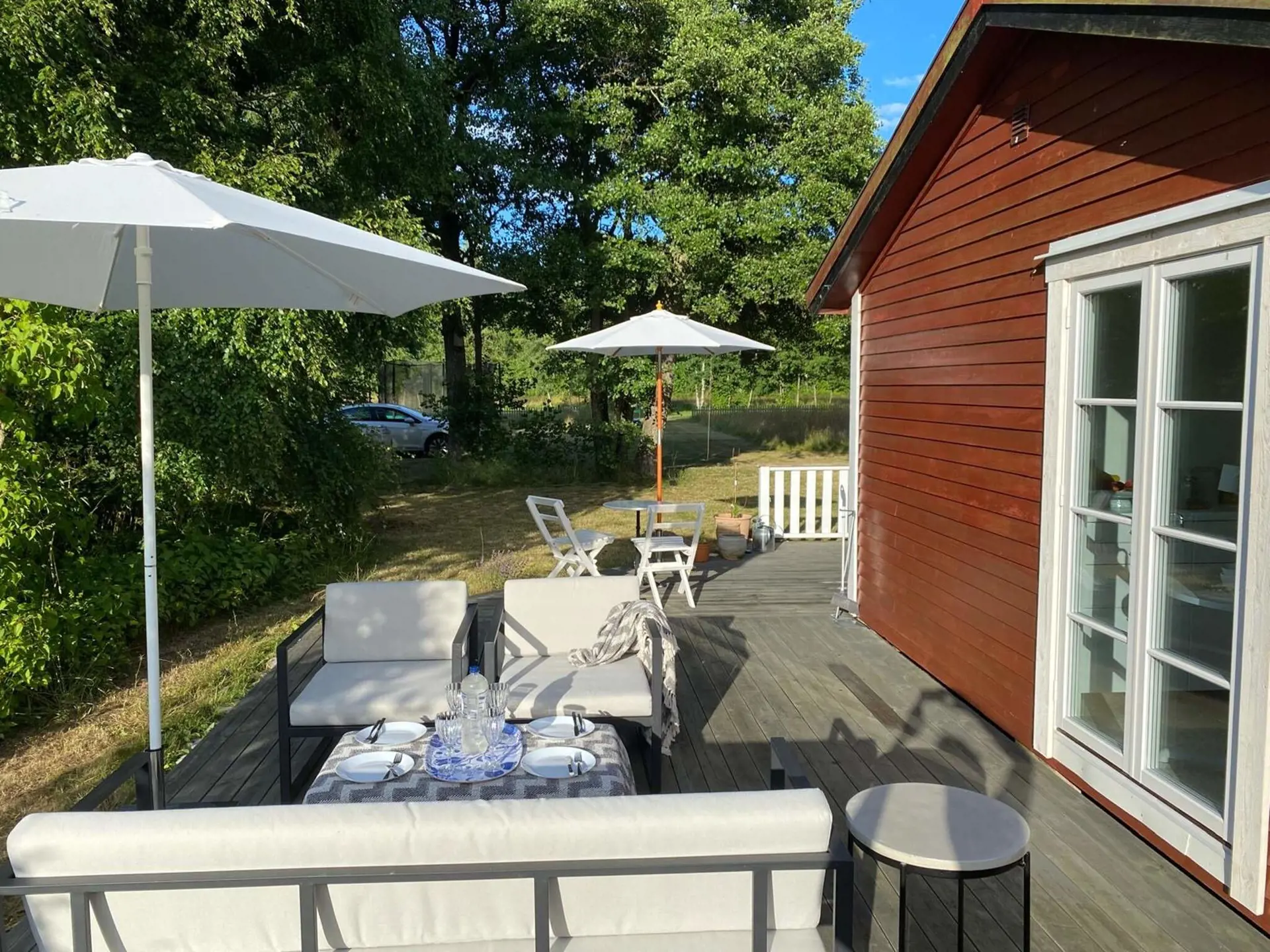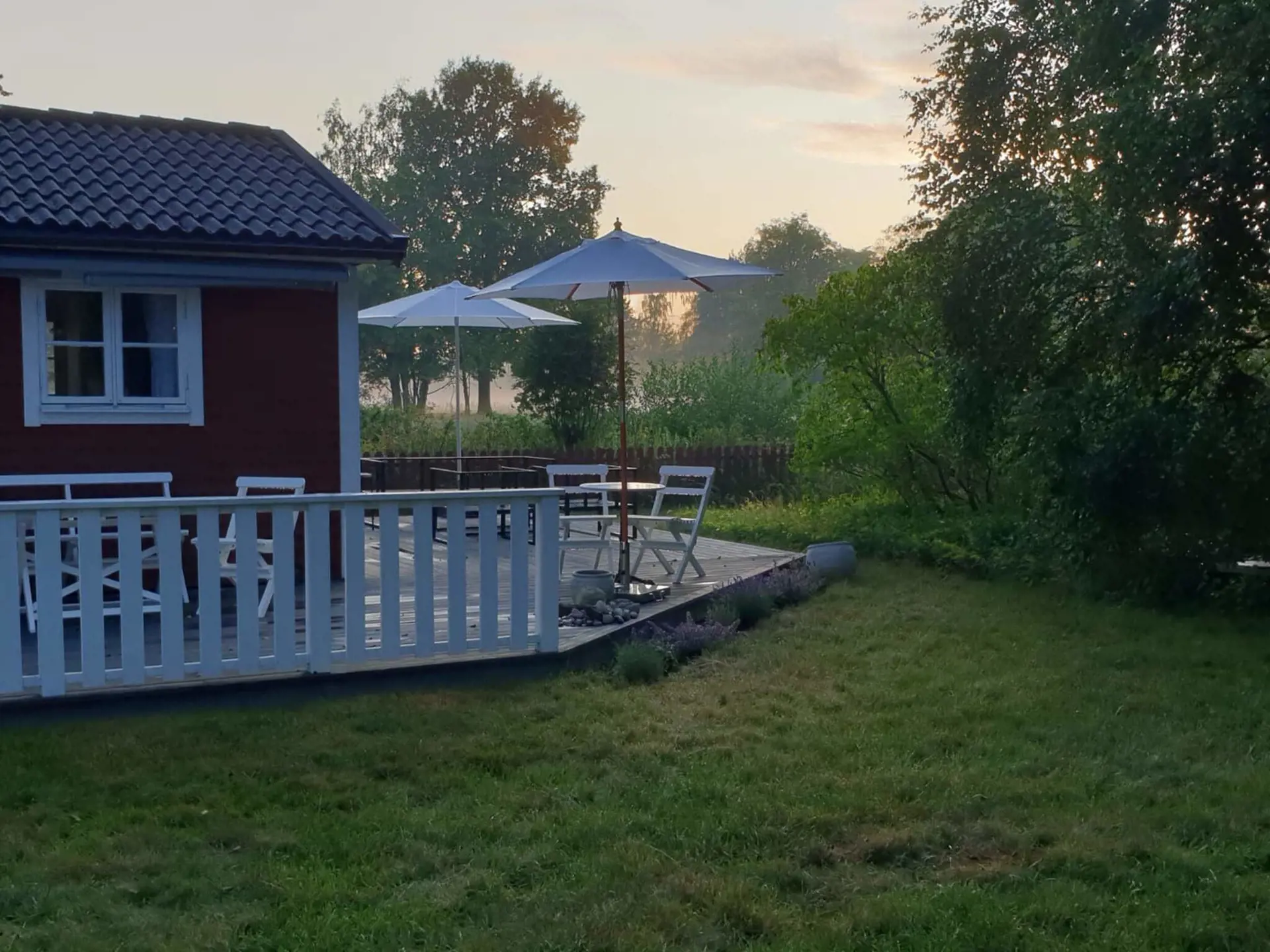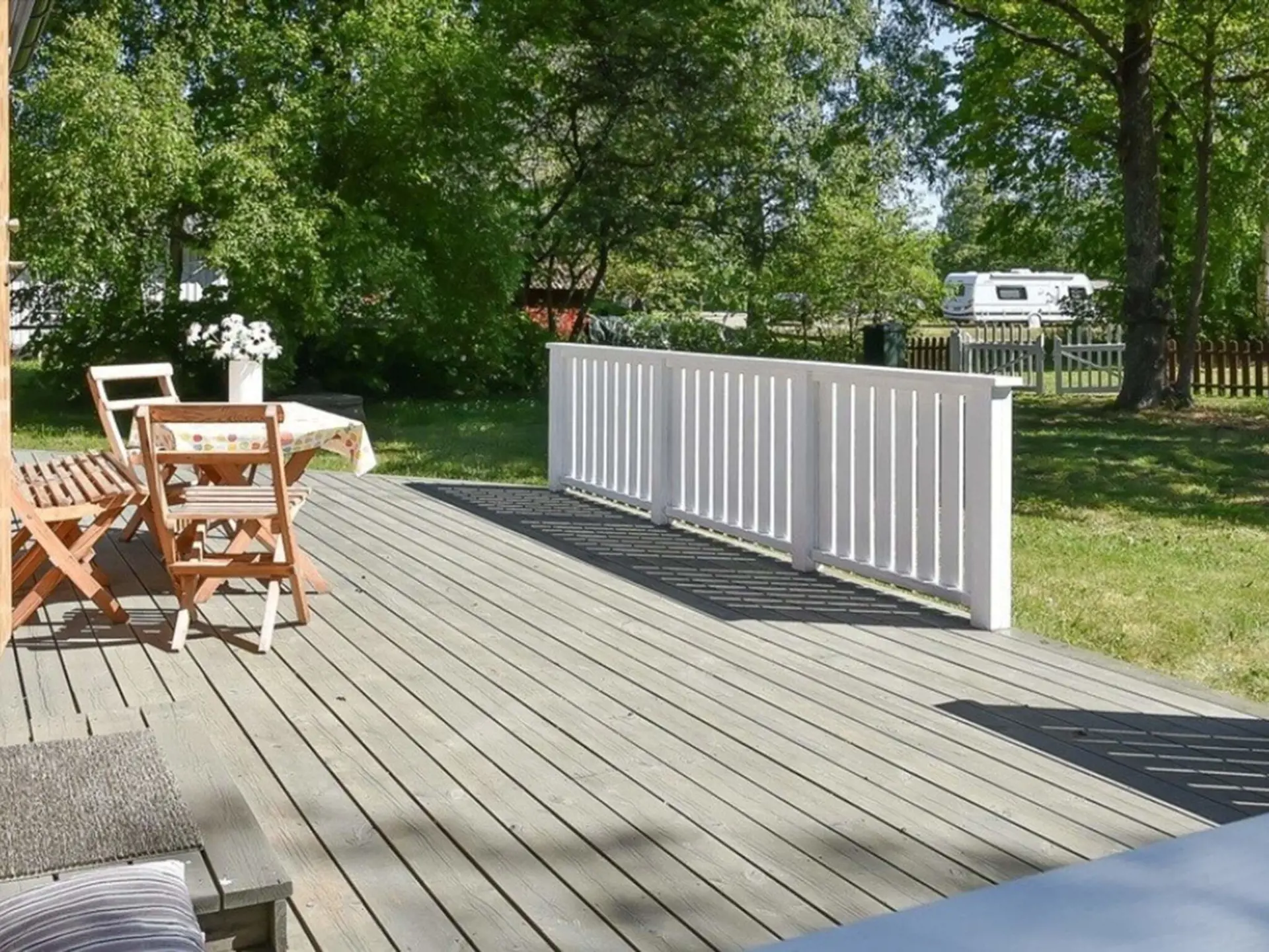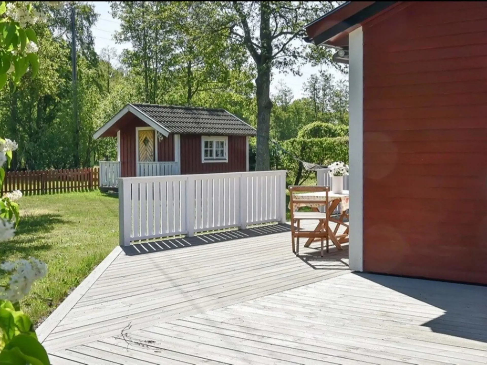 Das schöne Grundstück mit großer Holzterrasse und Gartenmöbeln liegt in einer ruhigen, grünen Umgebung mit herrlicher Aussicht. Die Terrasse umgibt das Haus von zwei Seiten und bietet Ihnen so sowohl tagsüber als auch abends Sonne.