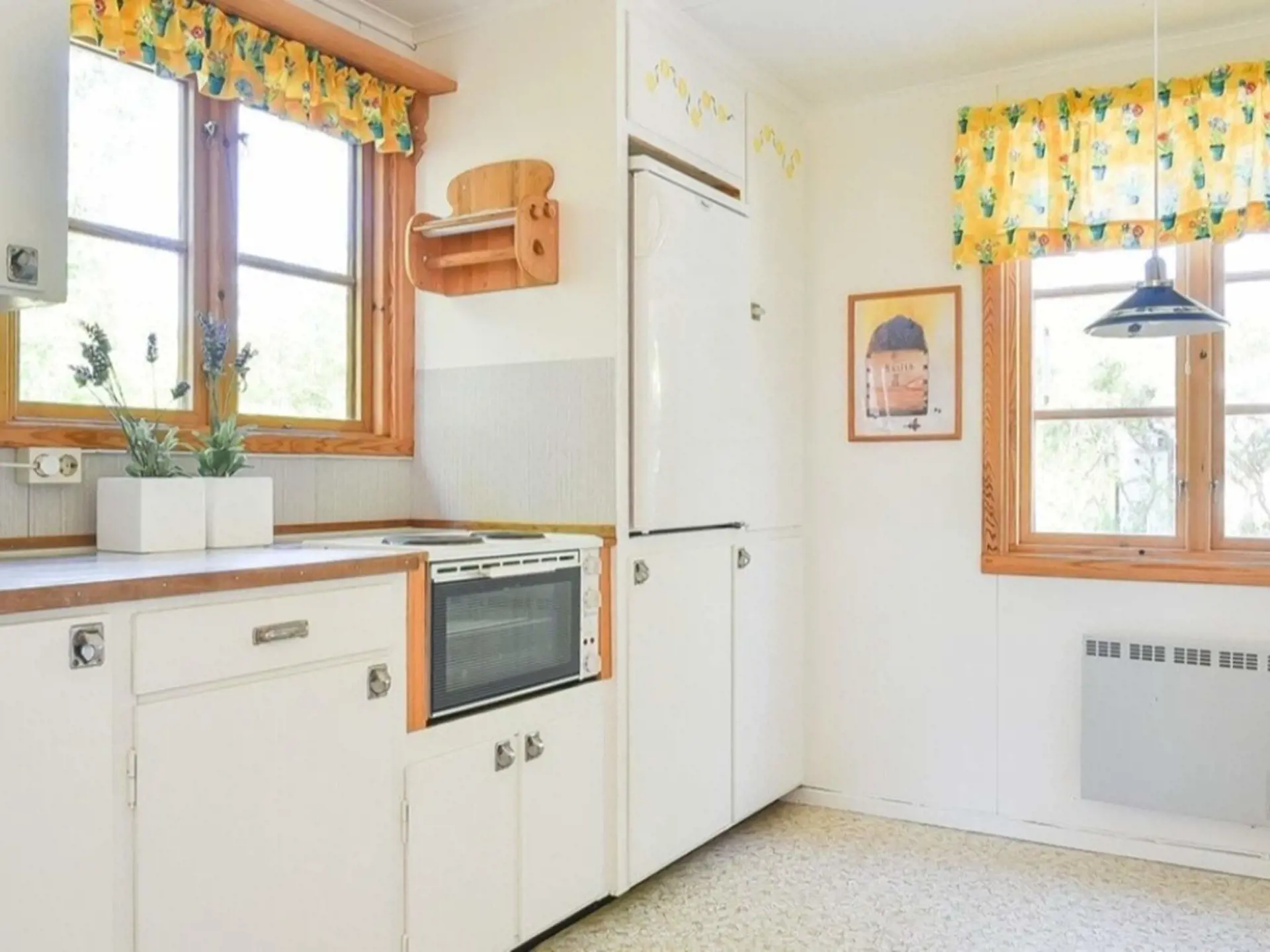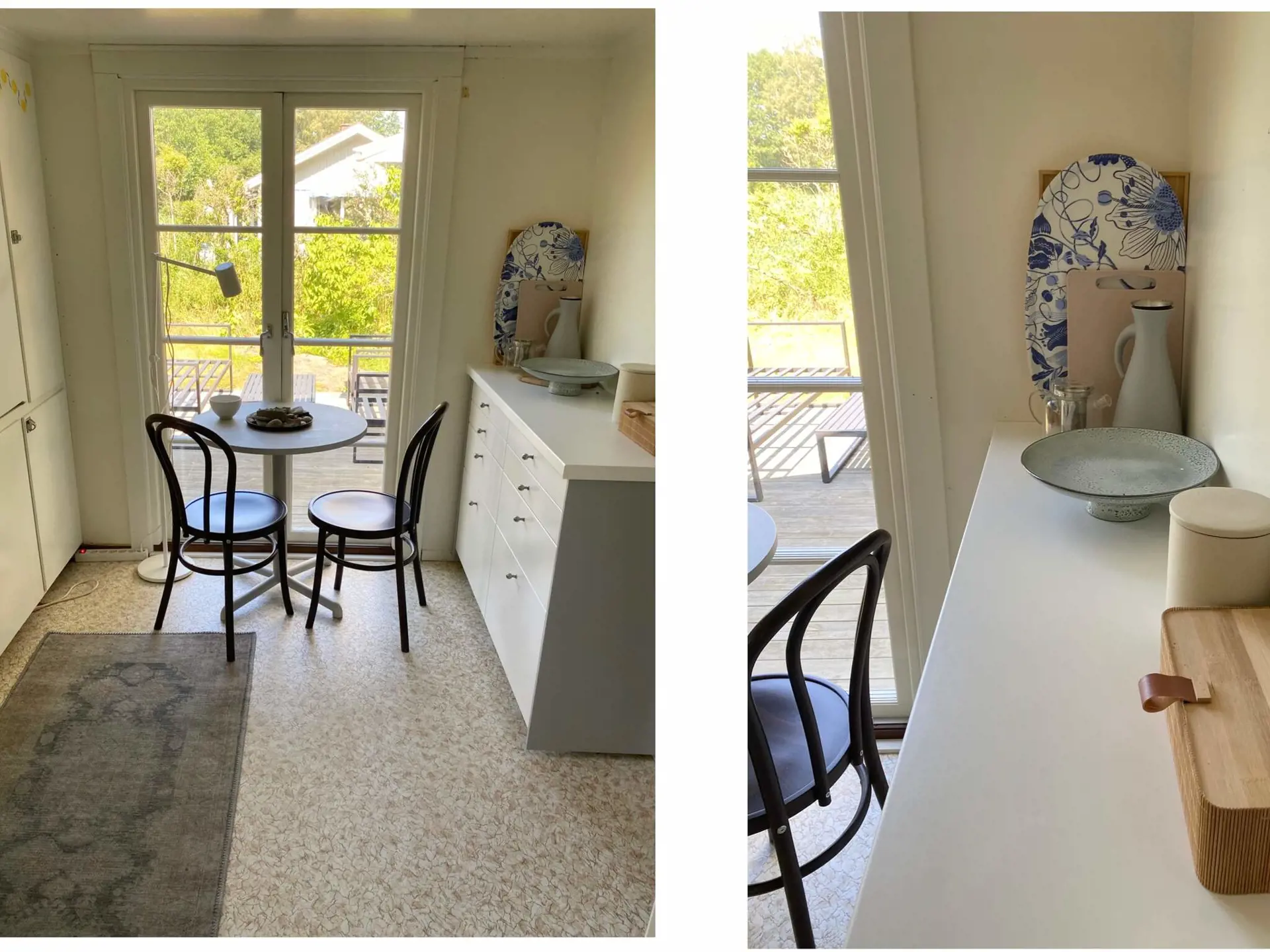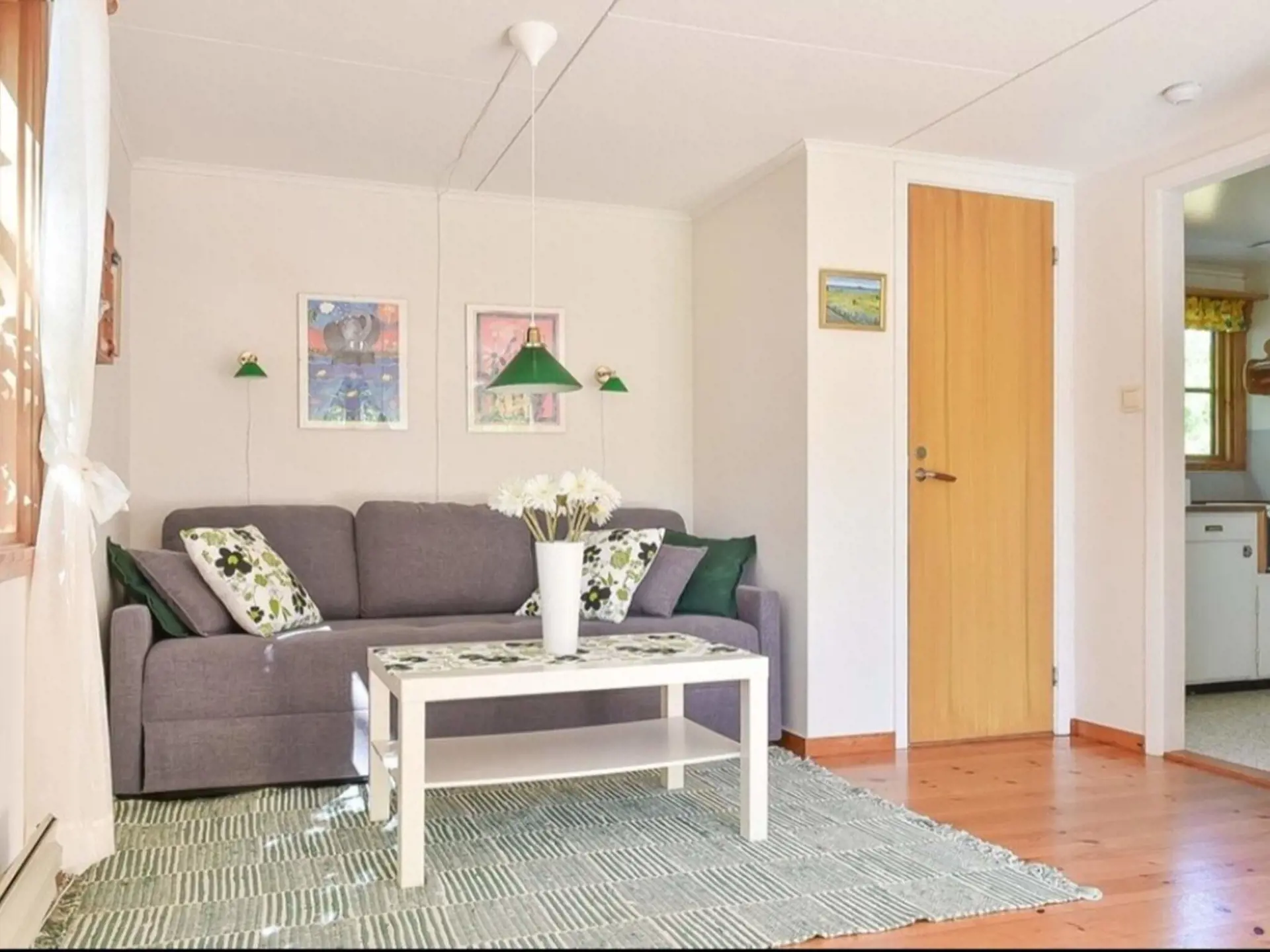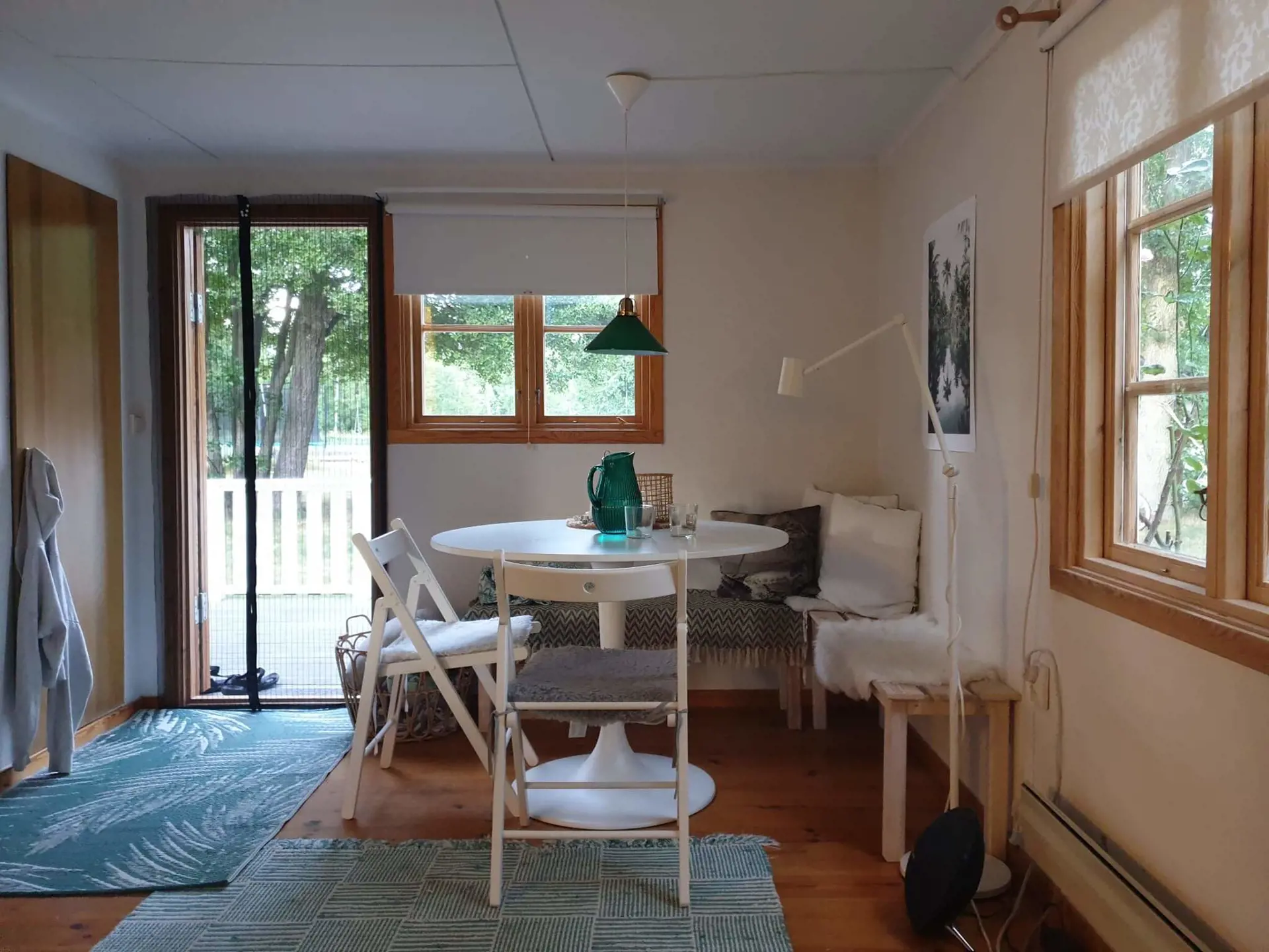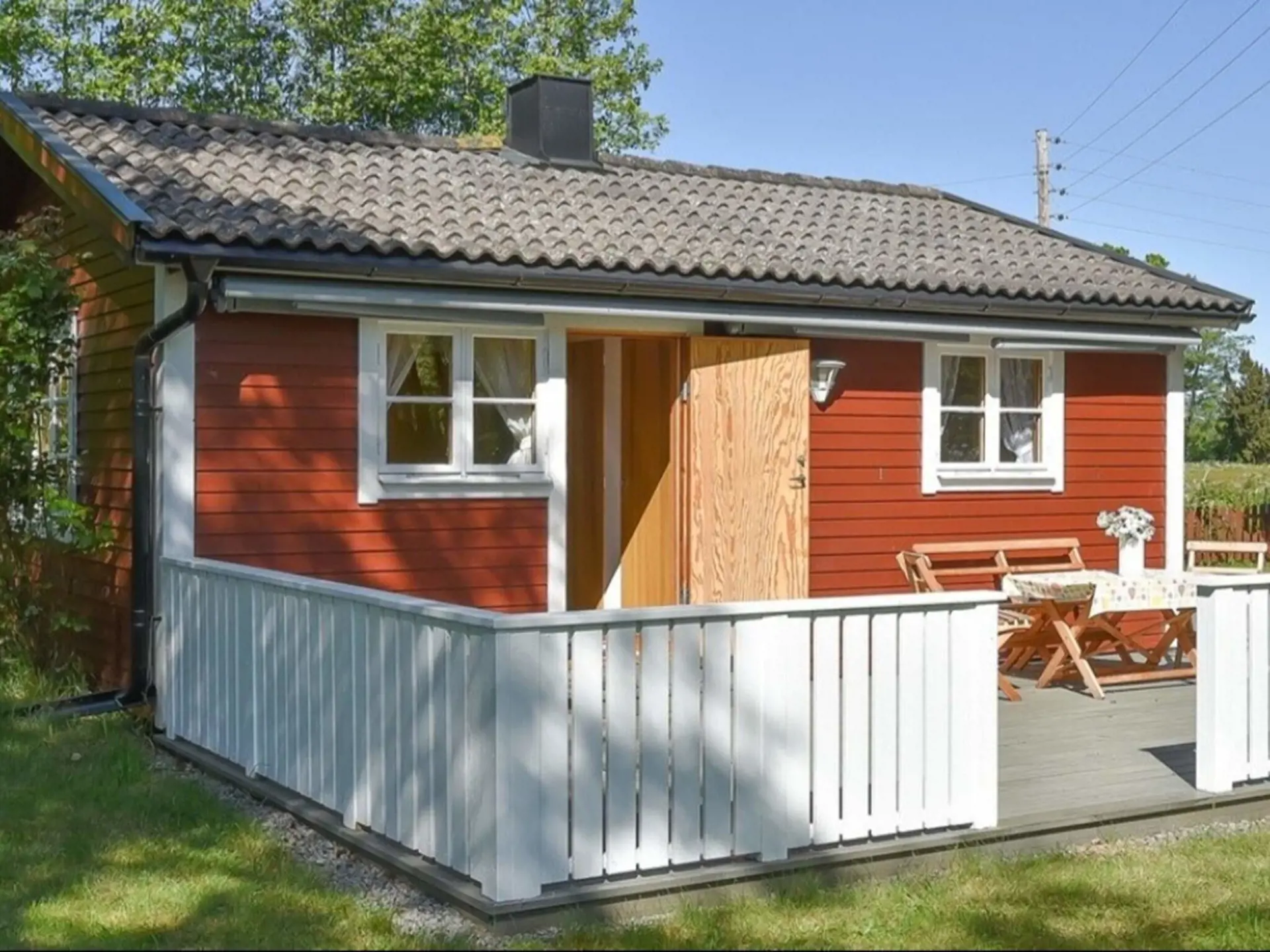 Das Ferienhäuschen hat ein Wohnzimmer mit Essbereich und einem Sofa, das zu einem Doppelbett umgebaut werden kann. Die Küche hat eine Terrassentür zur Terrasse. Zusätzlich gibt es einen kleineren Essbereich. Der Backofen ist ein kleineres Modell.