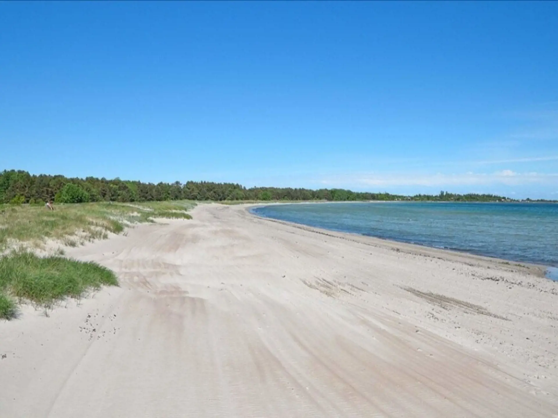 Sandbybadet lädt mit seinem herrlichen weißen Sandstrand, einem Schwimmsteg und einem Kiosk nur wenige Fahrradminuten entfernt zu sonnigen Sommertagen am Wasser ein.