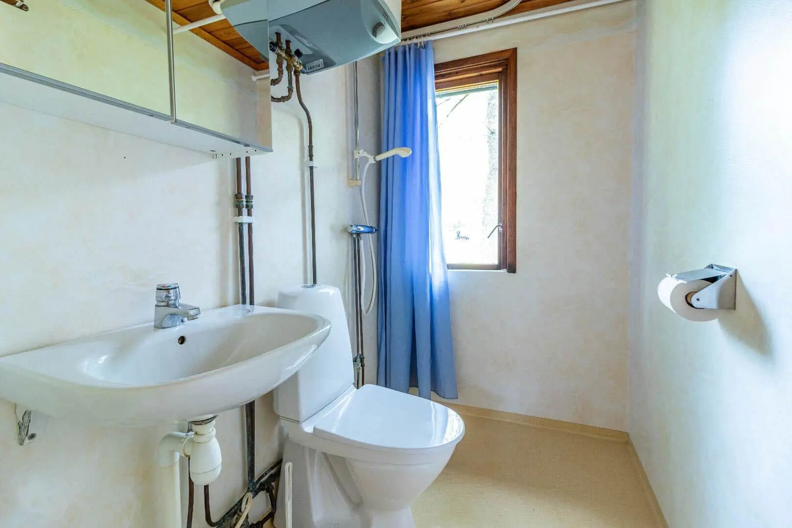 Das rund 43 m² große Ferienhaus bietet Platz für bis zu 4 Personen. Über die kleine, überdachte Terrasse gelangt man in den offenen Wohn-, Ess- und Küchenbereich. Im Wohnbereich laden Sofa und Sessel zum Entspannen ein, während der TV mit schwedischen Programmen Unterhaltung bietet. Der Essbereich verfügt über einen Tisch für vier Personen. Die Küche ist komplett eingerichtet, unter anderem mit einem 4‑Platten-Induktionskochfeld.