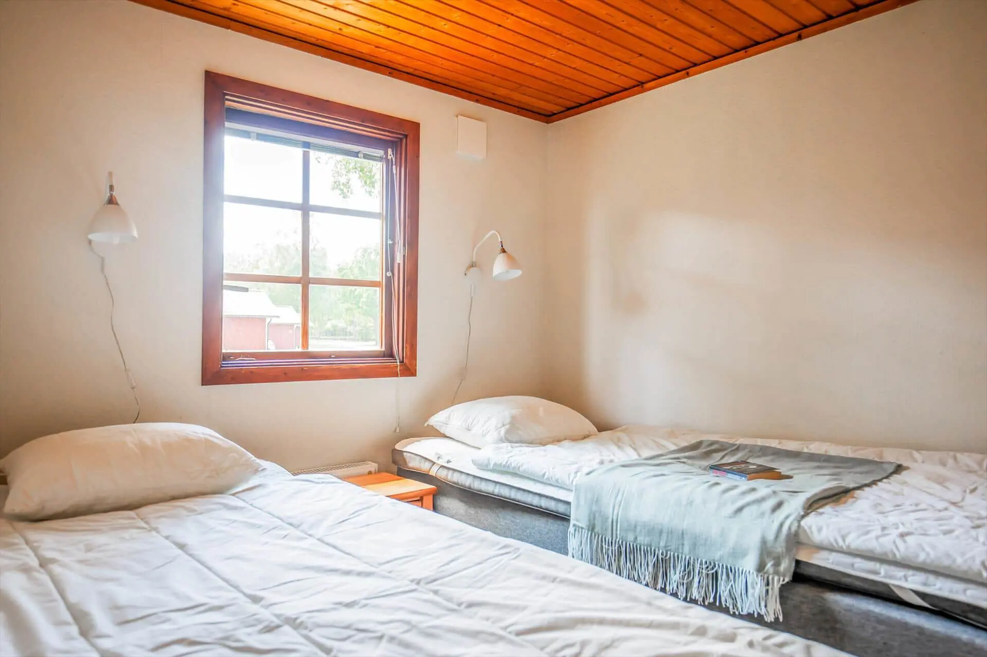 Die Wohnfläche des Hauses beträgt 43 m² und bietet Platz für bis zu 4 Personen. Über eine kleine, überdachte Terrasse gelangst du in den offenen Wohn-, Ess- und Küchenbereich. Der Wohnbereich ist mit Sofa, Sessel und TV (schwedische Programme) sowie Internet ausgestattet. Zwischen Küchen- und Wohnbereich steht ein Esstisch für vier Personen. Die Küche verfügt über ein 4-Platten-Induktionskochfeld, Ofen, Dunstabzugshaube, Kühlschrank, Gefrierschrank, Mikrowelle und Kaffeemaschine sowie die nötigen Utensilien. Im hinteren Bereich liegen zwei Schlafzimmer (1. Schlafzimmer: 2 Einzelbetten; 2. Schlafzimmer: Etagenbett) und das Badezimmer mit WC und Dusche. Auf der Terrasse findest du Terrassenmöbel und einen Grill. Im Haus gibt es eine Elektroheizung.