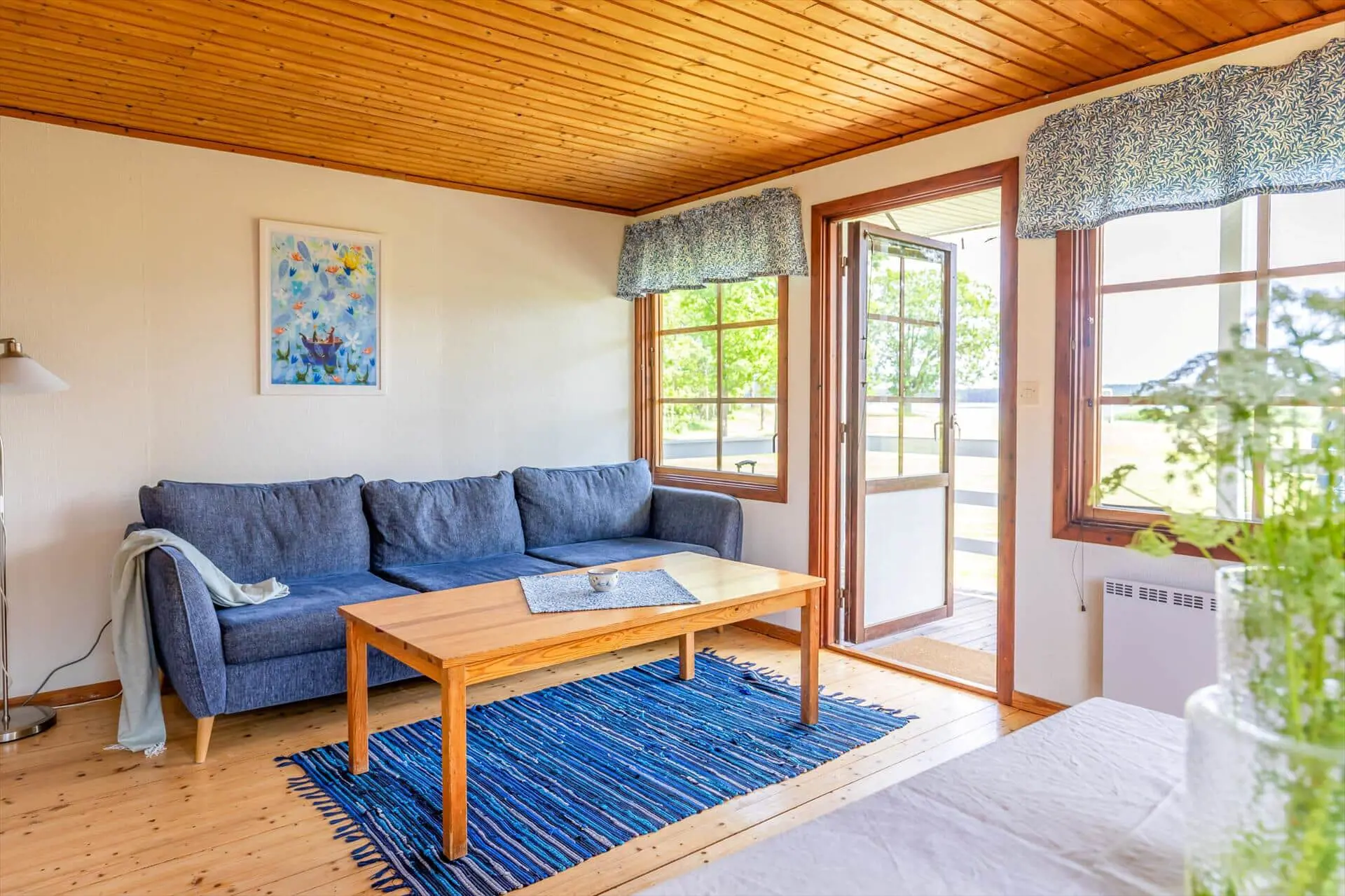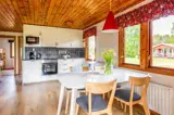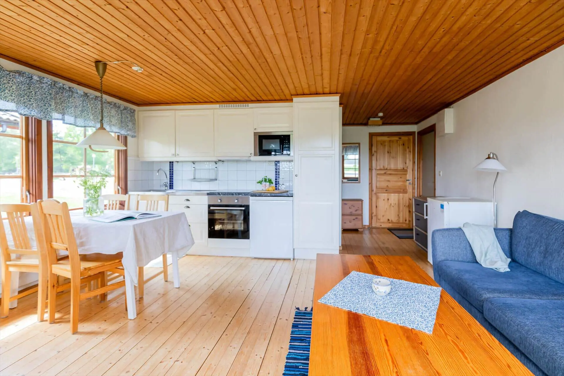 Die Wohnfläche des Hauses beträgt 43 m² und bietet Platz für bis zu 4 Personen. Über eine kleine, überdachte Terrasse gelangst du in den offenen Wohn-, Ess- und Küchenbereich. Der Wohnbereich ist mit Sofa, Sessel und TV (schwedische Programme) sowie Internet ausgestattet. Zwischen Küchen- und Wohnbereich steht ein Esstisch für vier Personen. Die Küche verfügt über ein 4-Platten-Induktionskochfeld, Ofen, Dunstabzugshaube, Kühlschrank, Gefrierschrank, Mikrowelle und Kaffeemaschine sowie die nötigen Utensilien. Im hinteren Bereich liegen zwei Schlafzimmer (1. Schlafzimmer: 2 Einzelbetten; 2. Schlafzimmer: Etagenbett) und das Badezimmer mit WC und Dusche. Auf der Terrasse findest du Terrassenmöbel und einen Grill. Im Haus gibt es eine Elektroheizung.