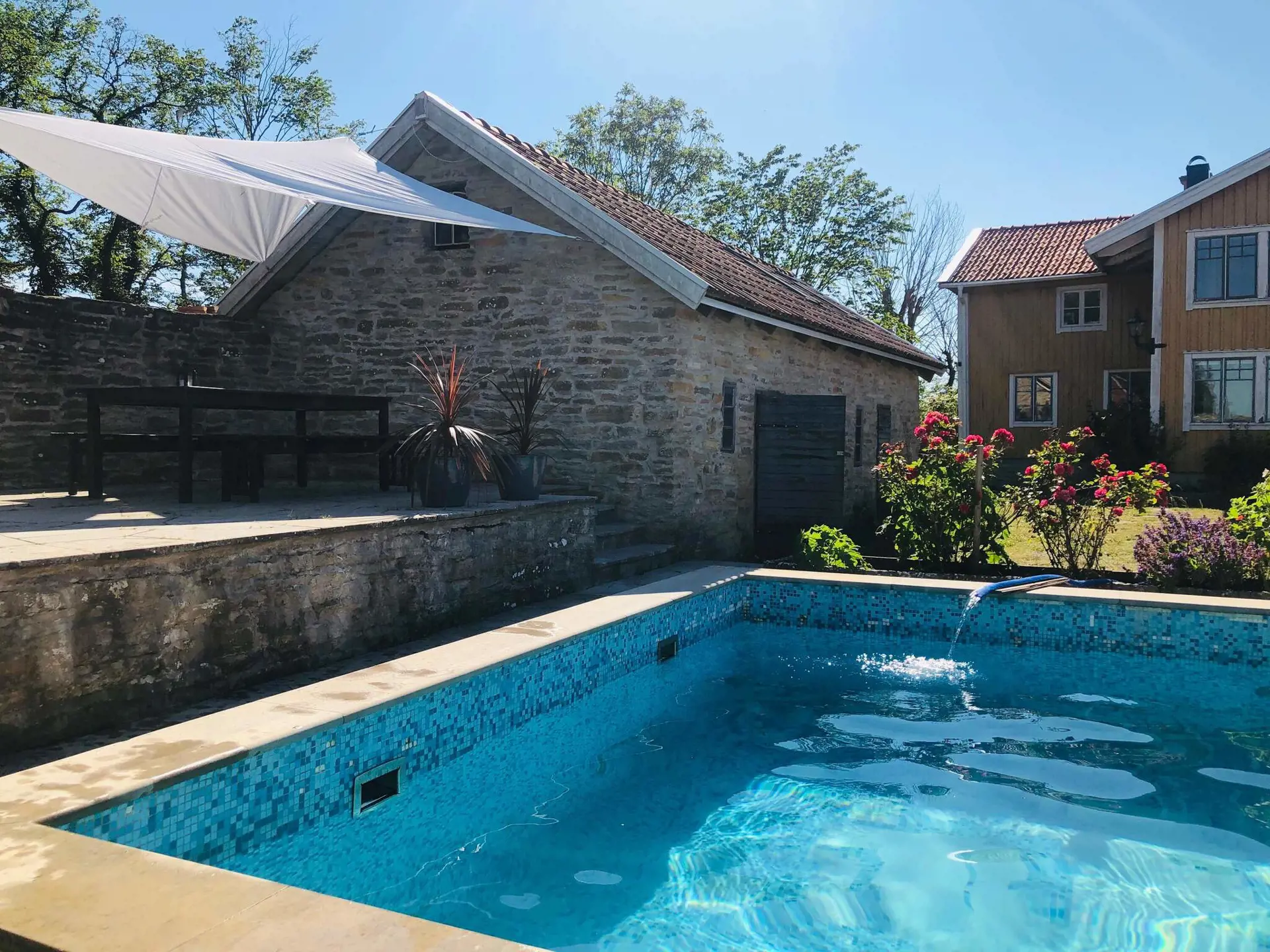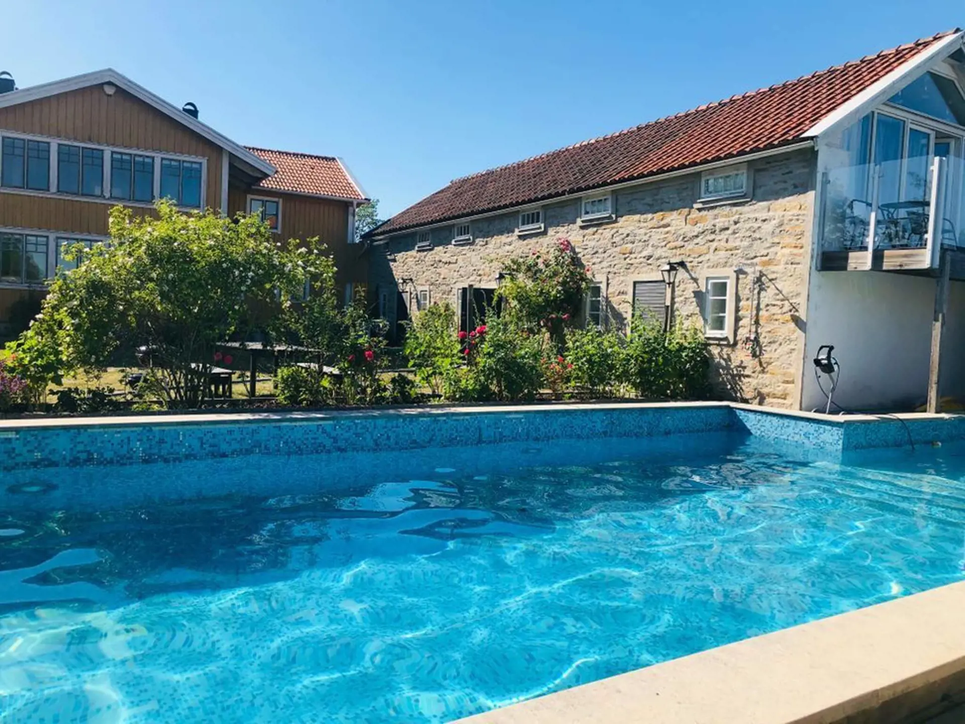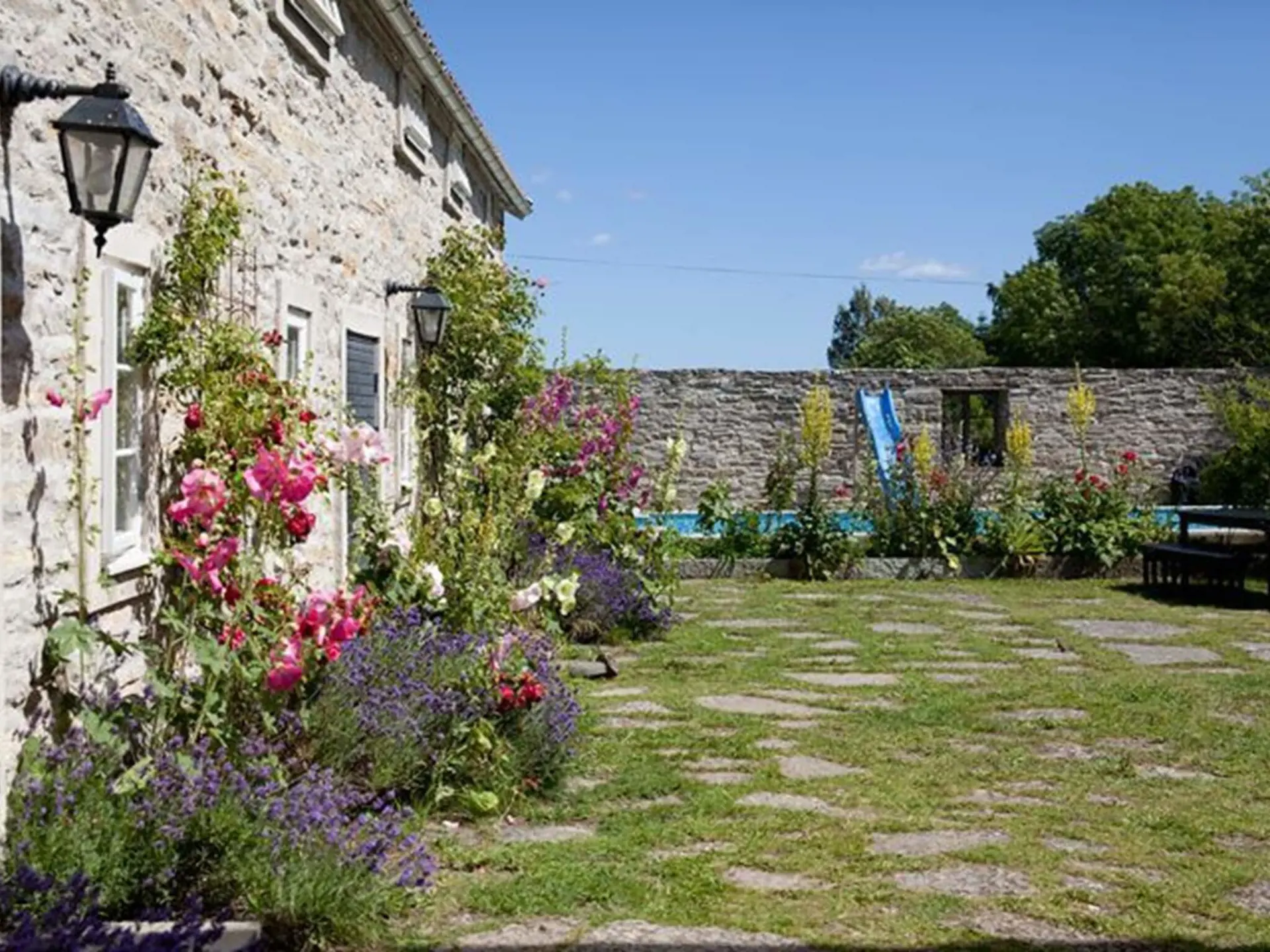 A wonderful courtyard with hollyhocks, lavender and Öland stone with the blue pool that adorns the garden gives the right holiday feeling. The characteristically beautiful Öland landscape "Allvaret" is just outside the wall, you can also see the sea on the horizon.