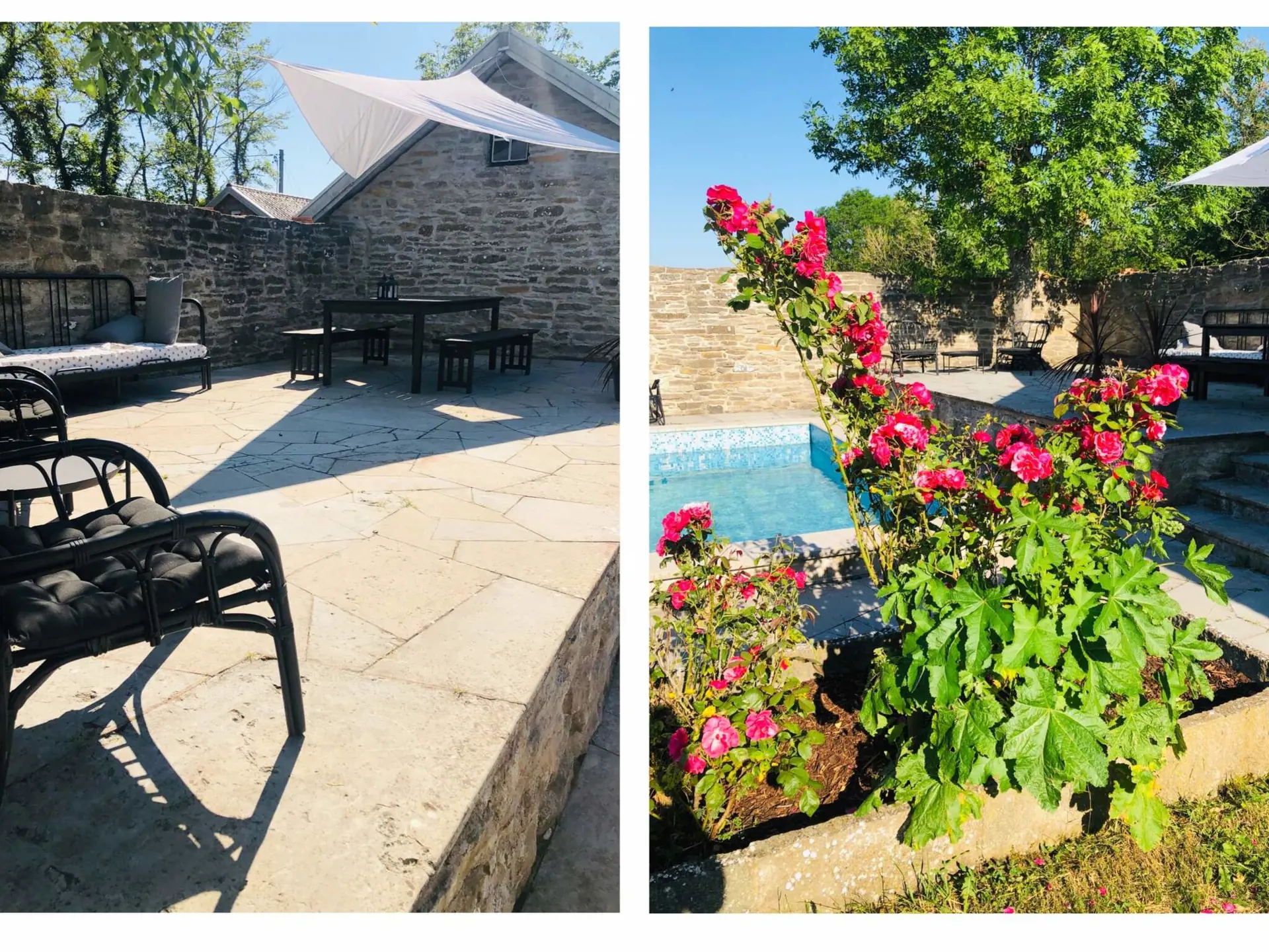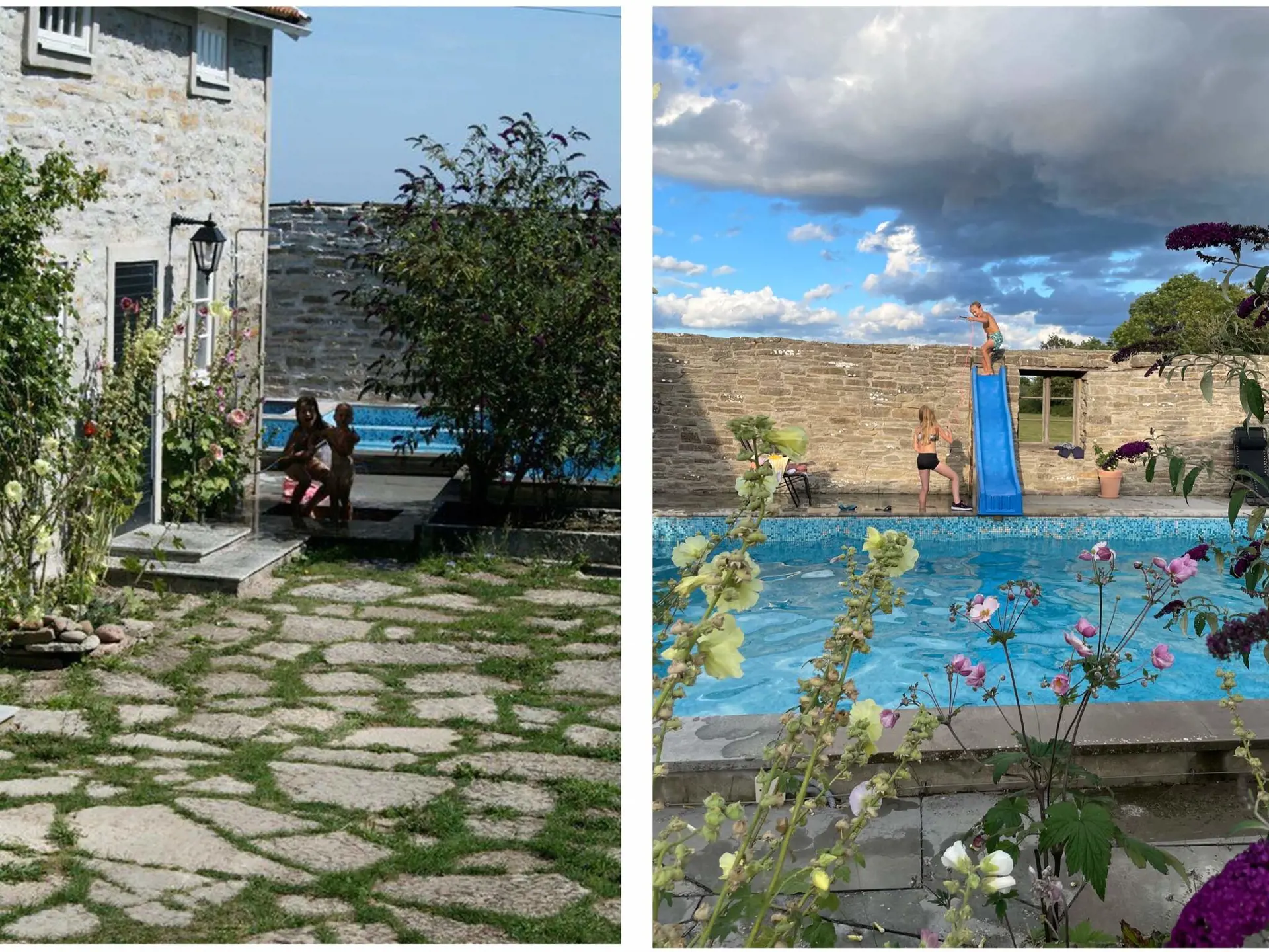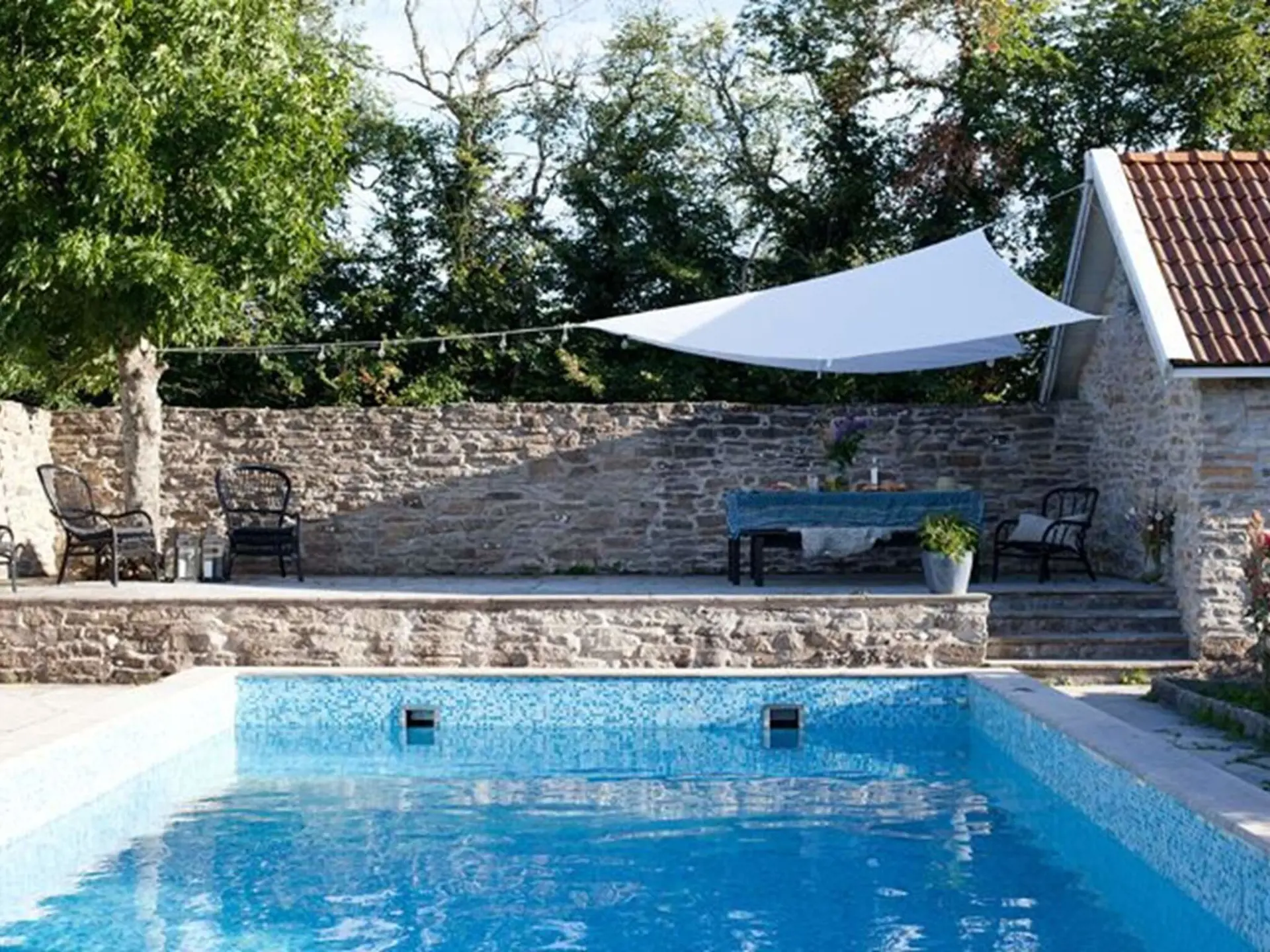 A wonderful courtyard with hollyhocks, lavender and Öland stone with the blue pool that adorns the garden gives the right holiday feeling. The characteristically beautiful Öland landscape "Allvaret" is just outside the wall, you can also see the sea on the horizon.