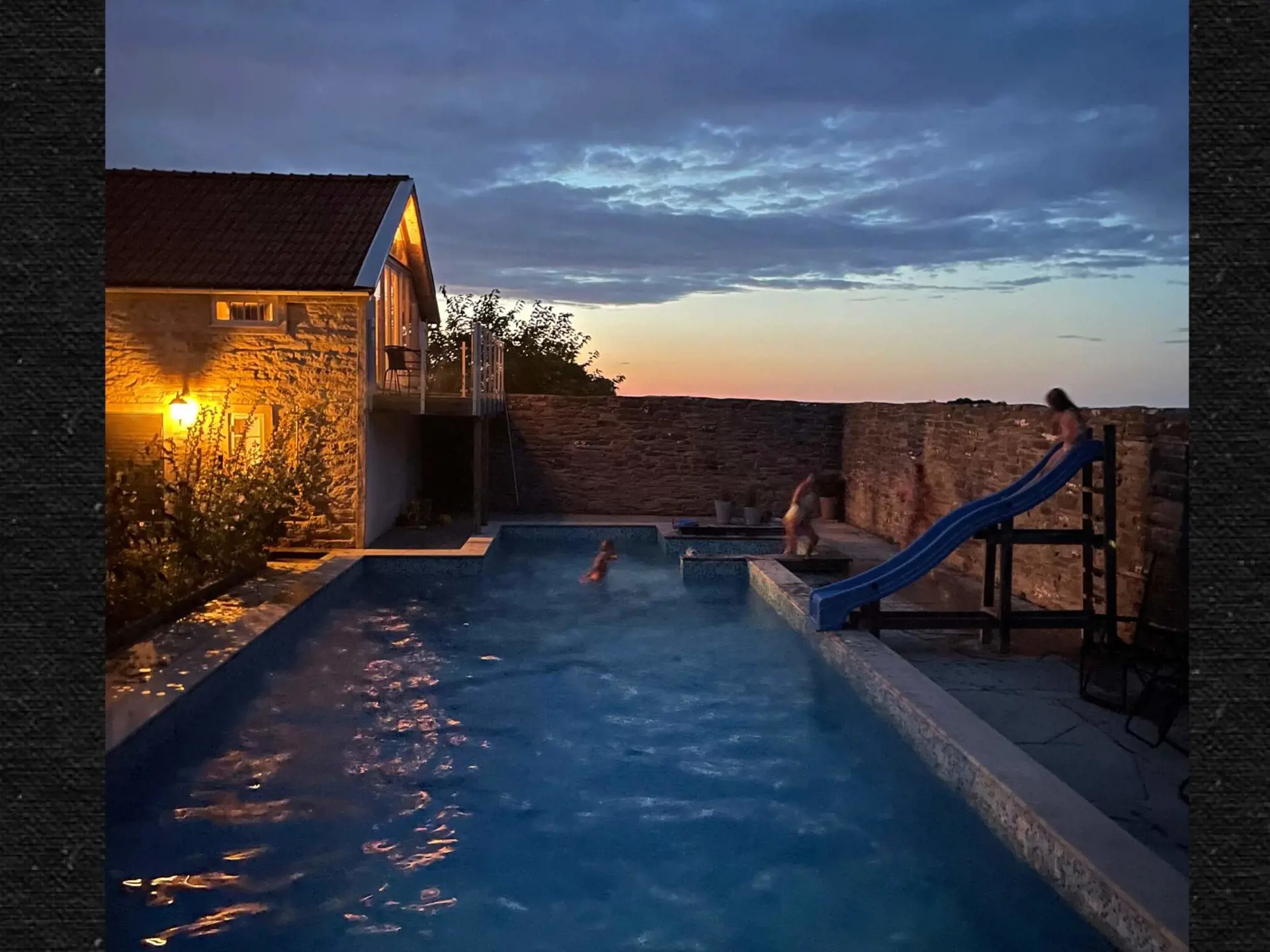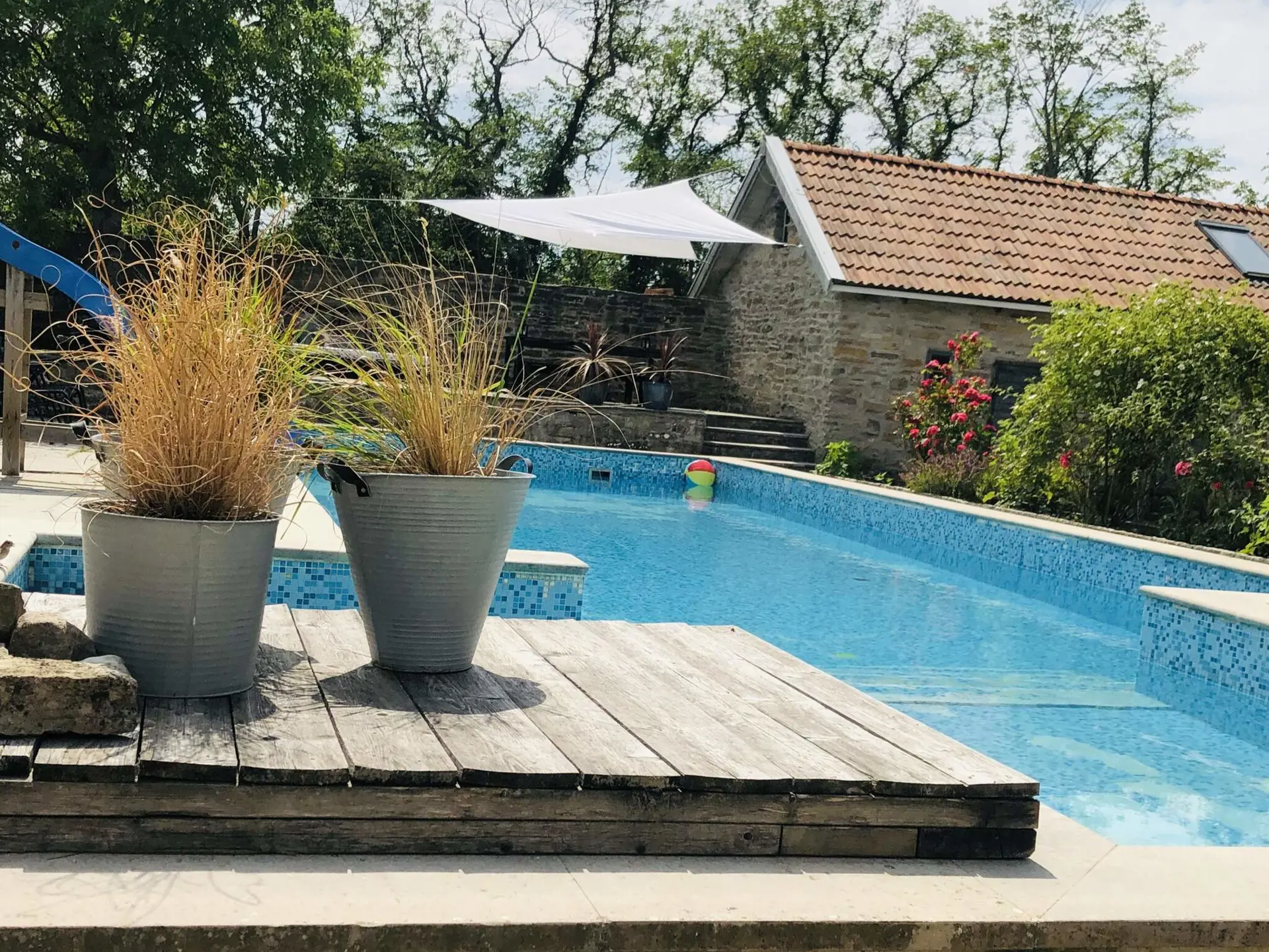 The pool is an unheated saltwater pool that has a depth of 70cm-180cm. There is a slide for children. The pool is not covered, so keep an eye on children.