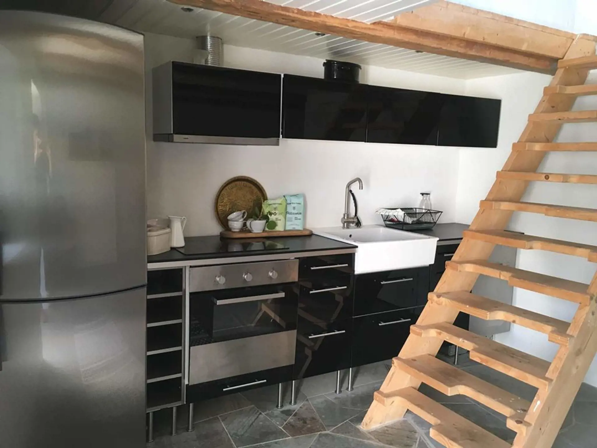 The duplex apartment is equipped with a fresh kitchen, dining area and toilet with shower on the lower floor.