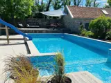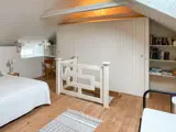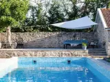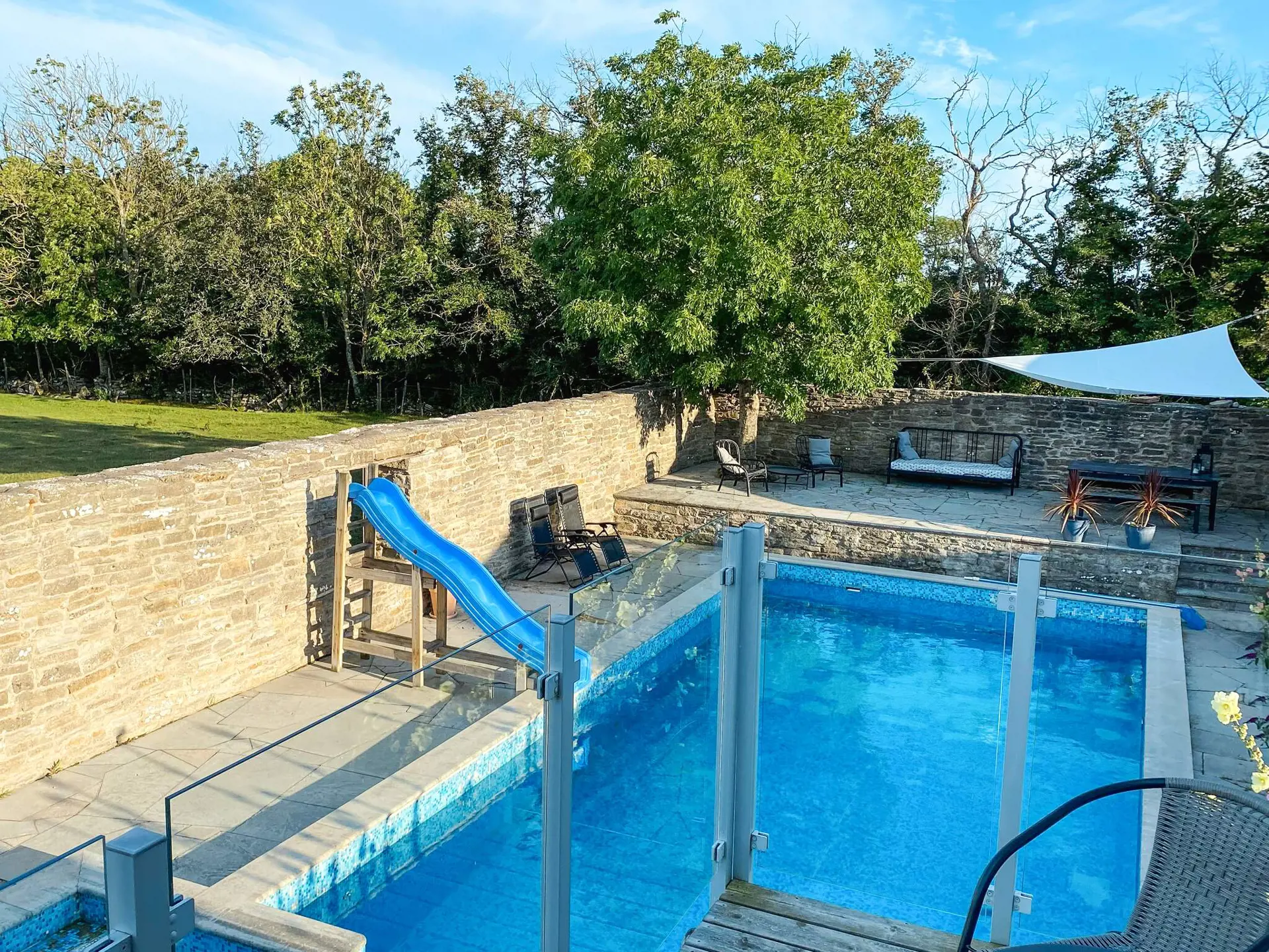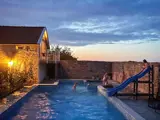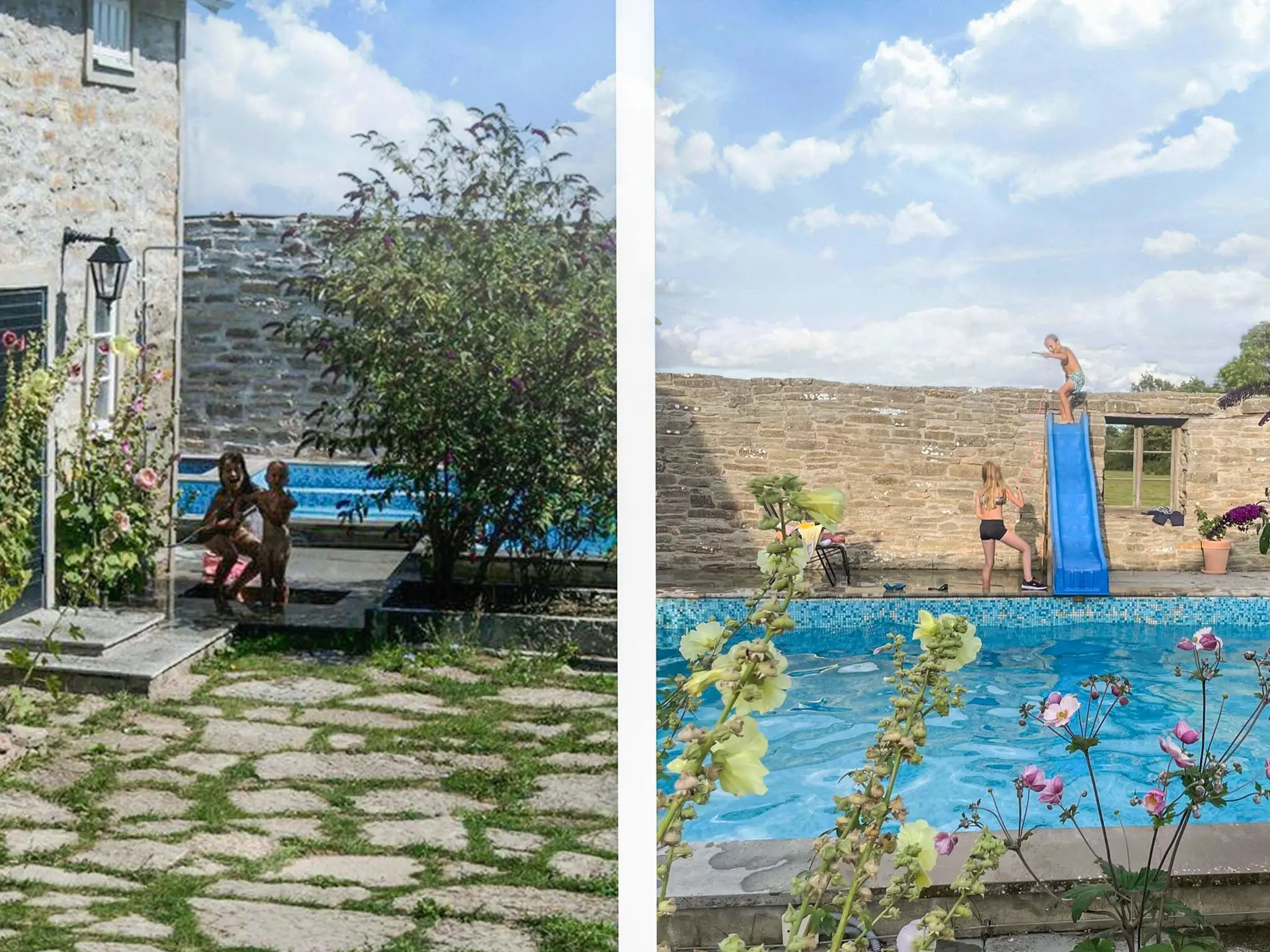 Im Inneren der Maisonettewohnung gibt's im unteren Bereich eine moderne Küche, einen Essbereich und ein Badezimmer, während das Obergeschoss mit freiliegenden Balken, Oberlichtern, Blick auf den Innenhof, einem Doppelbett, einem Schlafsofa, einem Schreibtisch und Kleiderschränken aufwartet. Eine Kinderrutsche im Pool macht das Ganze noch familienfreundlicher.