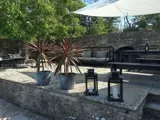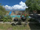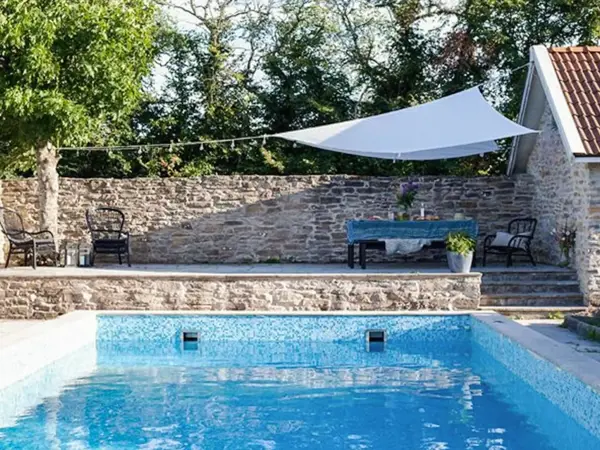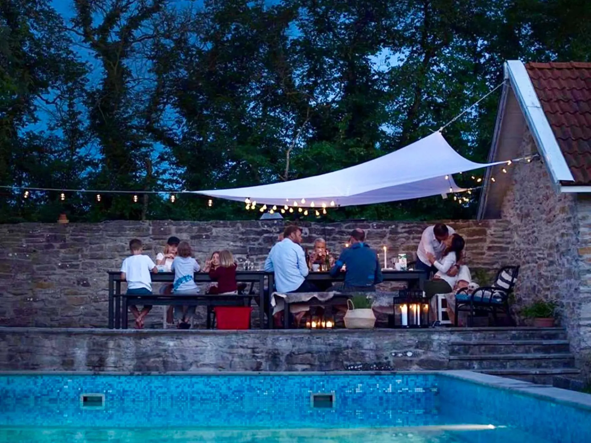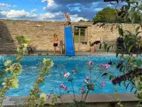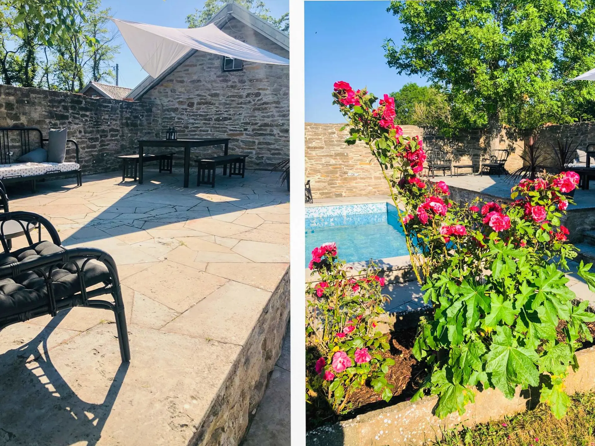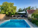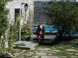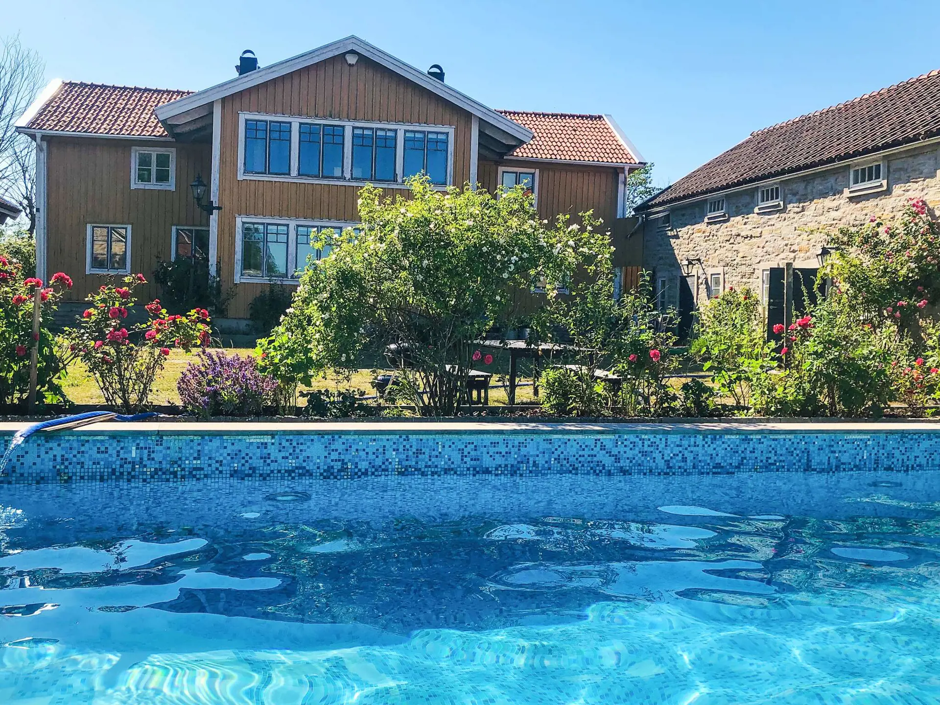 Ein charmanter Innenhof, umrahmt von Stockrosen, Lavendel und Öland-Steinen, umgibt einen blauen Pool und sorgt für eine entspannte Urlaubsatmosphäre. Die Unterkunft umfasst drei separate Wohnungen, ideal für Gruppen, die das Zusammensein und gleichzeitig Privatsphäre genießen möchten. Der Gemeinschaftsgarten verfügt über Essbereiche, Gartenmöbel, Grillplätze und offene Grünflächen mit einem Trampolin.