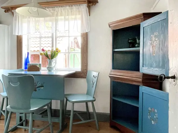Das große Ferienhaus hat einen kleinen Wintergarten, einen großen Gemeinschaftsraum mit einem Tagesbett für zwei, das ausgezogen werden kann, einen Essbereich und einen schönen Kamin zum Anschauen (im Sommer kein Feuer erlaubt!). Dazu gibt es eine kleine Originalküche mit vielen Raritäten.