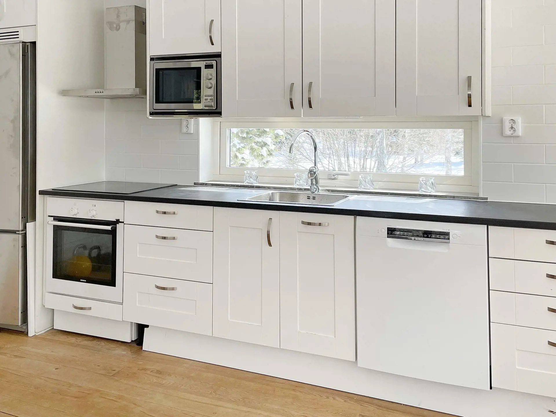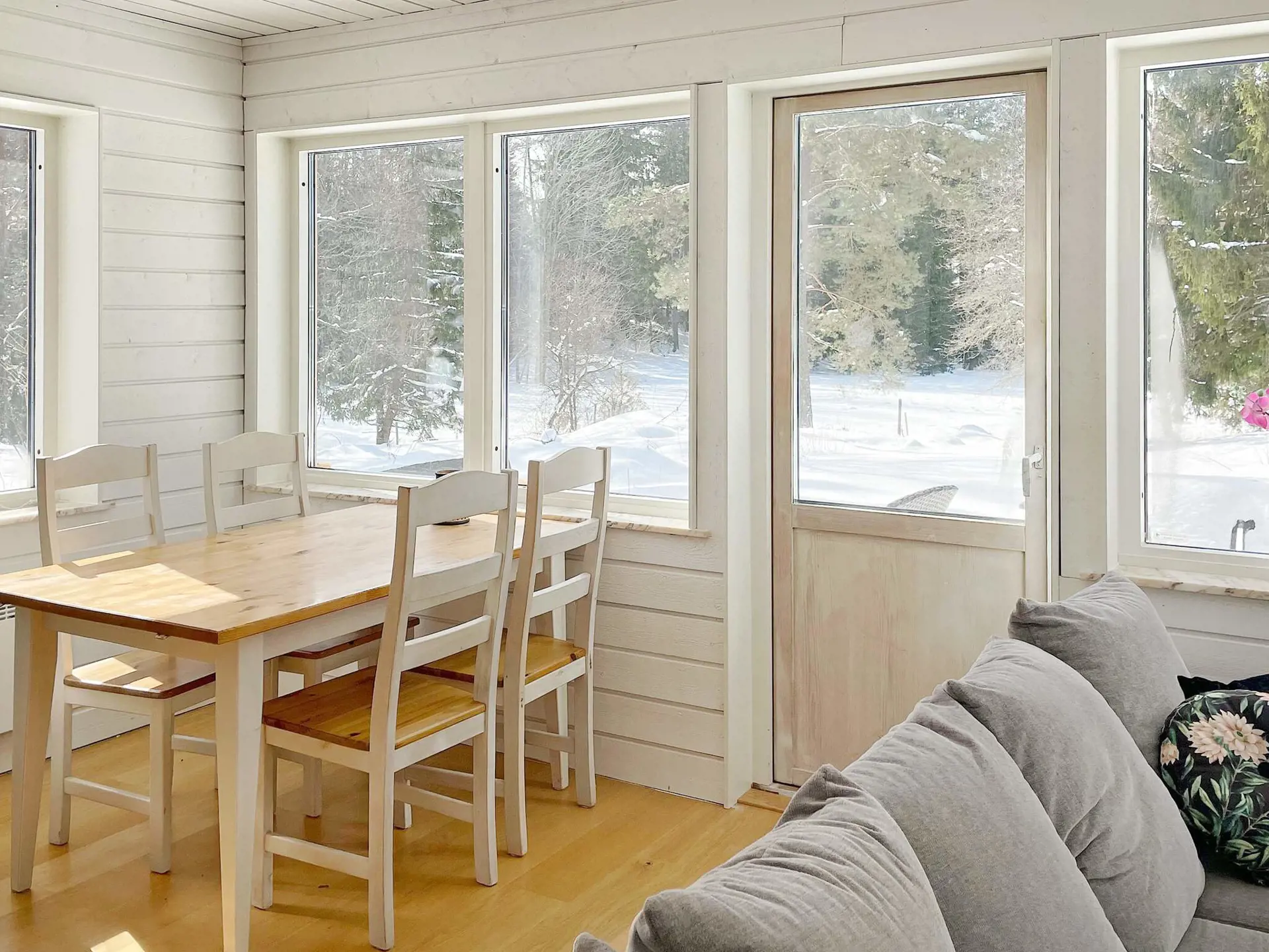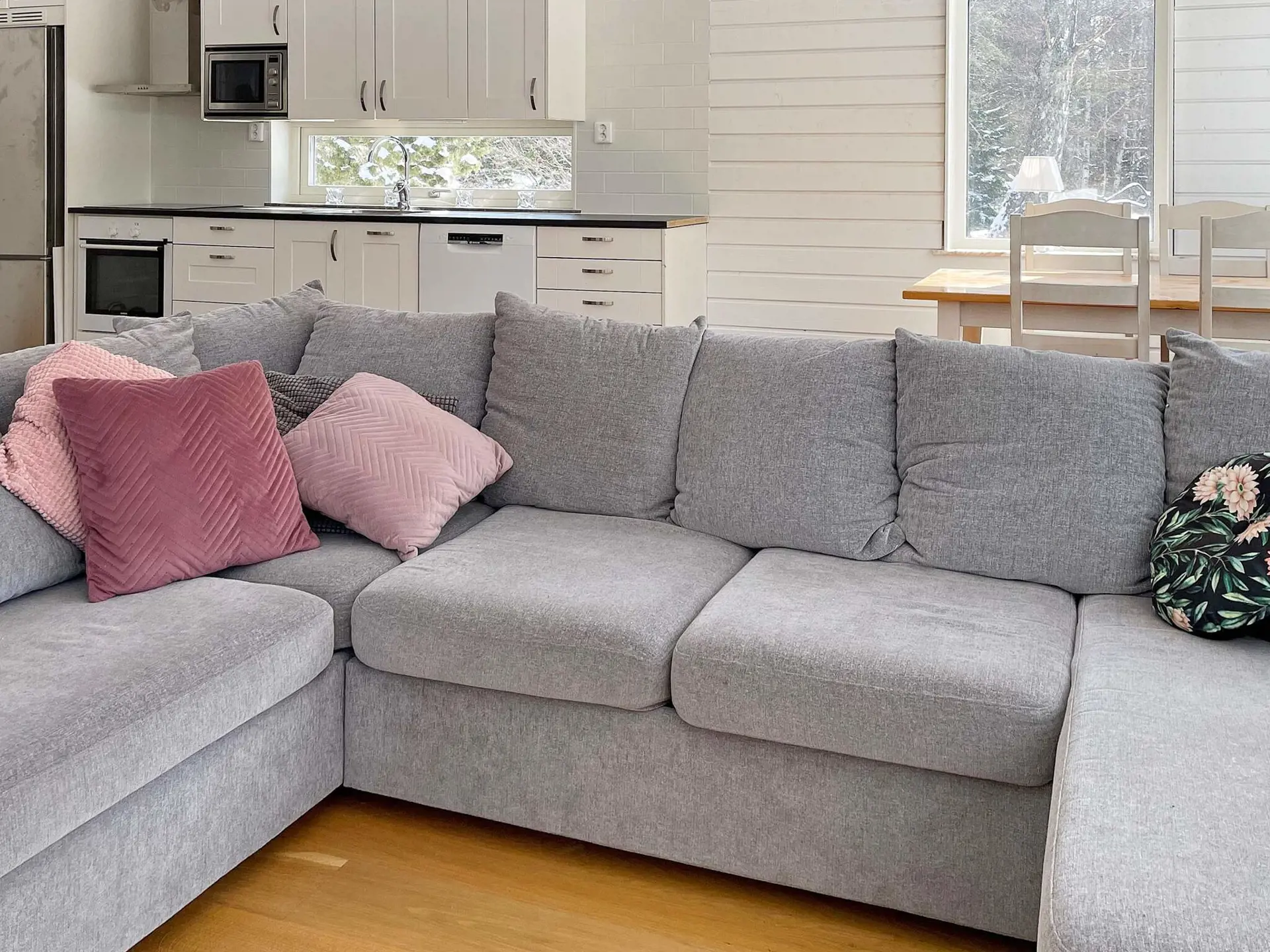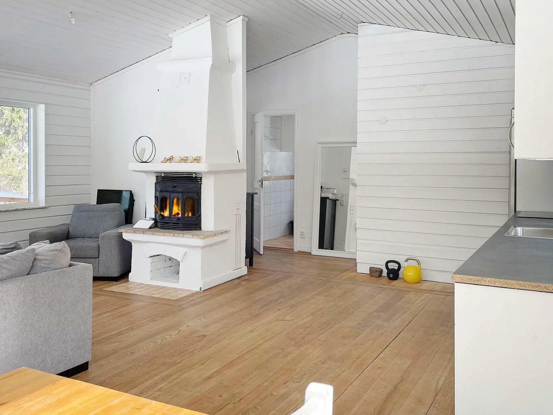 Eine moderne und frische Küche mit allen Annehmlichkeiten wie Geschirrspüler, geräumigem Kühl-/Gefrierschrank, Mikrowelle, ein helles und gemütliches Wohnzimmer mit einem Essbereich für vier Personen und einem großen Sofa erwartet Sie, wenn Sie dieses schöne Haus mit offenem Grundriss betreten . Große Fenster bieten eine herrliche Aussicht, während Sie Ihren Morgenkaffee genießen und die Aktivitäten des Tages planen. Rehe und Elche wurden in der Nähe des Hauses gesichtet und es ist nicht ausgeschlossen, dass Sie auch den König des Waldes am Waldrand beobachten werden.