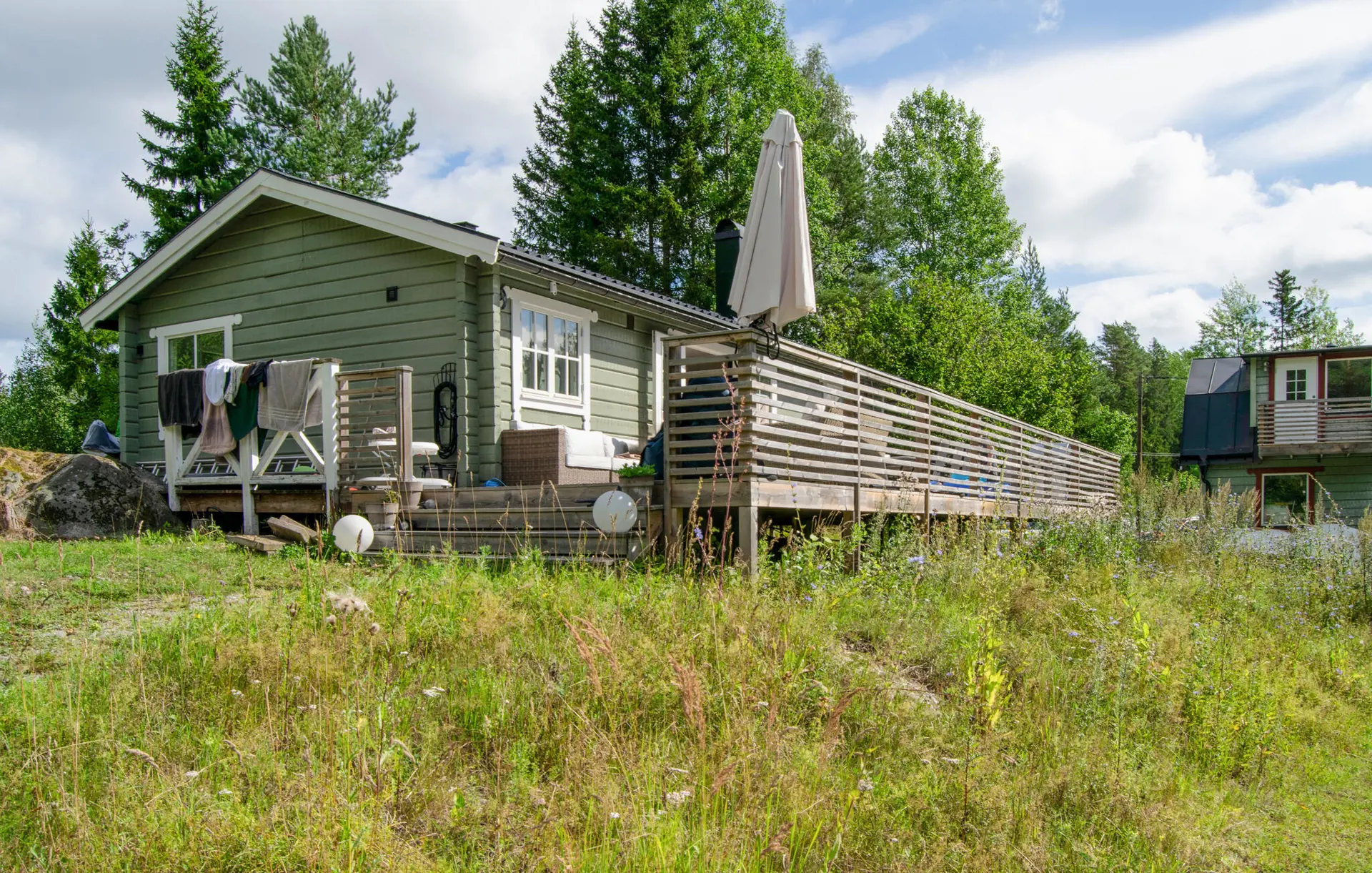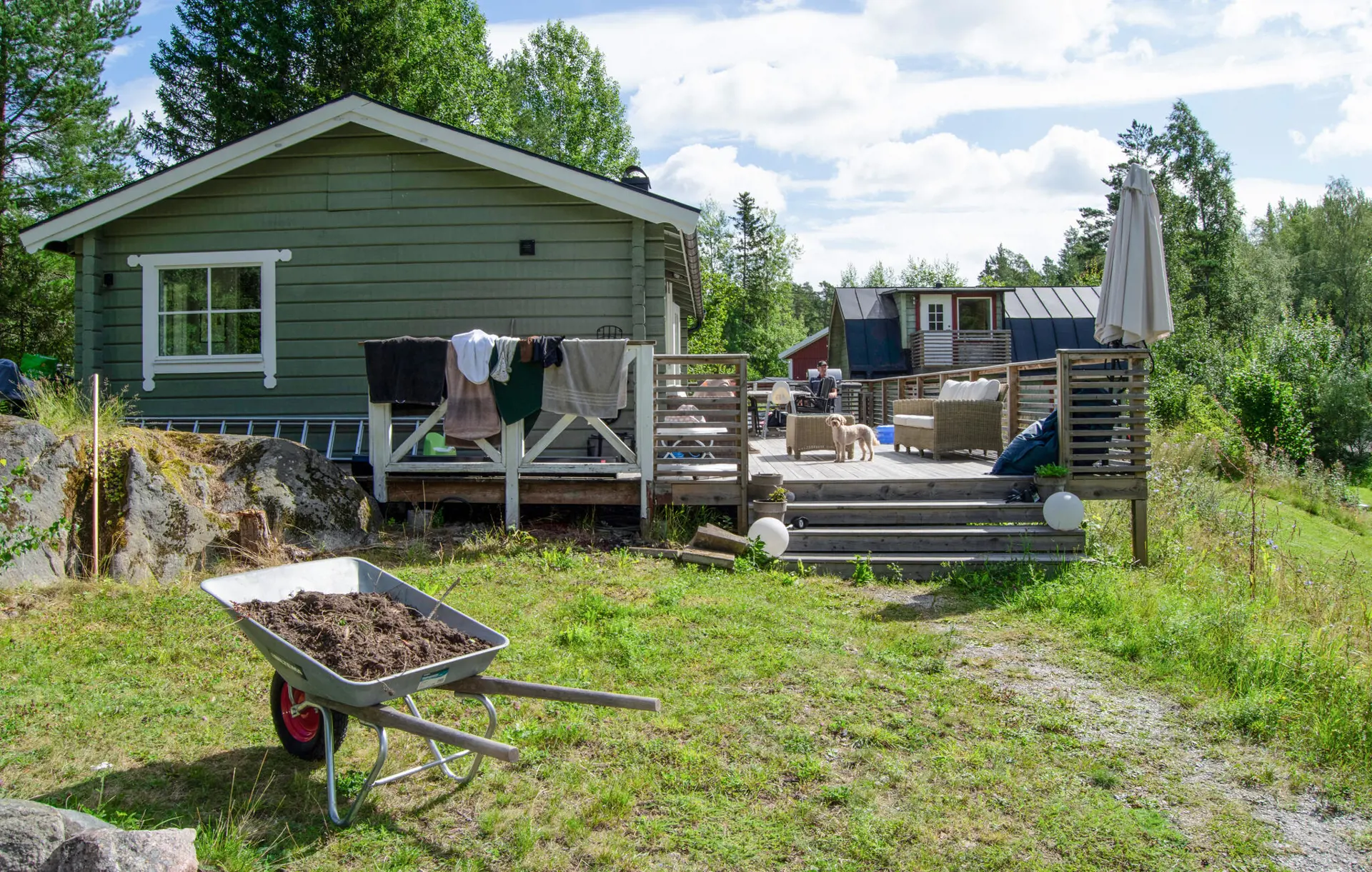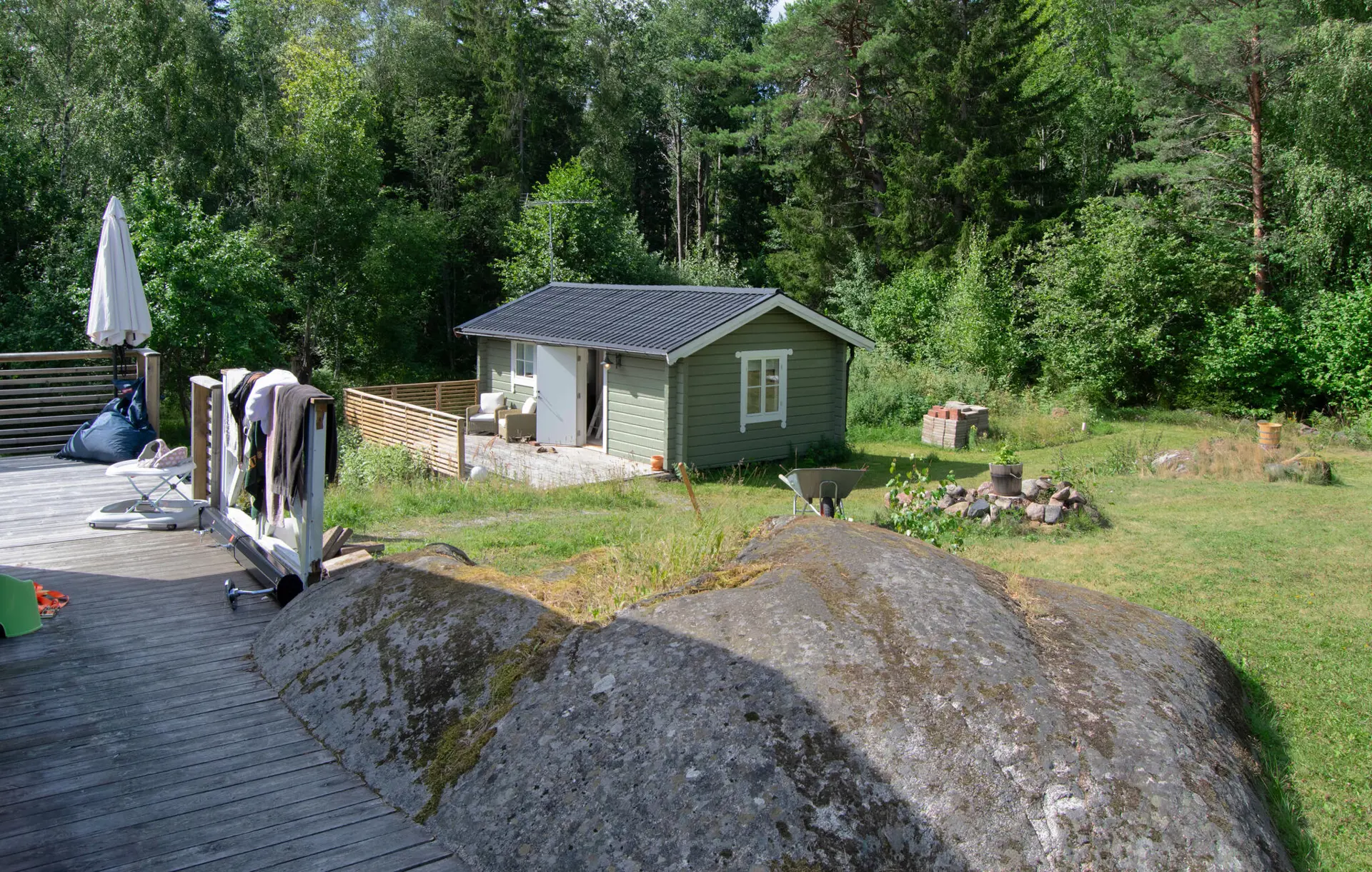 Treten Sie hinaus auf die großzügige Holzterrasse und lassen Sie den Blick über das Grundstück schweifen. Sitzen Sie in der Sonne, lesen Sie ein Buch oder genießen Sie den Abend bei einem Glas Wein. Der Garten mit Wiese, Felsen und Bäumen vermittelt das Gefühl, mitten in der Natur zu leben. Ein kleiner Anbau bietet zusätzlichen Platz.
