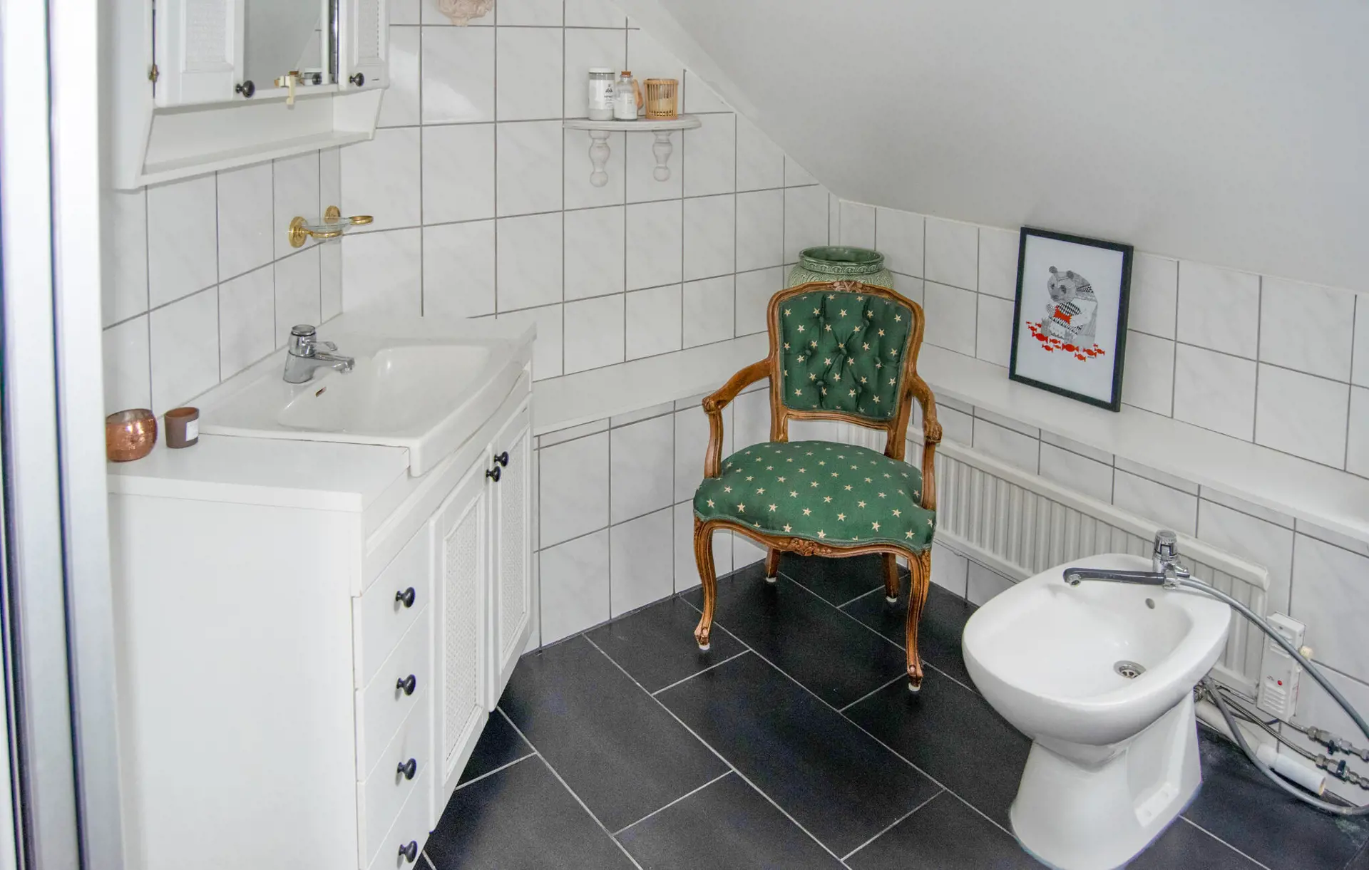 Betreten Sie den großzügigen Wohnbereich und machen Sie es sich am Esstisch gemütlich. Die offene Gestaltung mit sichtbaren Balken und den weiten Fensterflächen verleiht dem Raum eine luftige Atmosphäre. Setzen Sie sich in die Sofaecke und genießen Sie die Ruhe oder einen Filmabend. Nutzen Sie die Küche mit ihren langen Arbeitsflächen und dem Essplatz am Fenster, um Ihre Mahlzeiten komfortabel vorzubereiten und zu servieren. Der Kaminofen mit seiner markanten Natursteinwand sorgt zusätzlich für wohltuende Wärme.