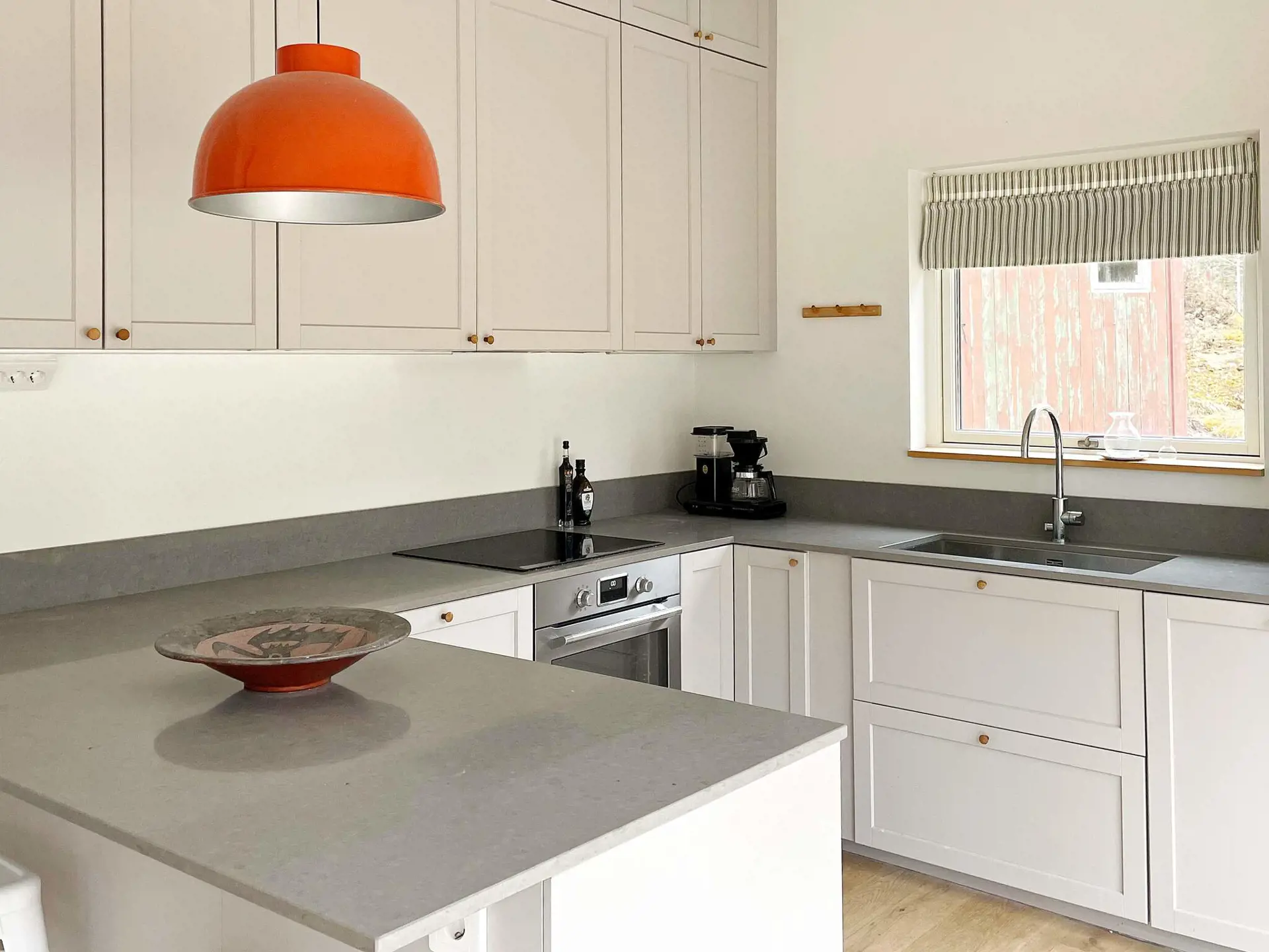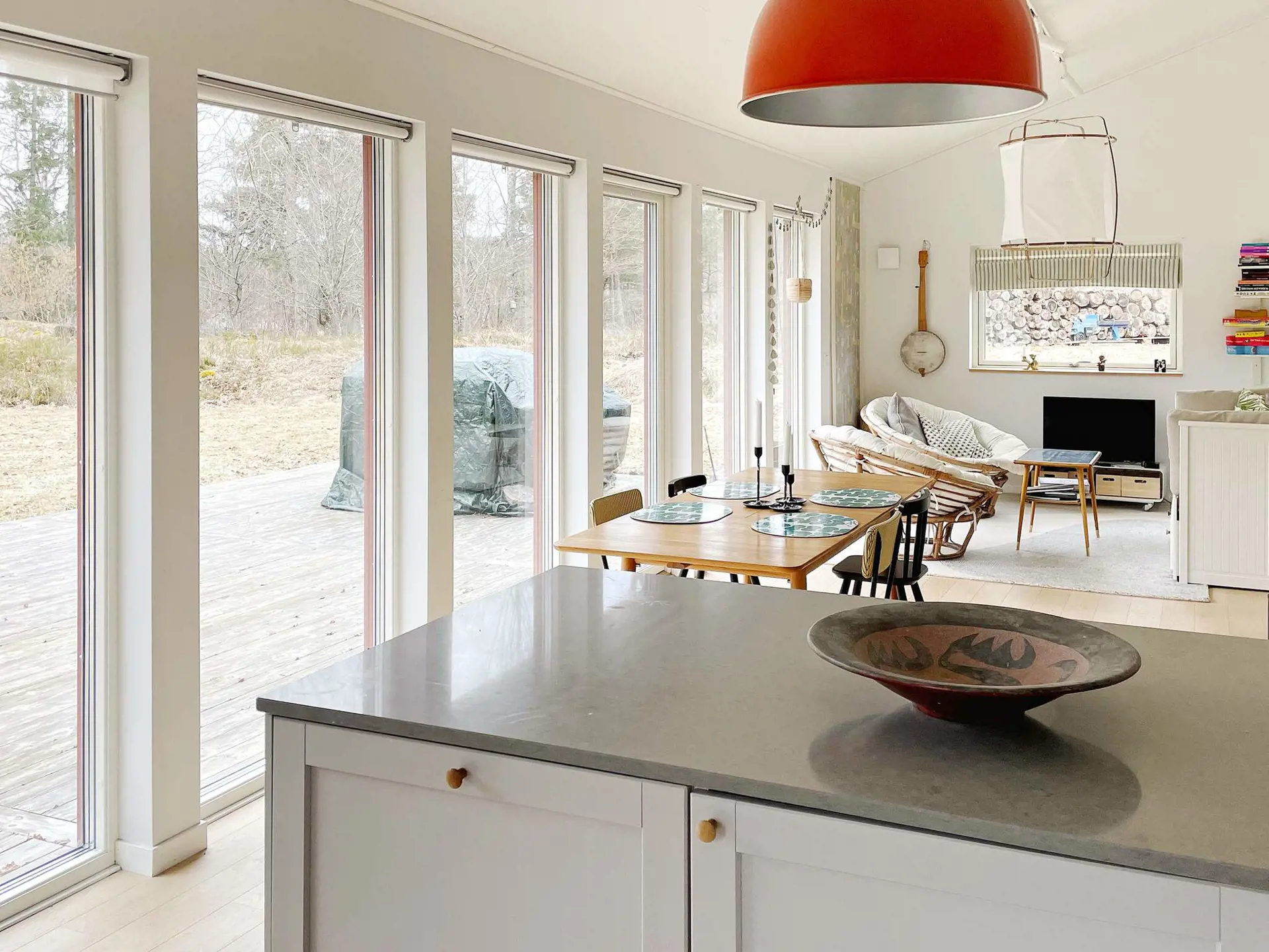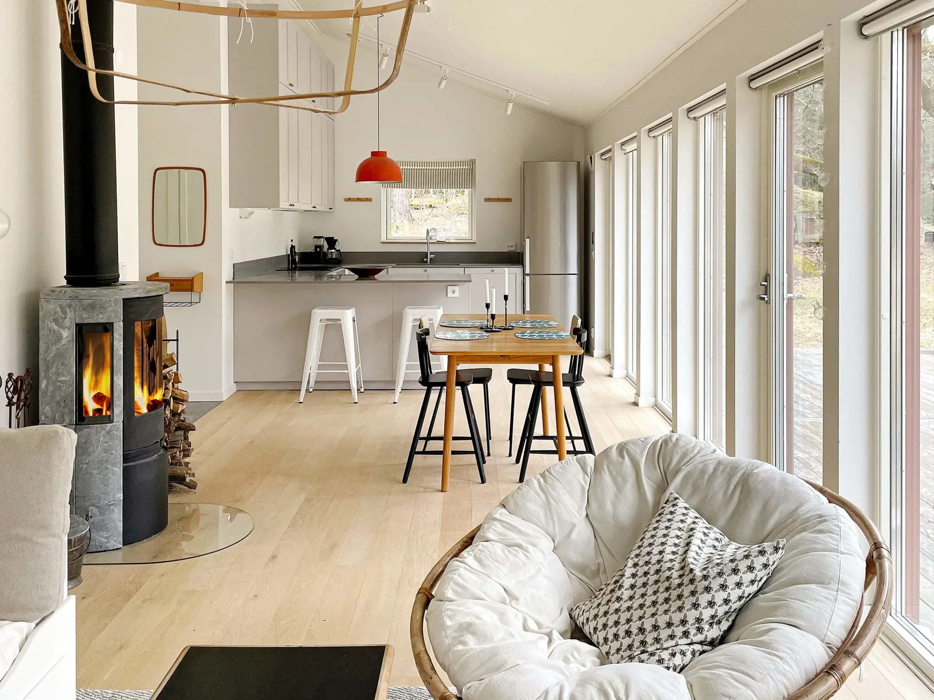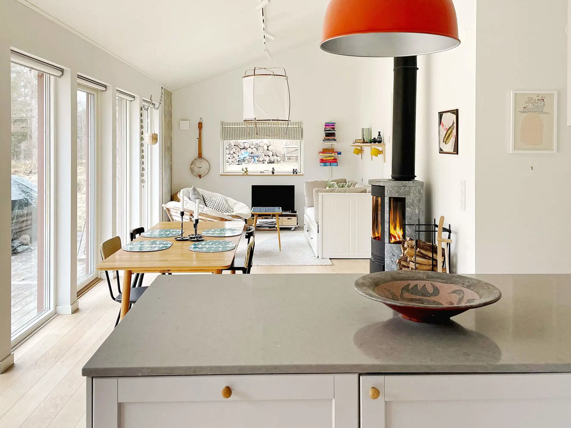 Sie wohnen in einem 2020 erbauten Ferienhaus mit großzügiger Deckenhöhe und großen Fenstern, die ein schönes Gefühl von Weite und Nähe zur Außenumgebung vermitteln. Offene Raumaufteilung zwischen Küche und Wohnzimmer, mit einem Essbereich und einem schönen Kamin in der Mitte des Raumes. Zugang zu einer großen Terrasse, wo Sie die Sonne genießen oder sich im Schatten unter der Markise abkühlen können. Hier finden Sie Gartenmöbel und einen Holzkohlegrill vor, perfekt für gemütliche Abendessen mit Blick auf den schönen Naturgarten mit Rasen und Spielgeräten, die zum Spielen einladen!