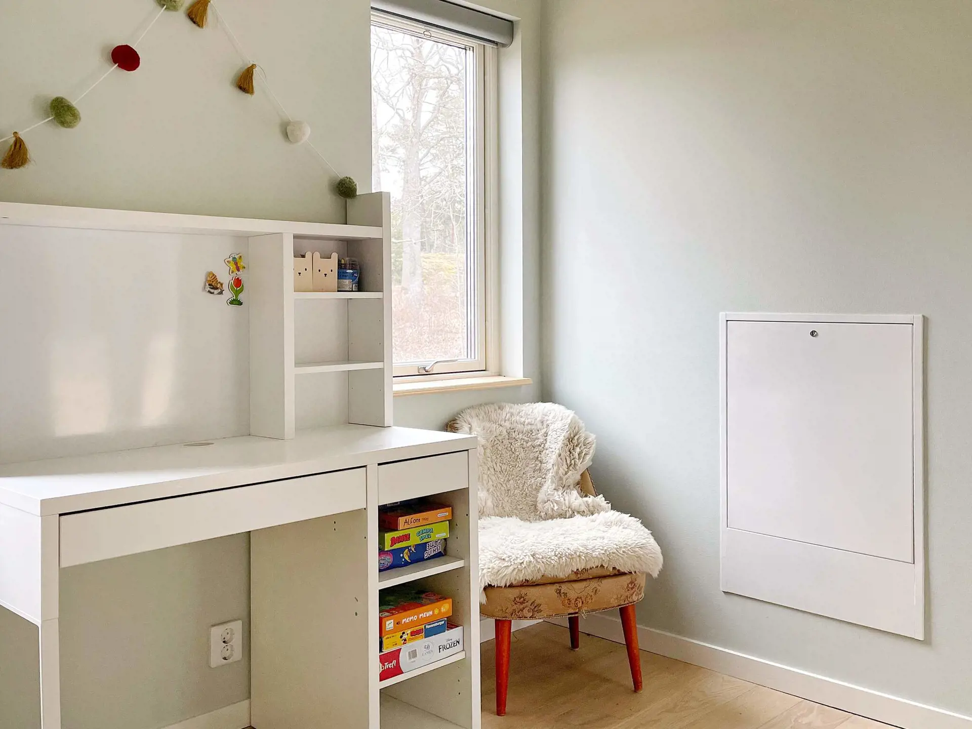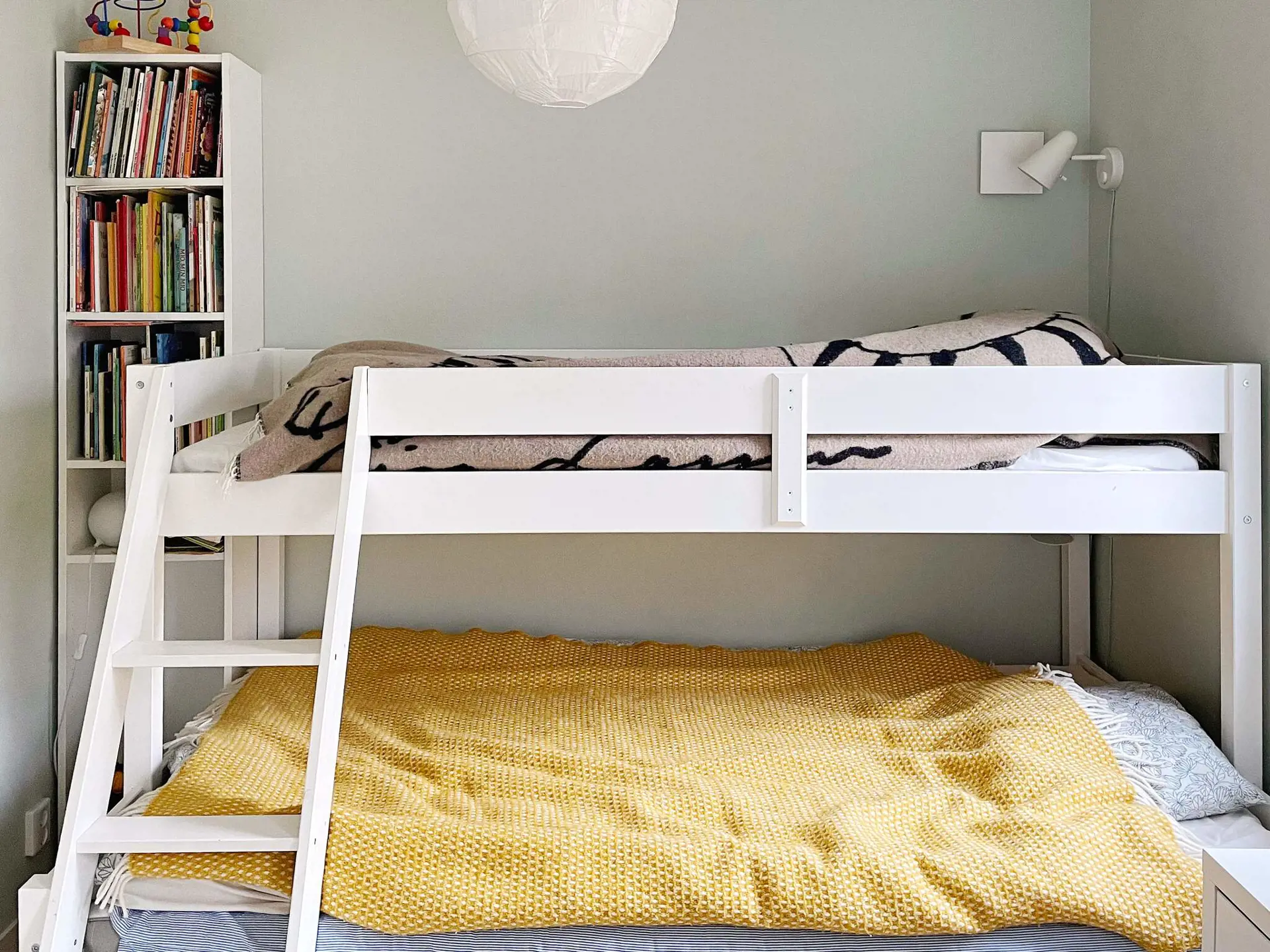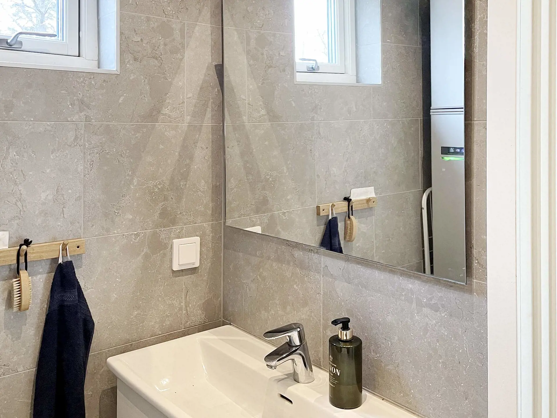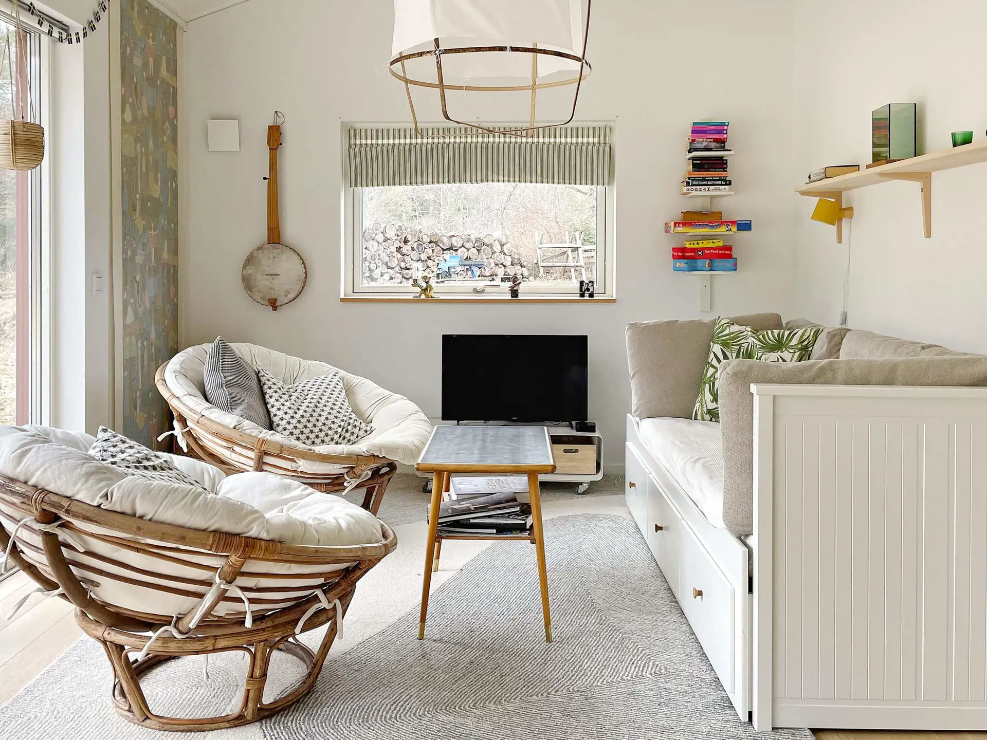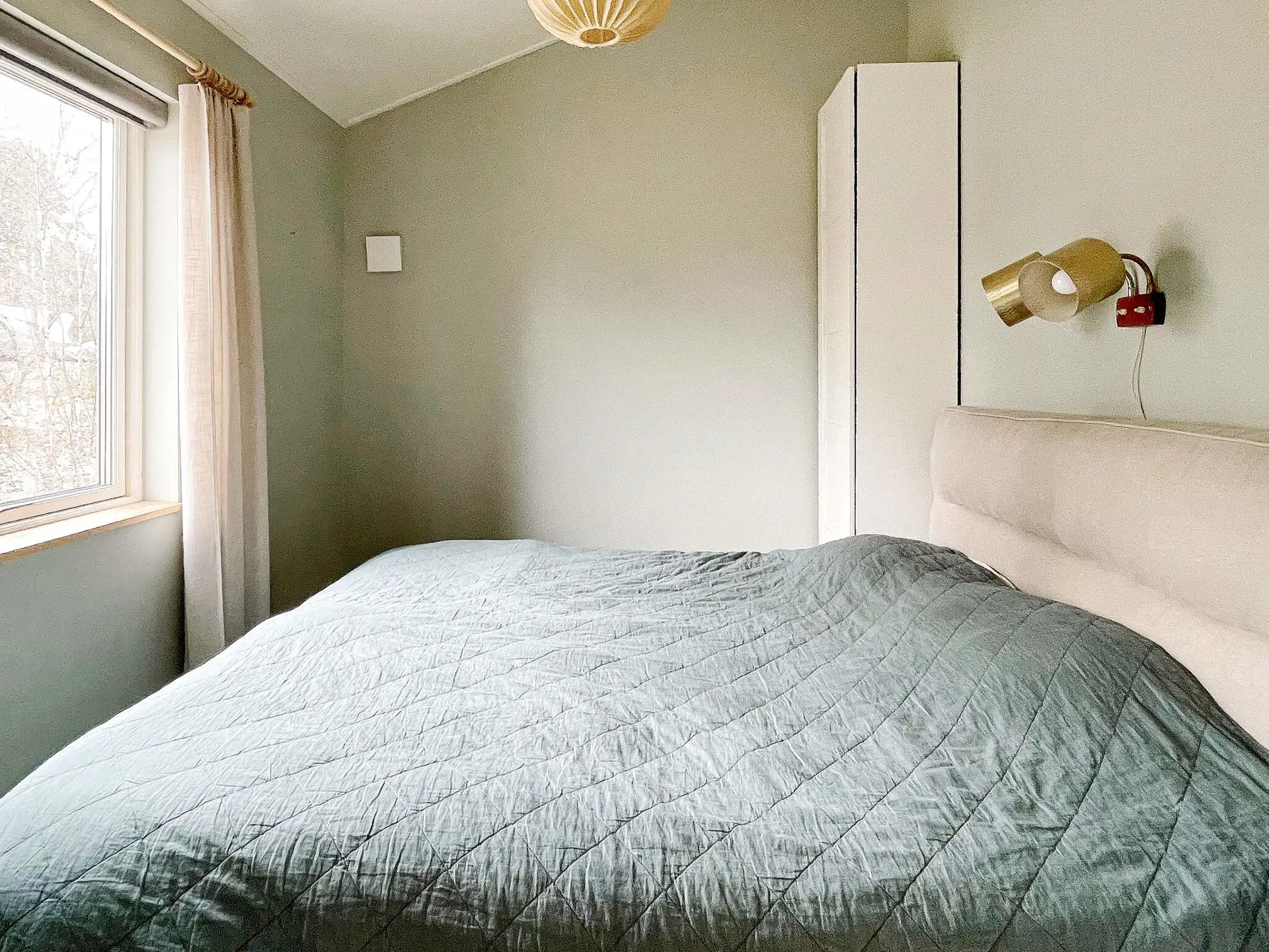 Das Ferienhaus verfügt über zwei Schlafzimmer; eines mit Doppelbett und Stauraum im Kleiderschrank, das andere mit Familien-Etagenbett, dessen untere Liegefläche breiter ist (120 cm) als oben. Im Wohnzimmer gibt es ein Schlafsofa für zwei Personen sowie einen Fernsehbildschirm mit der Möglichkeit, von Ihrem eigenen Handy zu streamen. Stilvolles Badezimmer mit einer schönen Deckenhöhe, ausgestattet mit Toilette, Waschbecken, Dusche und Waschmaschine.