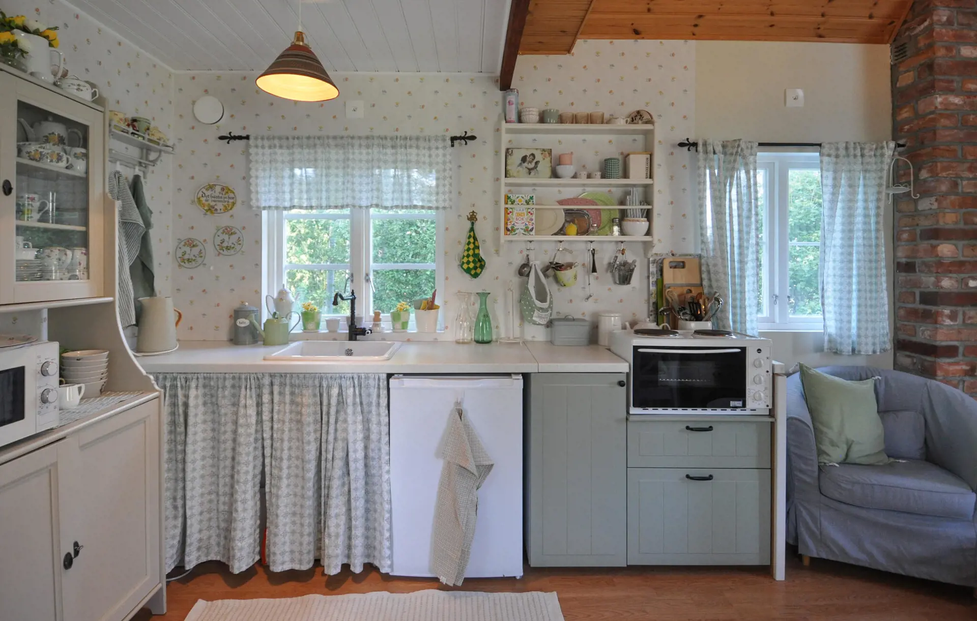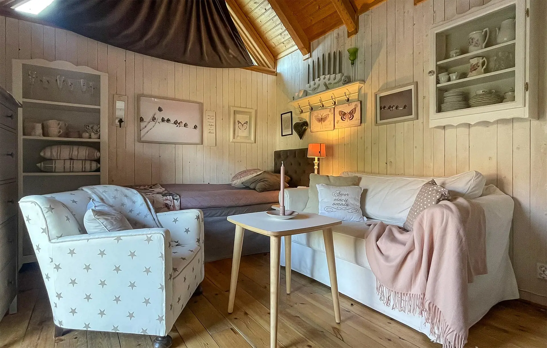 Genießen Sie die Ruhe und lassen Sie den Alltag hinter sich. Entdecken Sie die heimelige Atmosphäre in Ihrem Holzhaus, das mit viel Liebe zum Detail eingerichtet ist. Erleben Sie den gemütlichen Innenbereich mit heller Landhausküche, bequemen Sitzgelegenheiten und einem einladenden Essplatz. Nutzen Sie die Küche für gemeinsame Mahlzeiten und machen Sie es sich anschließend im Wohnbereich mit Sofa und Sesseln bequem.