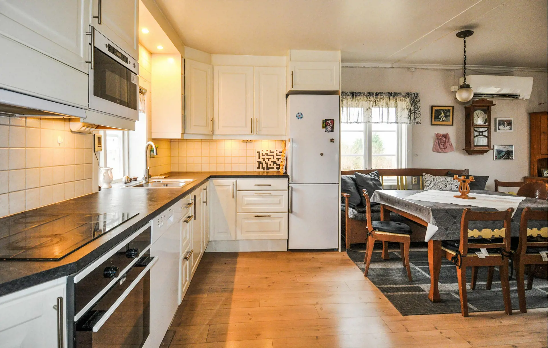 Genießen Sie die Gelassenheit des Landlebens und entdecken Sie die Schönheit Westvärmlands. Ihr Ferienhaus liegt umgeben von weiten Wiesen, Wäldern und Hügeln und ist der ideale Ort, um dem Alltag zu entfliehen und neue Energie zu tanken. Machen Sie es sich im gemütlichen Wohnzimmer mit Sesseln, Sofa und Holzboden bequem. Die Einrichtung im traditionellen Stil sorgt für ein wohliges Ambiente. Kochen Sie gemeinsam in der modern ausgestatteten Küche mit viel Platz und genießen Sie Ihre Mahlzeiten in der großen Essecke mit Blick nach draußen. Entdecken Sie die liebevollen Details, die das Haus so besonders machen, und gönnen Sie sich entspannte Stunden mit einem spannenden Buch oder lustigen Spielen.