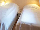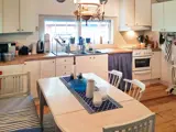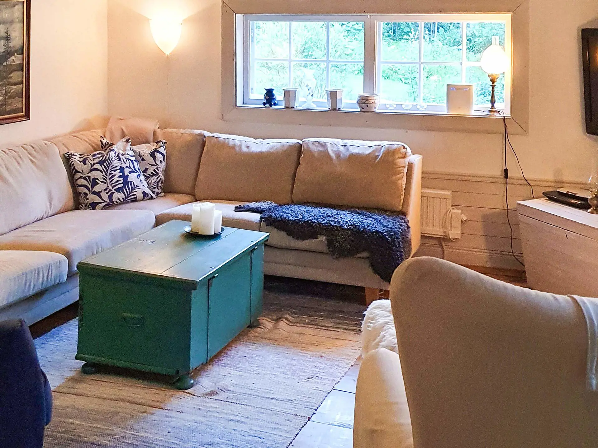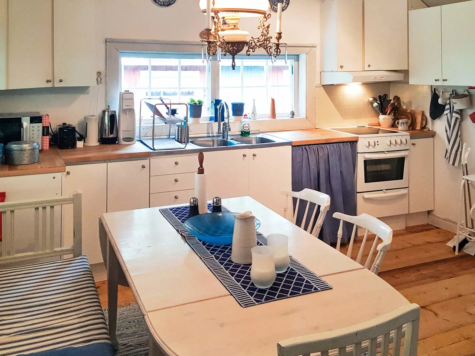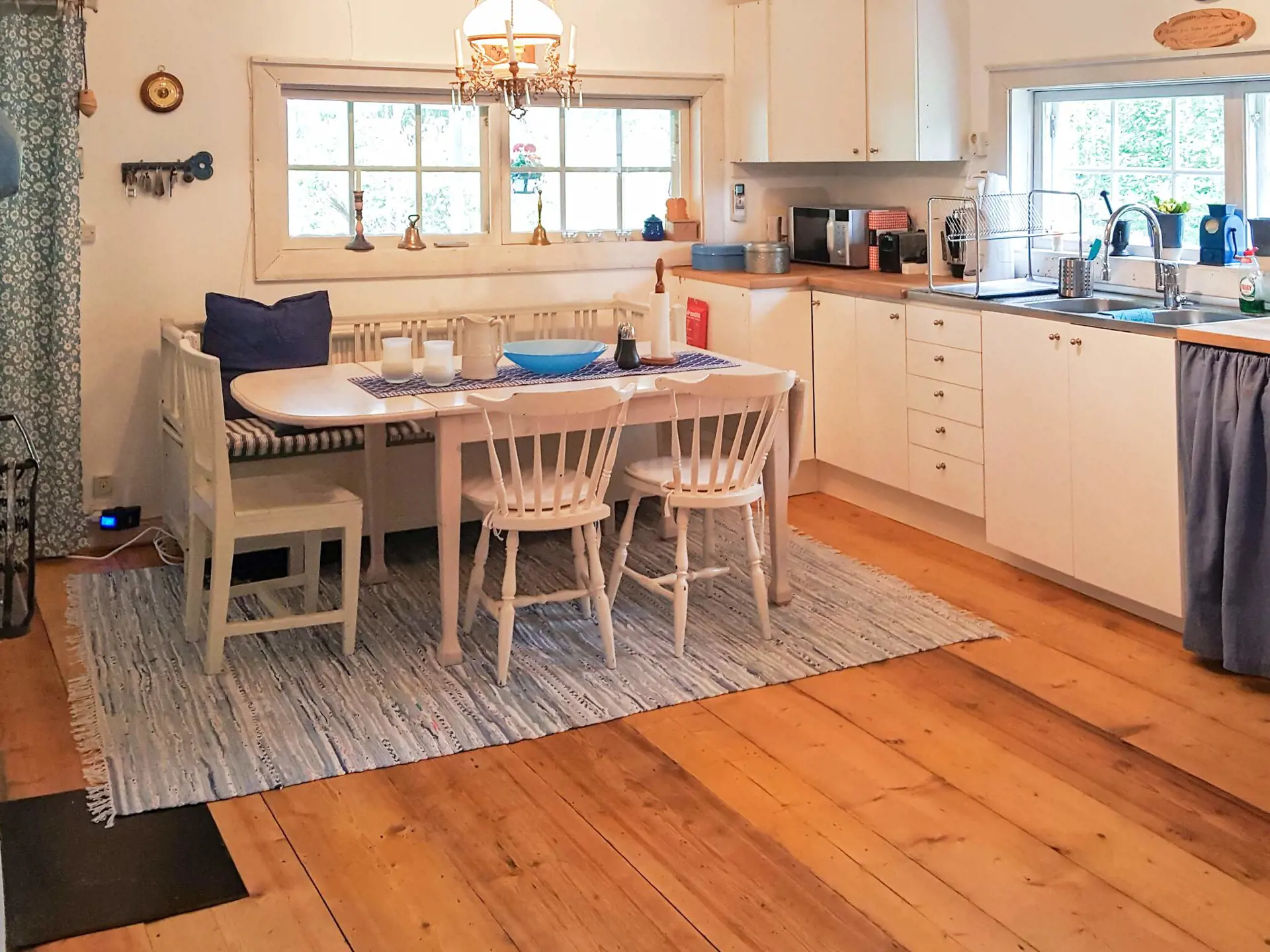 Im Inneren des Ferienhauses finden Sie eine geräumige und gut ausgestattete Küche mit Essecke und einem gusseisernen Ofen, der an kühlen Tagen angenehme Wärme verbreitet. Das Wohnzimmer verfügt über eine gemütliche Sitzecke und einen Kamin, hier kann man sich nach einem Tagesausflug wunderbar entspannen. Im Haus gibt es zwei Schlafzimmer, davon ein Zimmer mit Doppelbett und das andere Zimmer mit zwei Einzelbetten. Dazu steht in einem Durchgangszimmer ein Schlafsofa. Es gibt auch ein Badezimmer mit Dusche und WC.