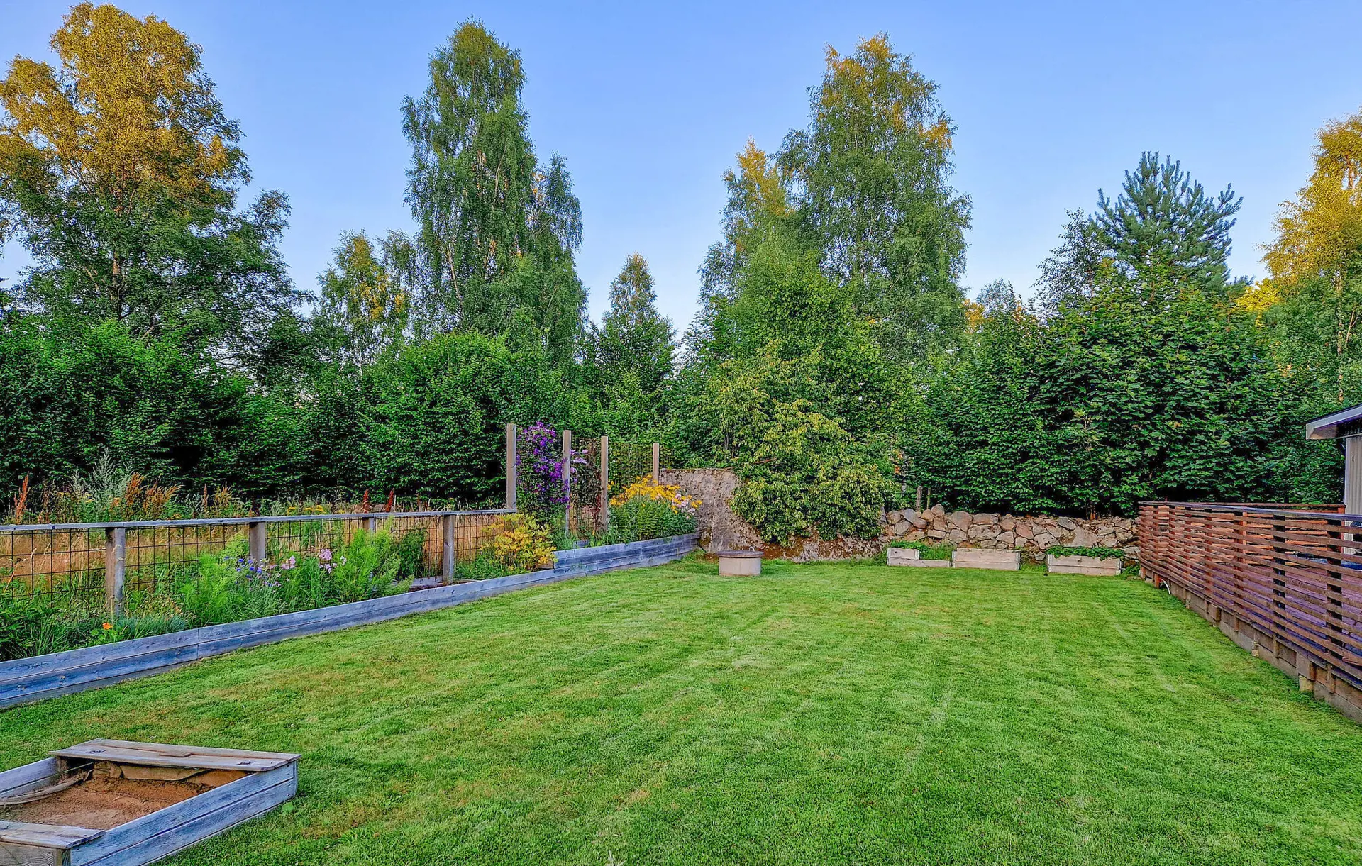 Das große grüne Grundstück lädt zu jeder Tageszeit zum Verweilen ein. Treten Sie morgens mit einer Tasse Kaffee auf die Terrasse und frühstücken Sie ausgiebig im Freien, während Sie Ihre Pläne für den kommenden Tag schmieden. Lassen Sie Ihre Seele baumeln und genießen Sie die Stille der Natur. Versammeln Sie abends die Familie oder Freunde beim Grillen und lassen Sie den Tag entspannt ausklingen.