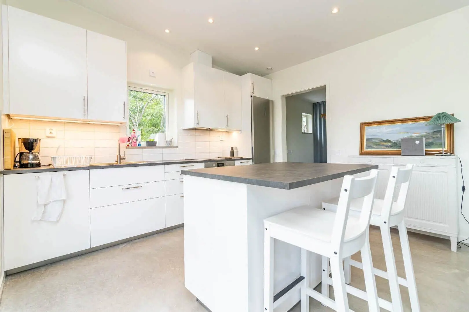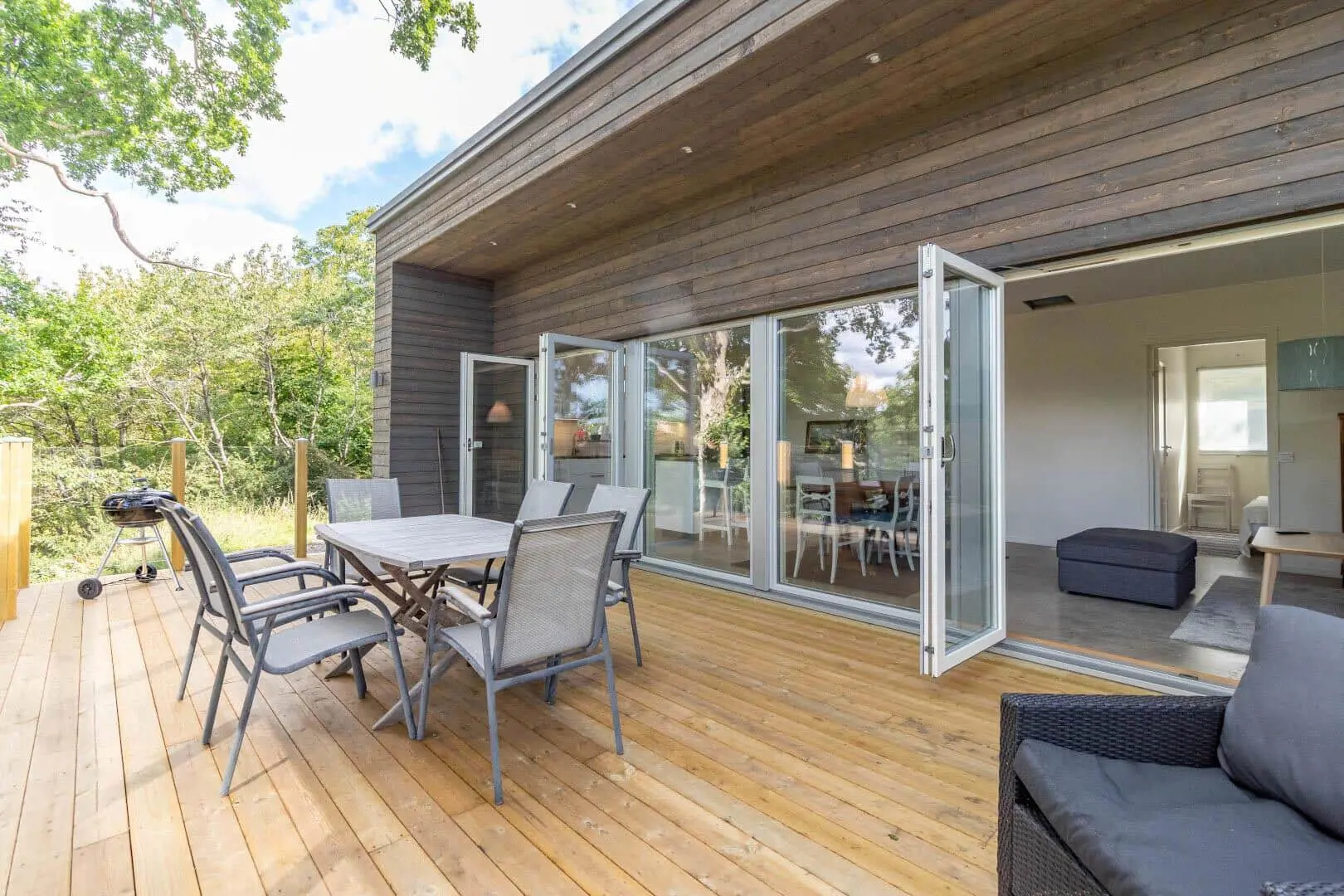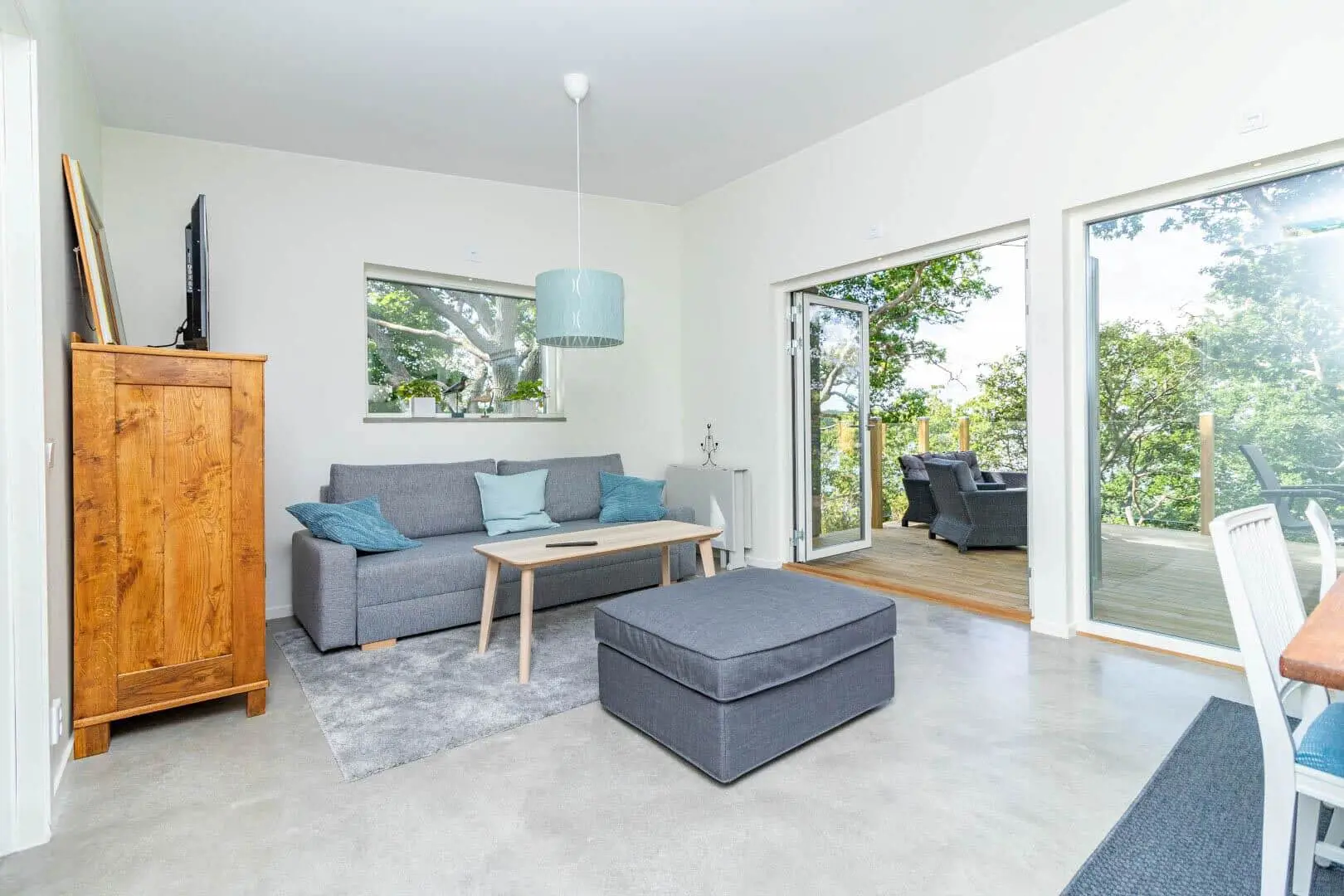 Das Haus verfügt über etwa 65 m² Wohnfläche und bietet Platz für 6 Personen. Im Eingangsbereich begrüßt dich ein kleiner Flur mit Garderobe. Gleich daneben liegt das Badezimmer mit WC, Dusche, Waschmaschine und Trockner. Herzstück des Hauses ist der offene Wohn-, Ess- und Küchenbereich: Die Küche ist modern ausgestattet mit Induktionskochfeld, Spülmaschine, Kühl-Gefrierkombination und Kaffeemaschine. Am Esstisch kannst du gemeinsam essen, während der Wohnbereich mit ausziehbarem Schlafsofa und Smart-TV zum Entspannen einlädt. Zwei Schlafzimmer schließen sich an – eines mit Doppelbett, das andere mit einem Etagenbett. Große Fenster und zwei Terrassentüren lassen viel Licht herein und führen direkt hinaus auf die Terrasse mit Blick zur Ostsee. Dort stehen dir Loungemöbel, Gartenmöbel und ein kleiner Weber-Grill zur Verfügung. Fußbodenheizung sorgt im ganzen Haus für angenehme Wärme, und dank WLAN bist du jederzeit online.