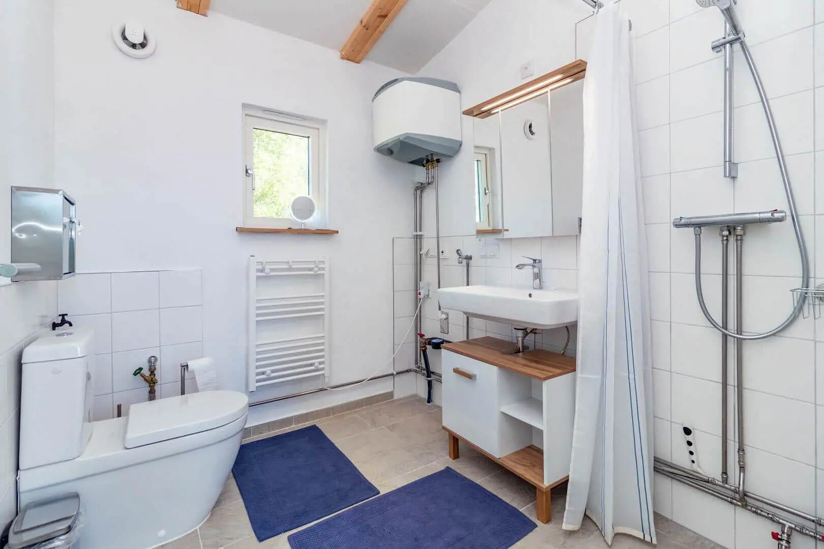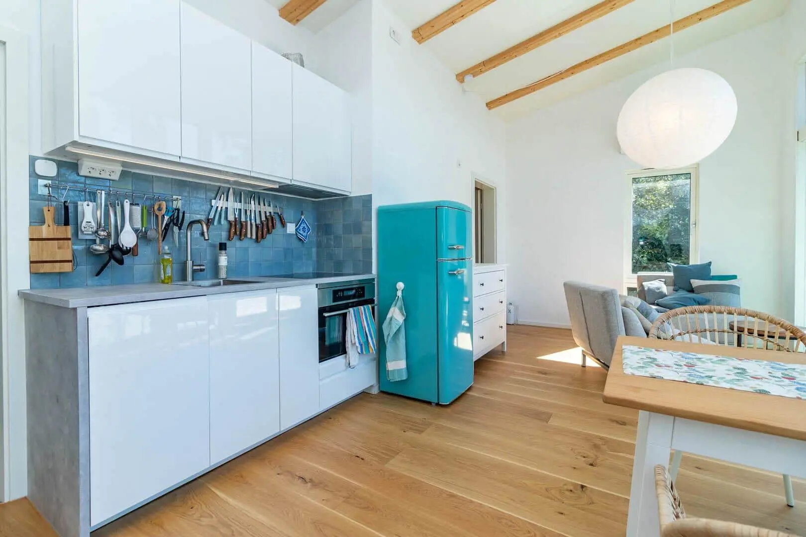 Im offenen Wohn- und Küchenbereich findest du alles, was du für den täglichen Komfort brauchst: ein 4-Platten-Induktionskochfeld mit Backofen, Dunstabzugshaube, Kühlschrank mit Gefrierfach, Spülmaschine und Kaffeemaschine. Das Schlafzimmer ist mit einem Doppelbett ausgestattet, das Badezimmer verfügt über Dusche und WC.