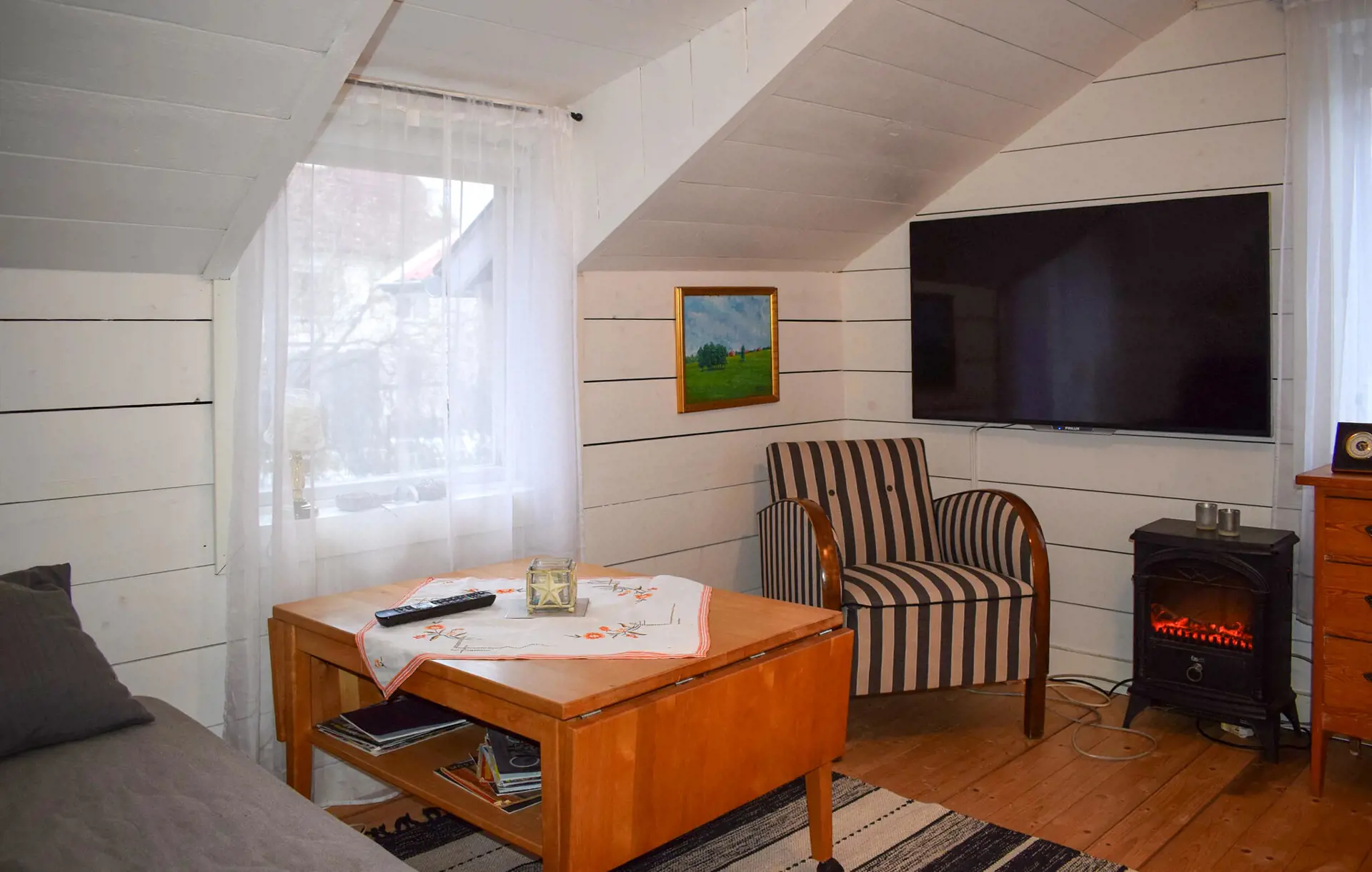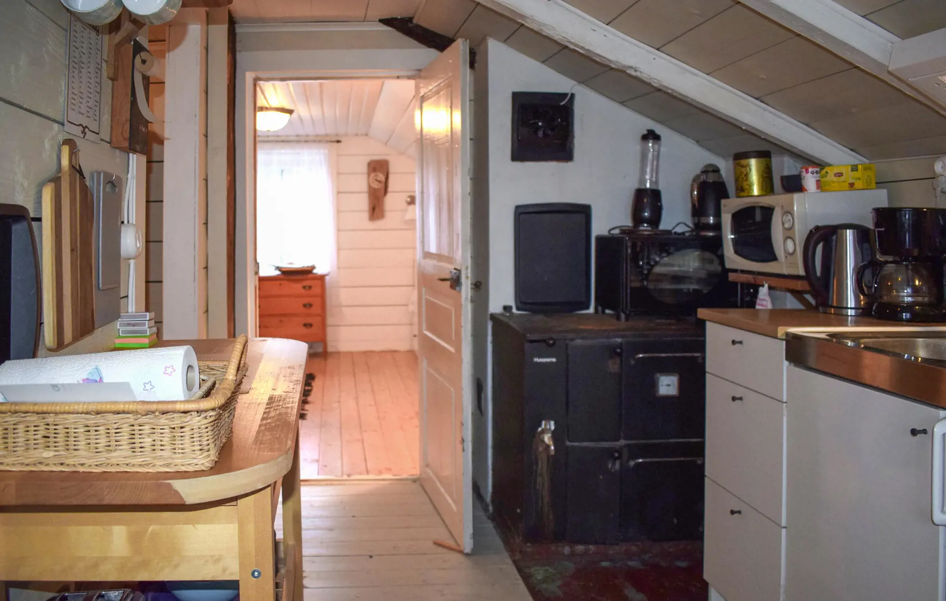 Treten Sie ein in Ihr kompaktes Holzhaus und genießen Sie die gemütliche Atmosphäre unter dem schrägen Dach. Nehmen Sie auf dem Sofa Platz oder lehnen Sie sich im Sessel zurück. Verbringen Sie hier entspannte Abende vor dem Fernseher oder planen Sie Ihre Ausflüge. Die offene Küche präsentiert sich funktional und rustikal zugleich.