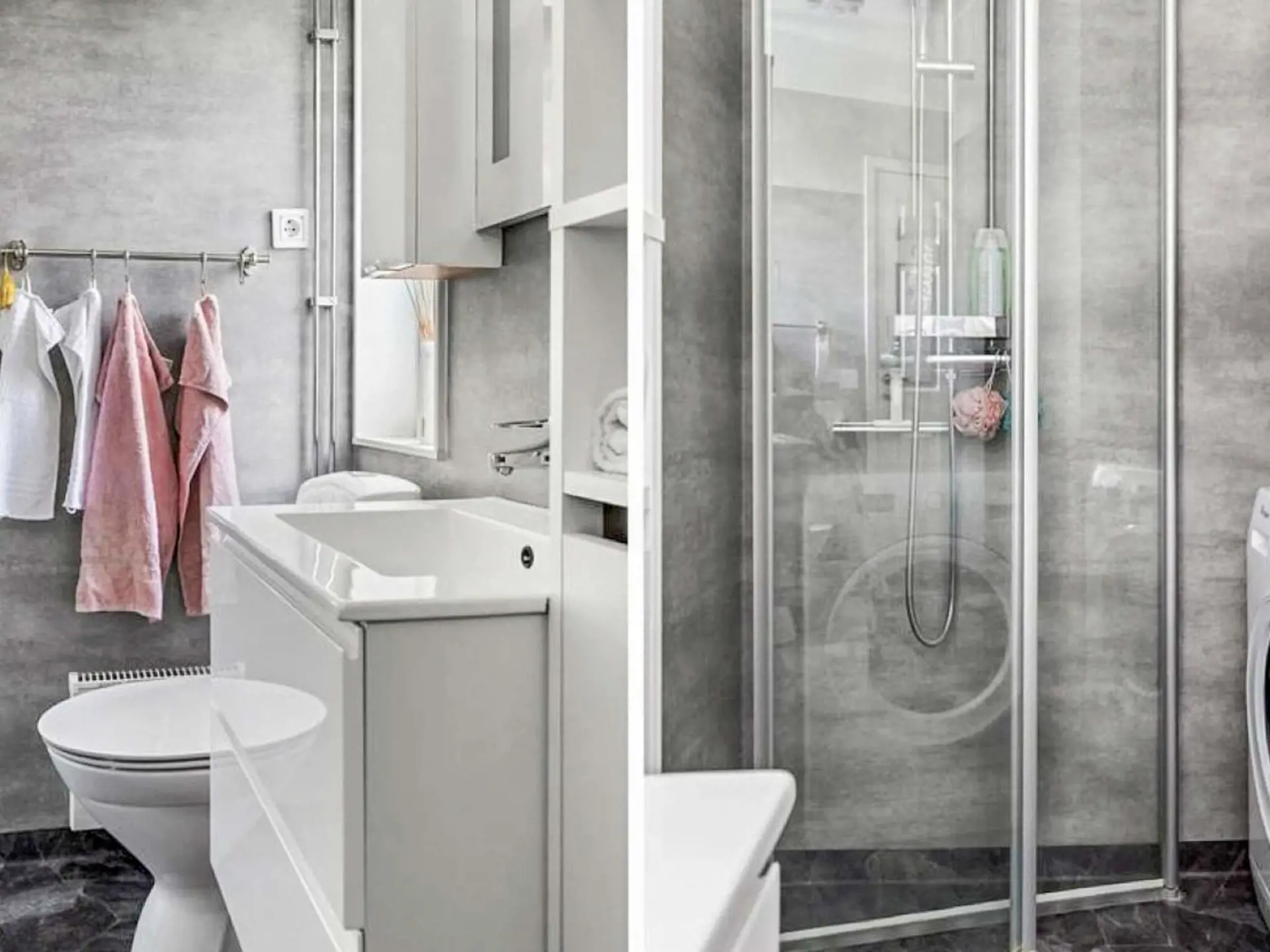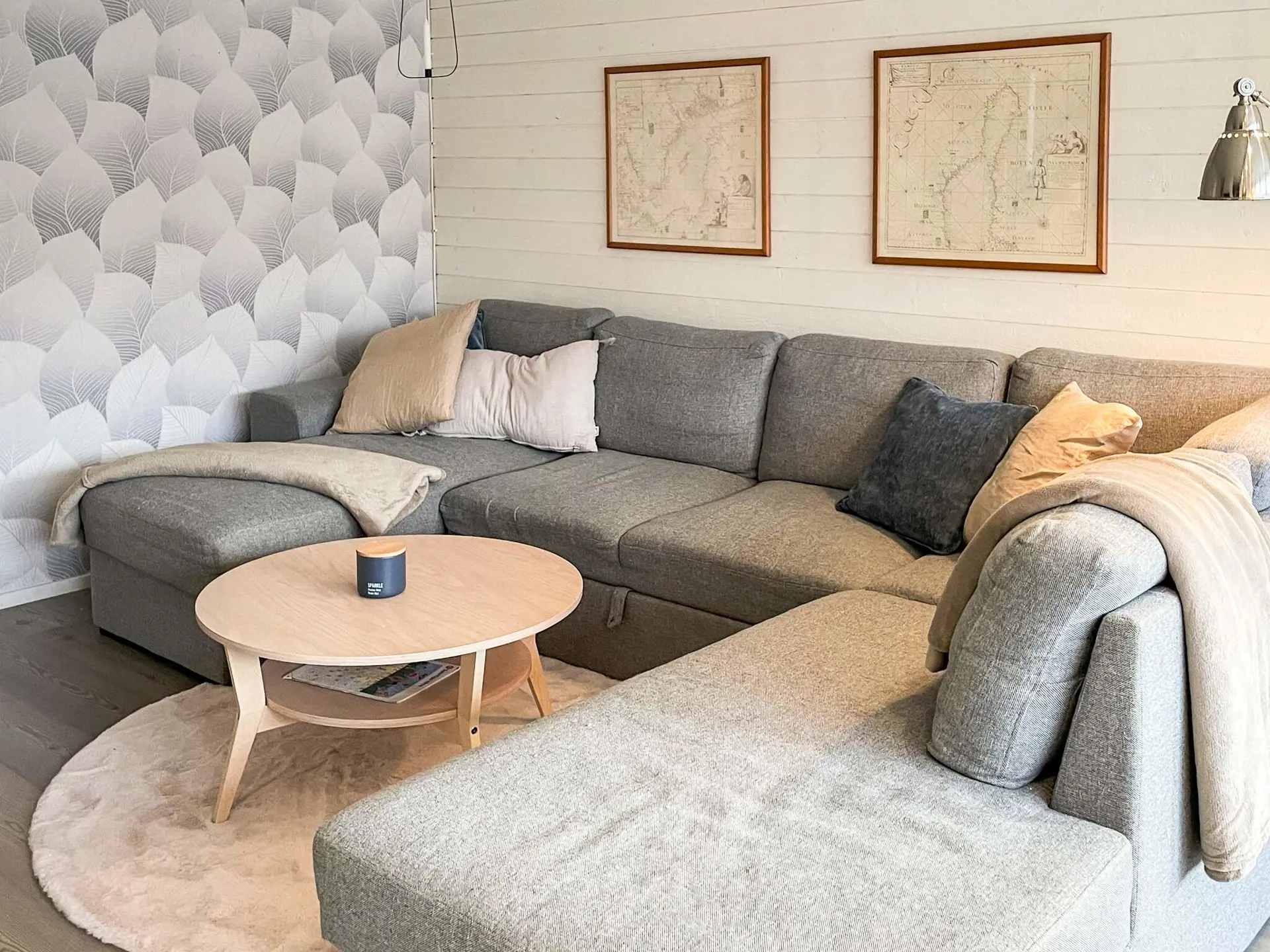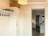 Durch ein Tor im Zaun, der auf beiden Seiten des Hauses verläuft, erreichen Sie den Eingang an der Vorderseite des Hauses. Der geräumige Flur führt Sie in die voll ausgestattete Küche mit Kücheninsel. Offener Grundriss mit Sofa, das als Bett für zwei Personen vor dem Fernseher mit Chromecast verwendet werden kann. Essbereich um einen Tisch mit Stühlen. Die großen Fenster sorgen für angenehmes Licht und Ausblicke über große Teile der Terrasse. Es gibt auch zwei Schlafzimmer; eines mit einem Doppelbett, das andere mit einem 120 cm langen Einzelbett. Das helle Badezimmer verfügt neben einem Waschbecken und einer Toilette über eine Dusche und eine Waschmaschine.