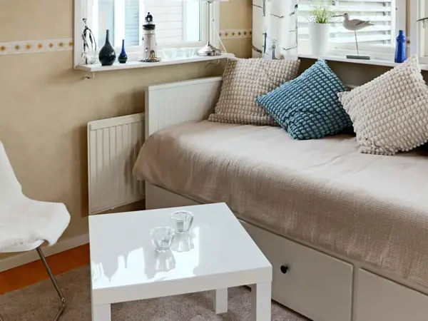 Die Hütte verfügt über ein Wohnzimmer mit einem Schlafsofa für zwei Personen und eine gut ausgestattete Küchenzeile. Wasserversorgung per Kanister. Es gibt einen kleinen Esstisch und einen modernen Fernseher. Der Schlafbereich verfügt über ein Etagenbett. Auf der schönen Terrasse gibt es Gartenmöbel und einen Grill. Keine Vermietung an Jugendliche erwünscht!