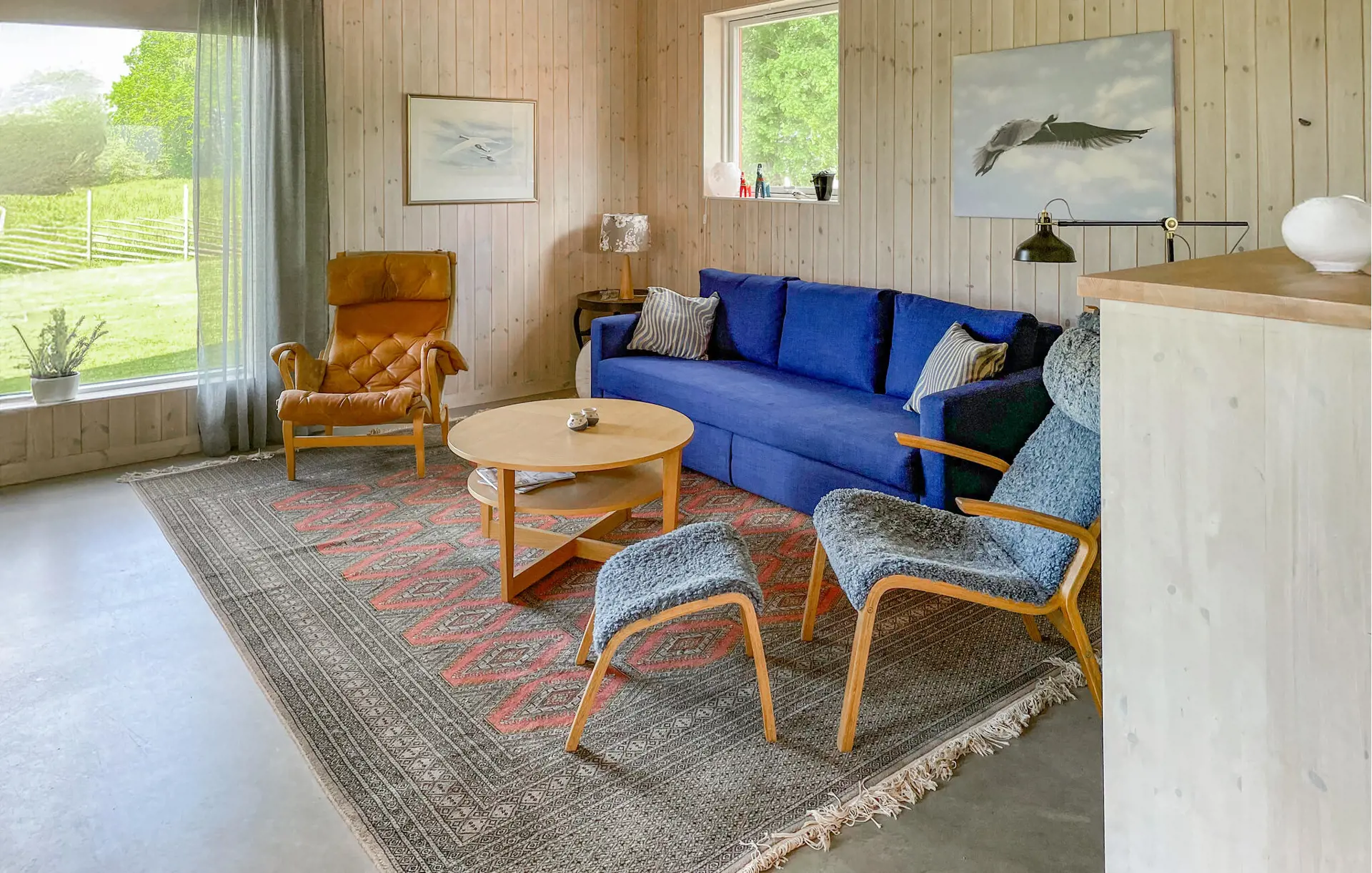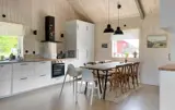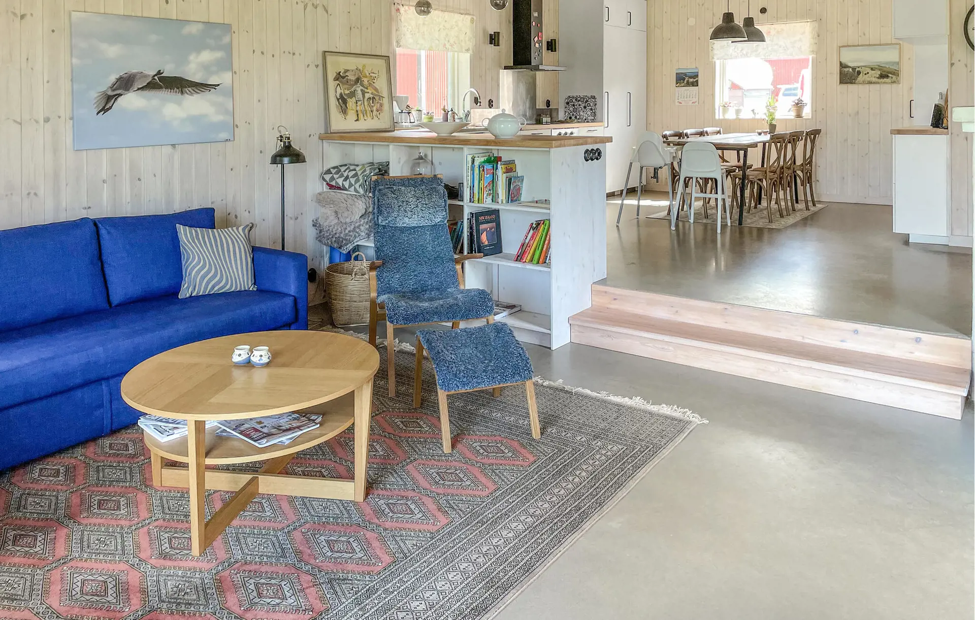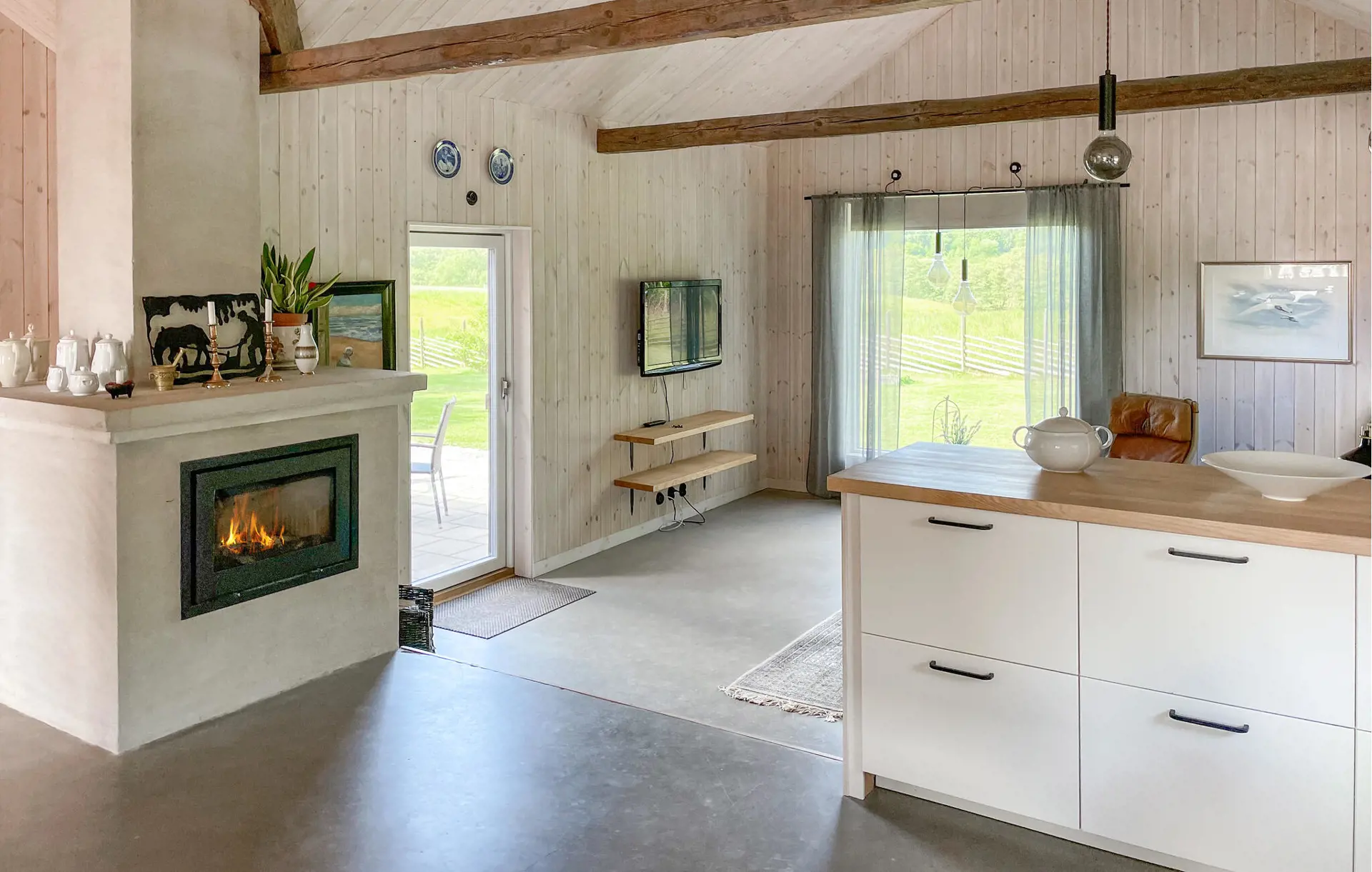 Dieses geräumige Ferienhaus liegt eingebettet in einen weitläufigen Garten und begrüßt Sie mit einer hellen und einladenden Wohnatmosphäre. Bereiten Sie gemeinsam Ihre Lieblingsgerichte zu und nehmen Sie im behaglichen Essbereich Platz. Im gemütlichen Wohnzimmer genießen Sie beim Lesen und Plaudern einen schönen Blick ins Grüne. Lauschen Sie dem Knistern des norwegischen Kaminofens, streamen Sie einen Film oder veranstalten Sie einen Spieleabend.