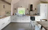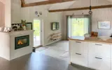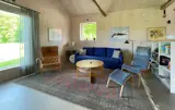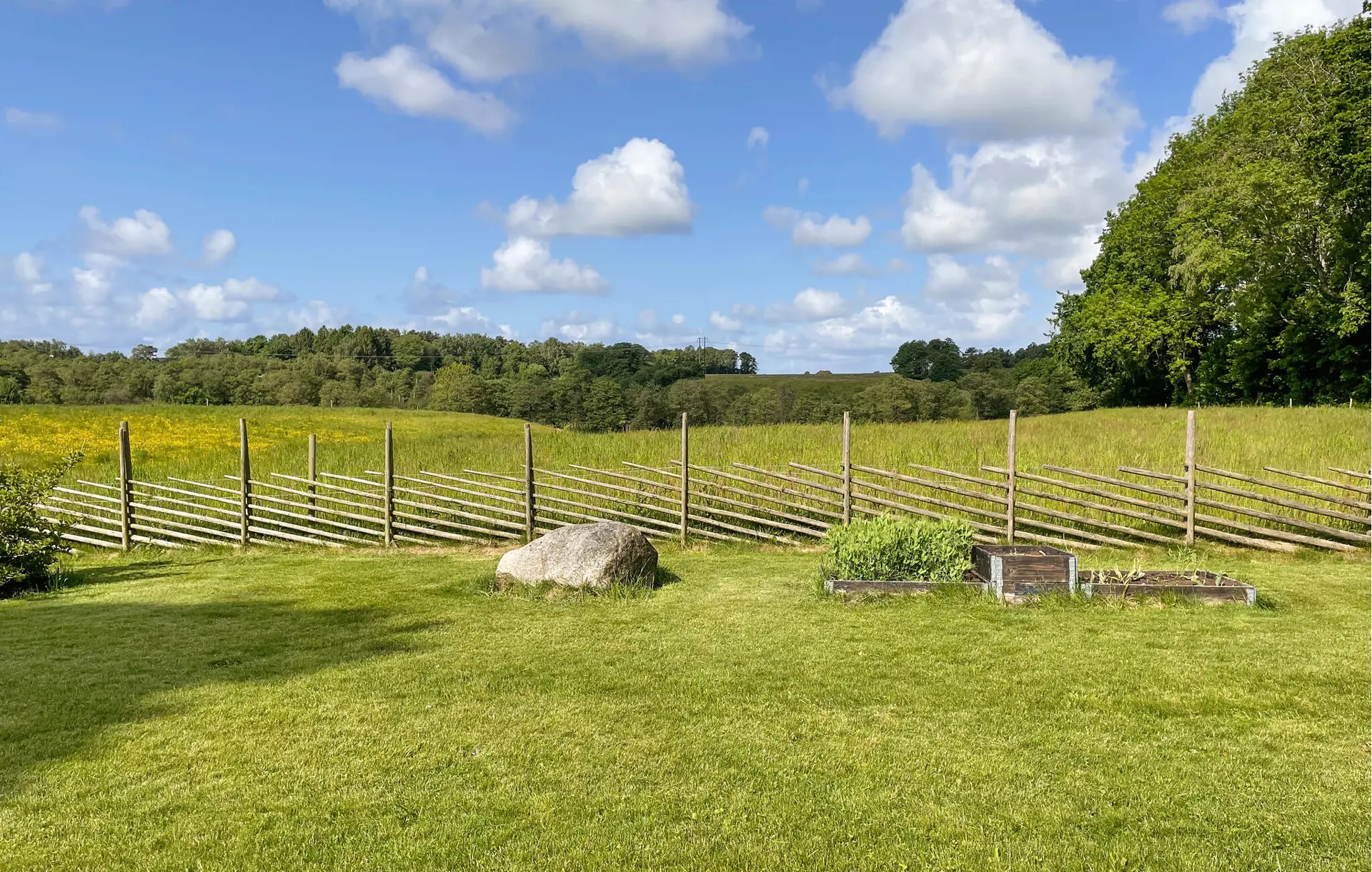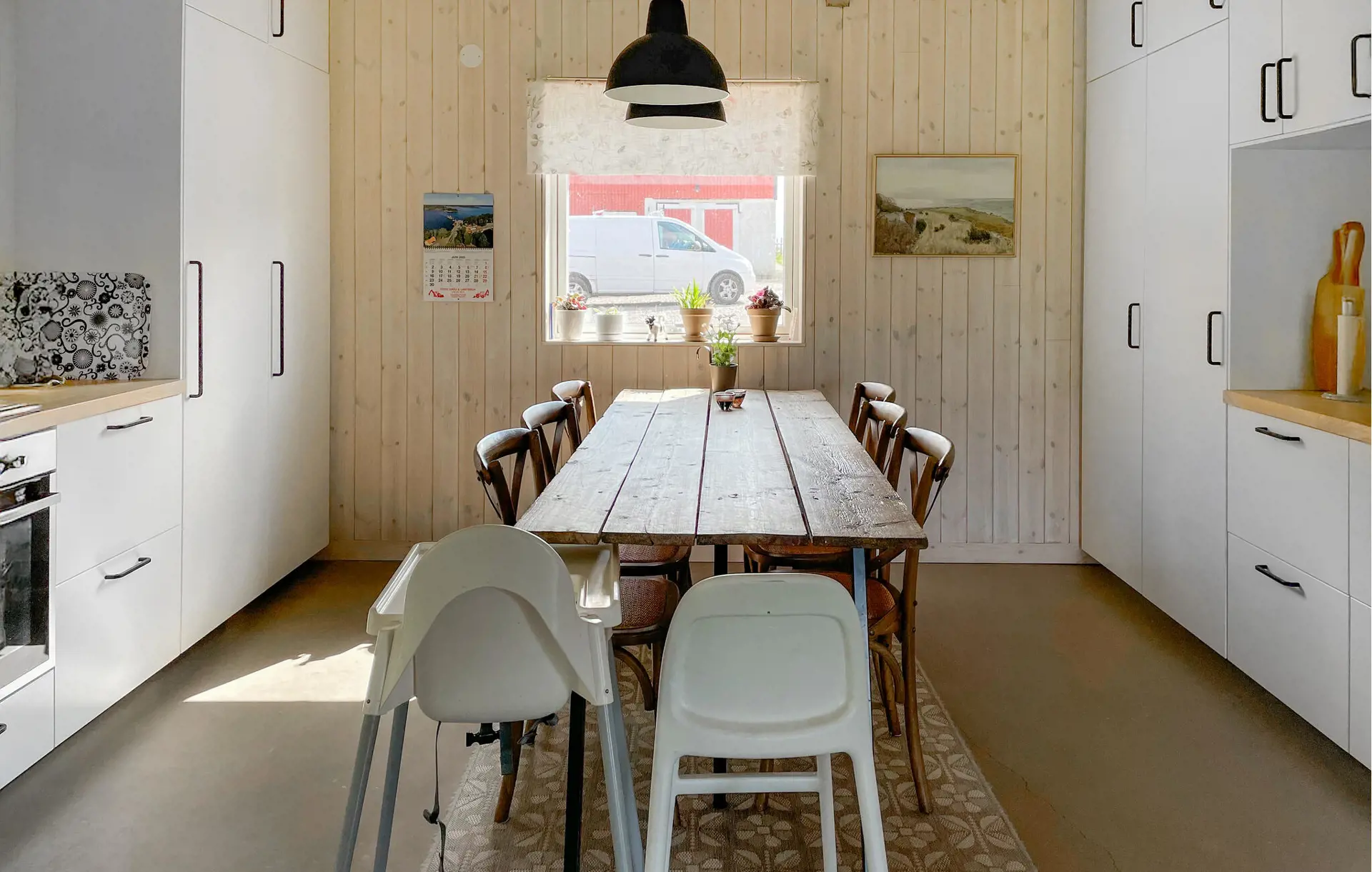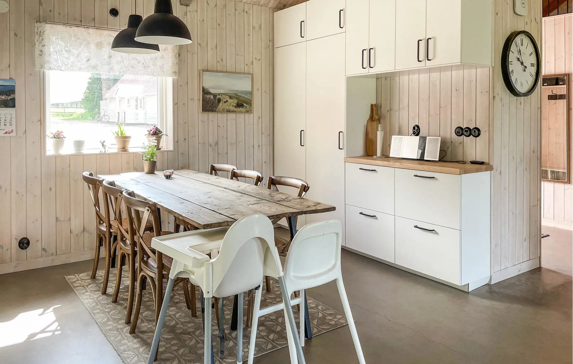 Dieses geräumige Ferienhaus liegt eingebettet in einen weitläufigen Garten und begrüßt Sie mit einer hellen und einladenden Wohnatmosphäre. Bereiten Sie gemeinsam Ihre Lieblingsgerichte zu und nehmen Sie im behaglichen Essbereich Platz. Im gemütlichen Wohnzimmer genießen Sie beim Lesen und Plaudern einen schönen Blick ins Grüne. Lauschen Sie dem Knistern des norwegischen Kaminofens, streamen Sie einen Film oder veranstalten Sie einen Spieleabend.