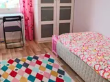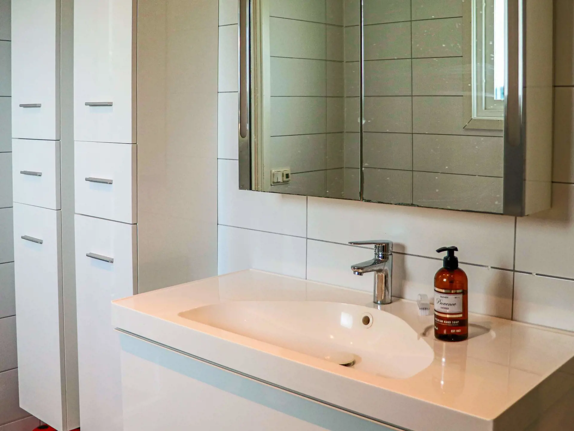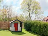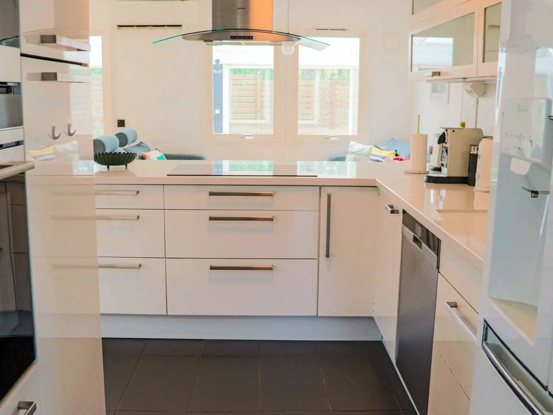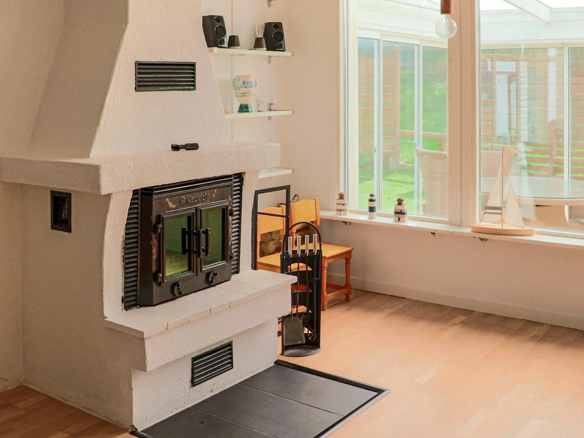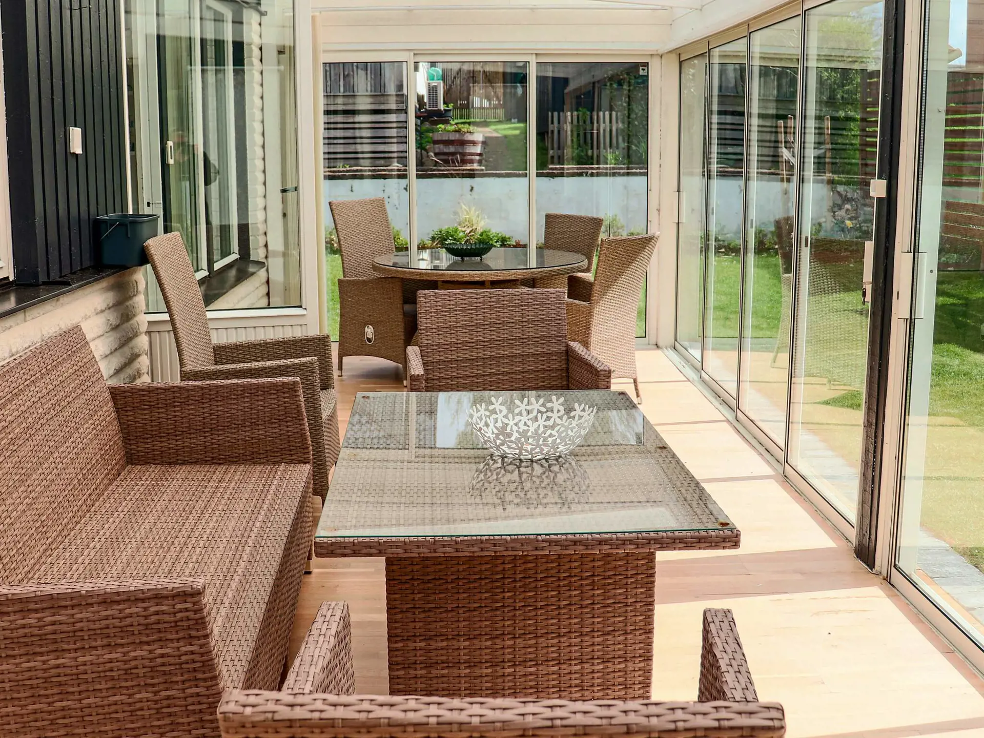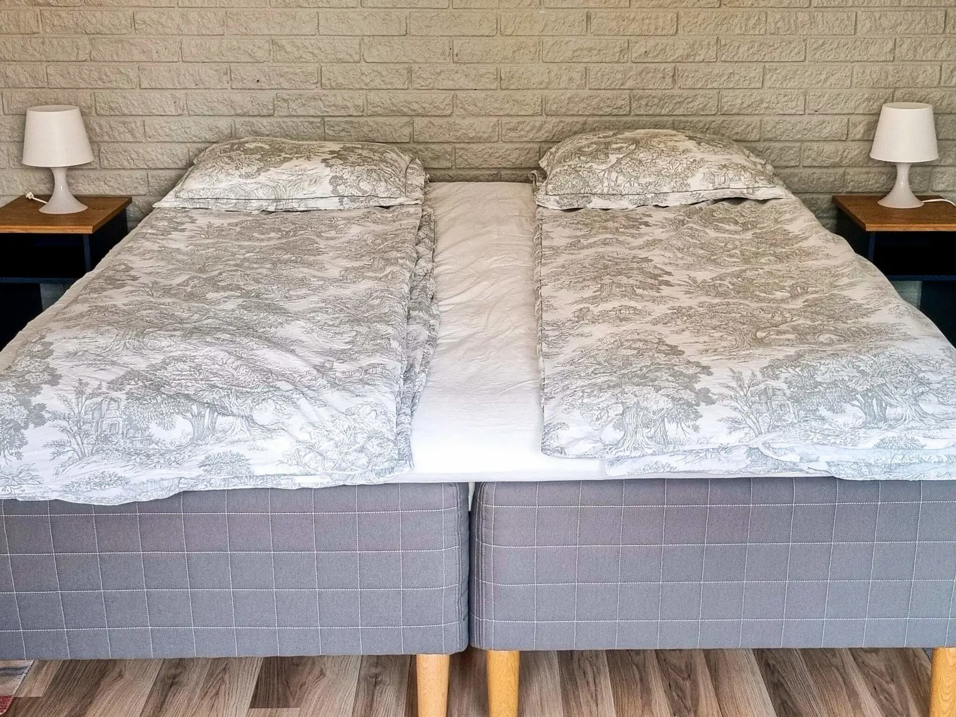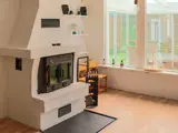 From the entrance of the house there is a bathroom with shower. There is a bedroom with a double bed and two smaller ones with a single bed each. There is another bedroom a little secluded with its own entrance and toilet. The kitchen is open and well-equipped. The heart of the house is the spacious living room which has both a dining area and comfortable seating. There is also a wood-burning stove if you are staying here during the slightly cooler season. From the living room is the exit to a glazed conservatory with both a dining area and comfortable outdoor furniture. The laundry room also has an extra shower. The plot is partially protected from view and the lawn is tended by a robotic mower.