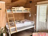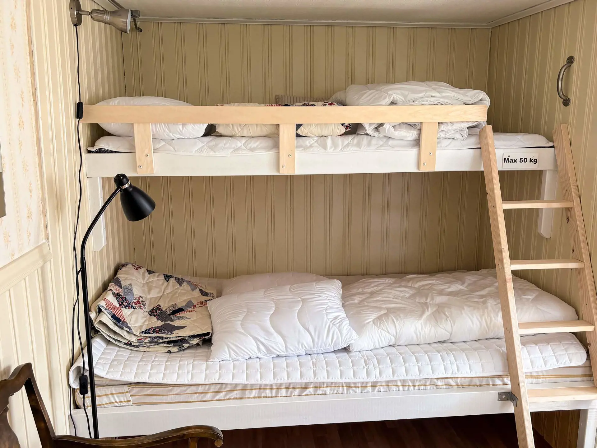 Es gibt ein Schlafzimmer mit einem 90 cm breiten Einzelbett und einem Etagenbett, wobei das obere Bett 75 cm und das untere Bett 120 cm breit ist. Im Wohnzimmer gibt es ebenfalls ein Einzelbett und ein Etagenbett mit den gleichen Abmessungen wie die Betten im Schlafzimmer.