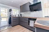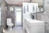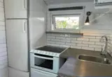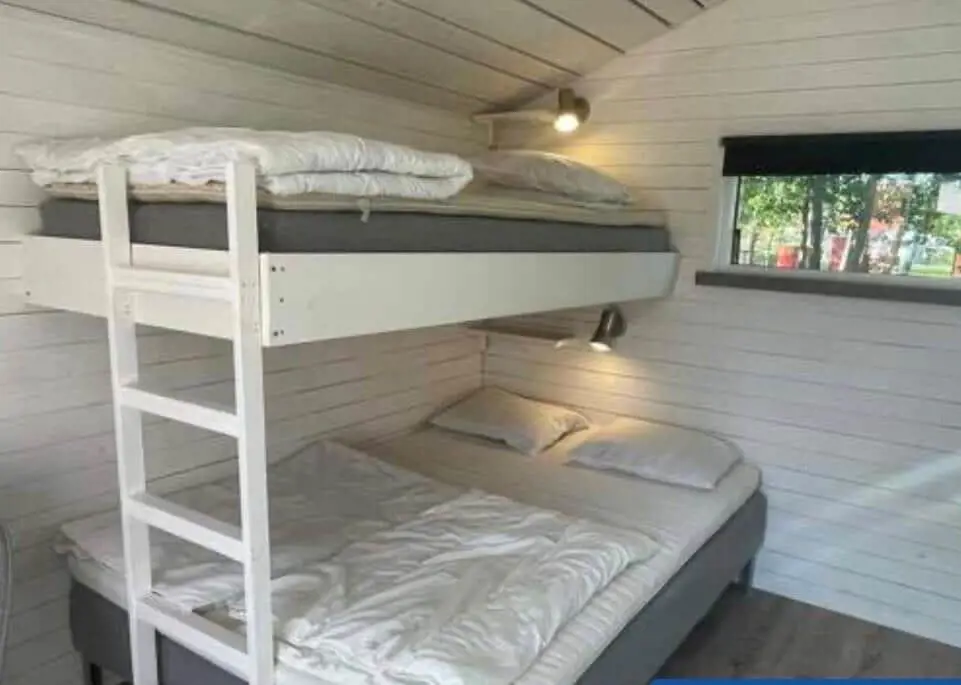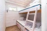 Gegenüber der Küche befindet sich ein Etagenbett mit Doppelbett (140 cm) unten und Einzelbett (90 cm) oben. Das kleine Badezimmer verfügt über WC und Dusche. Das Haus wird elektrisch beheizt.