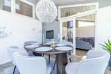 Der offene Grundriss zwischen Wohnzimmer und Küche ist gemütlich eingerichtet und verfügt über zwei Sofas, TV mit Chromecast, Kamin sowie Internet (inklusive). Die Küche ist voll ausgestattet mit 4-Platten-Induktionskochfeld, Backofen, Kühl- und Gefrierschrank mit Eiswürfelmaschine, Weinkühlschrank, Geschirrspüler, Mikrowelle und Dunstabzugshaube.