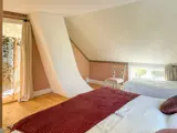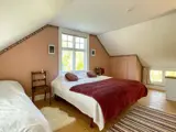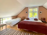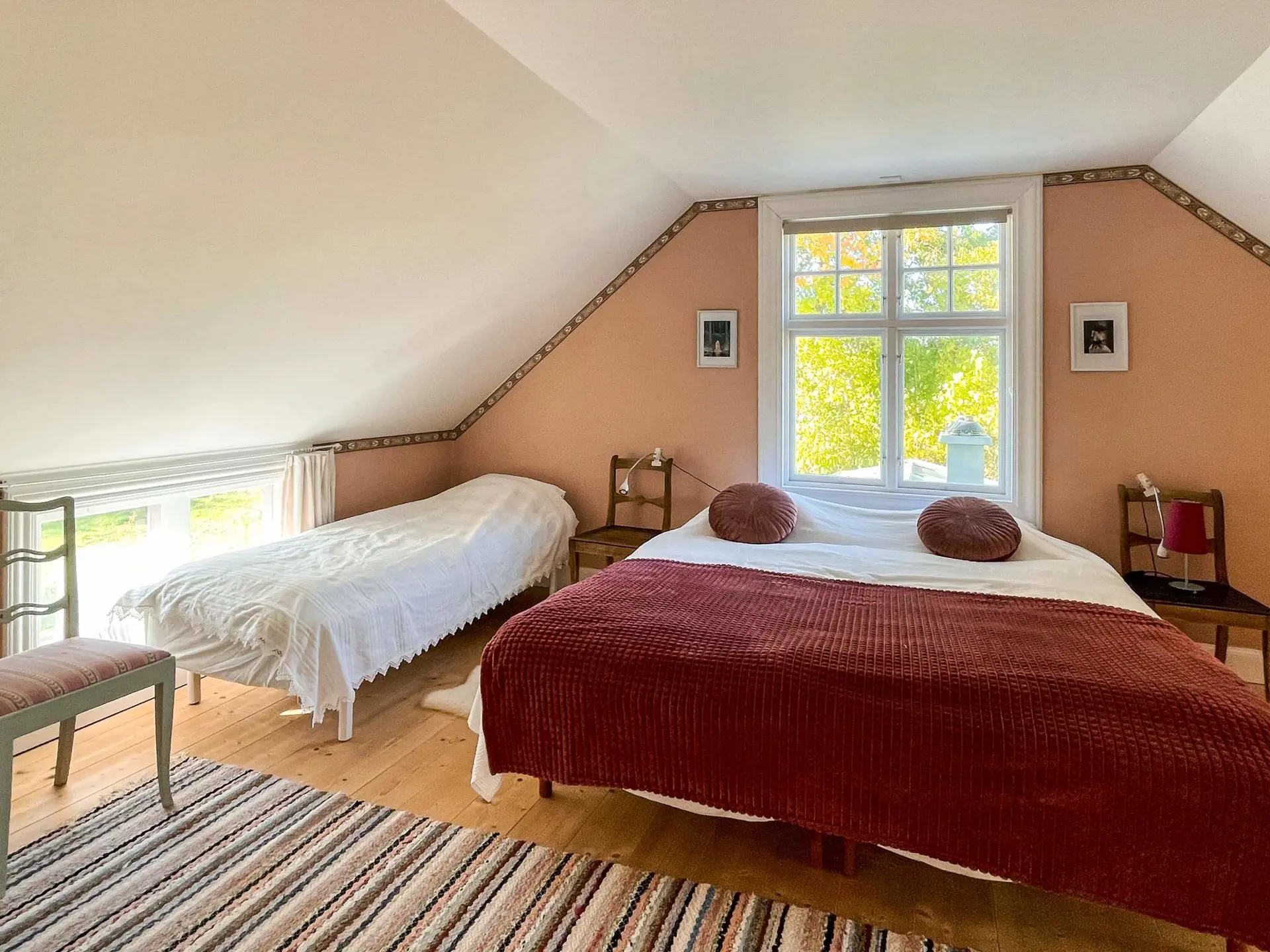Im Obergeschoss befinden sich drei Schlafzimmer; eines mit 180 cm breitem Doppelbett und 80 cm breitem Einzelbett, das zweite mit Vorhängen und ebenfalls Doppel- und Einzelbett. Der Raum oberhalb der Treppe dient als drittes Schlafzimmer (ohne Zimmertür) ist mit einem Bett, das zu einem Doppelbett ausgezogen werden kann, ausgestattet. Es gibt auch ein einfacheres Zustellbett, das Sie nach Belieben aufstellen können.