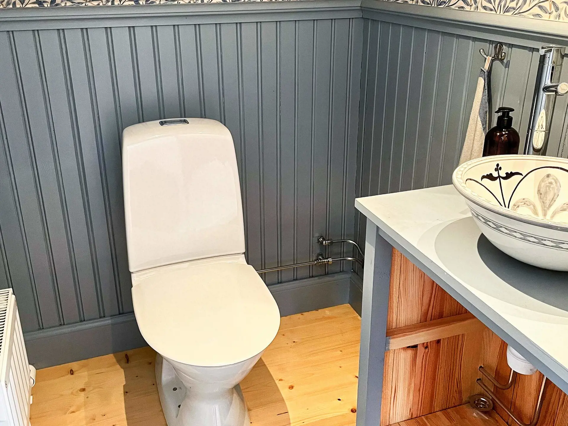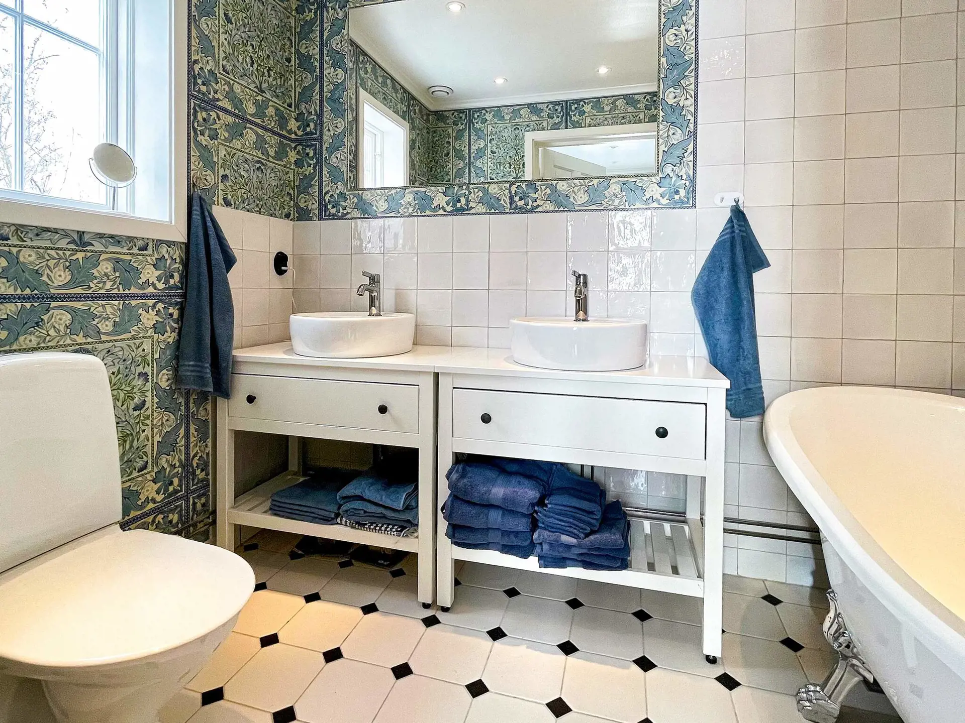 Unten befindet sich ein umwerfend schönes Badezimmer mit Badewanne, WC und Doppelwaschbecken. Auf der oberen Etage, mit Eingang von einem der Schlafzimmer, befindet sich ein WC mit Waschbecken. Kombinierter Waschtrockner im Haus.