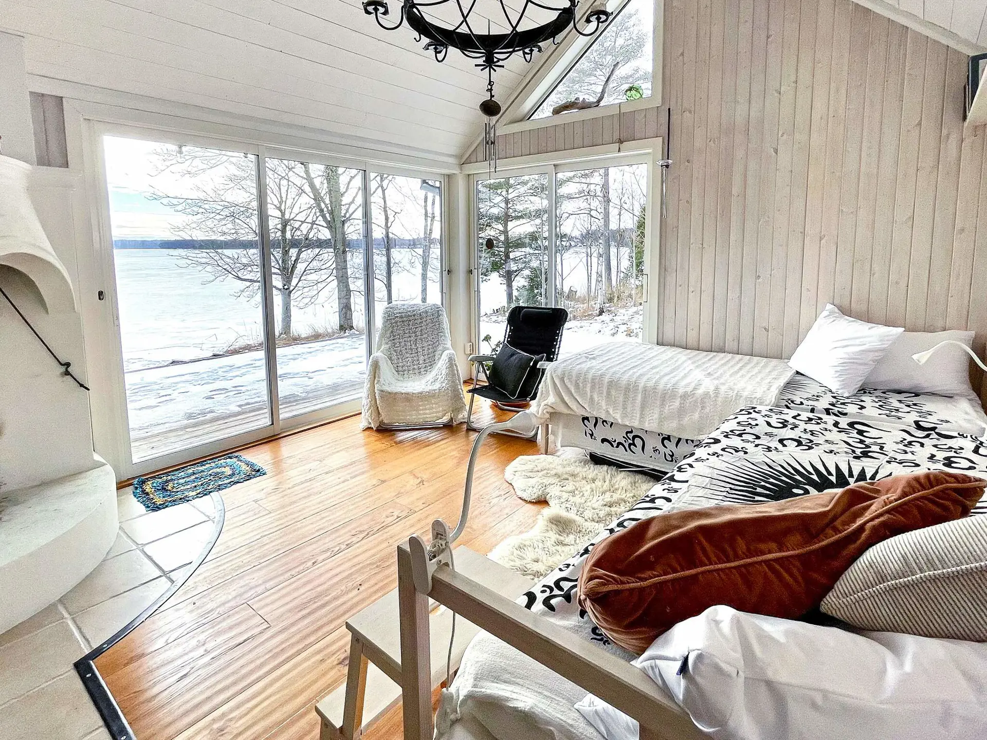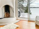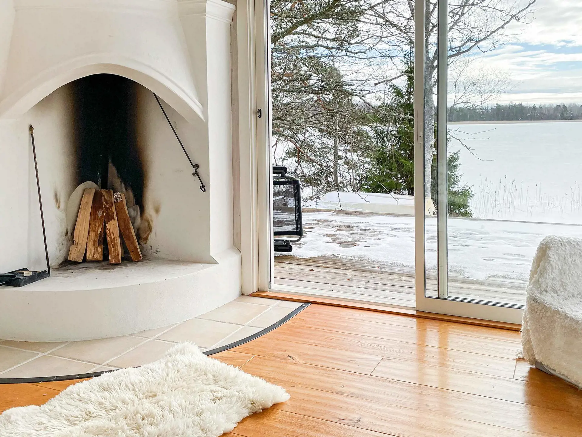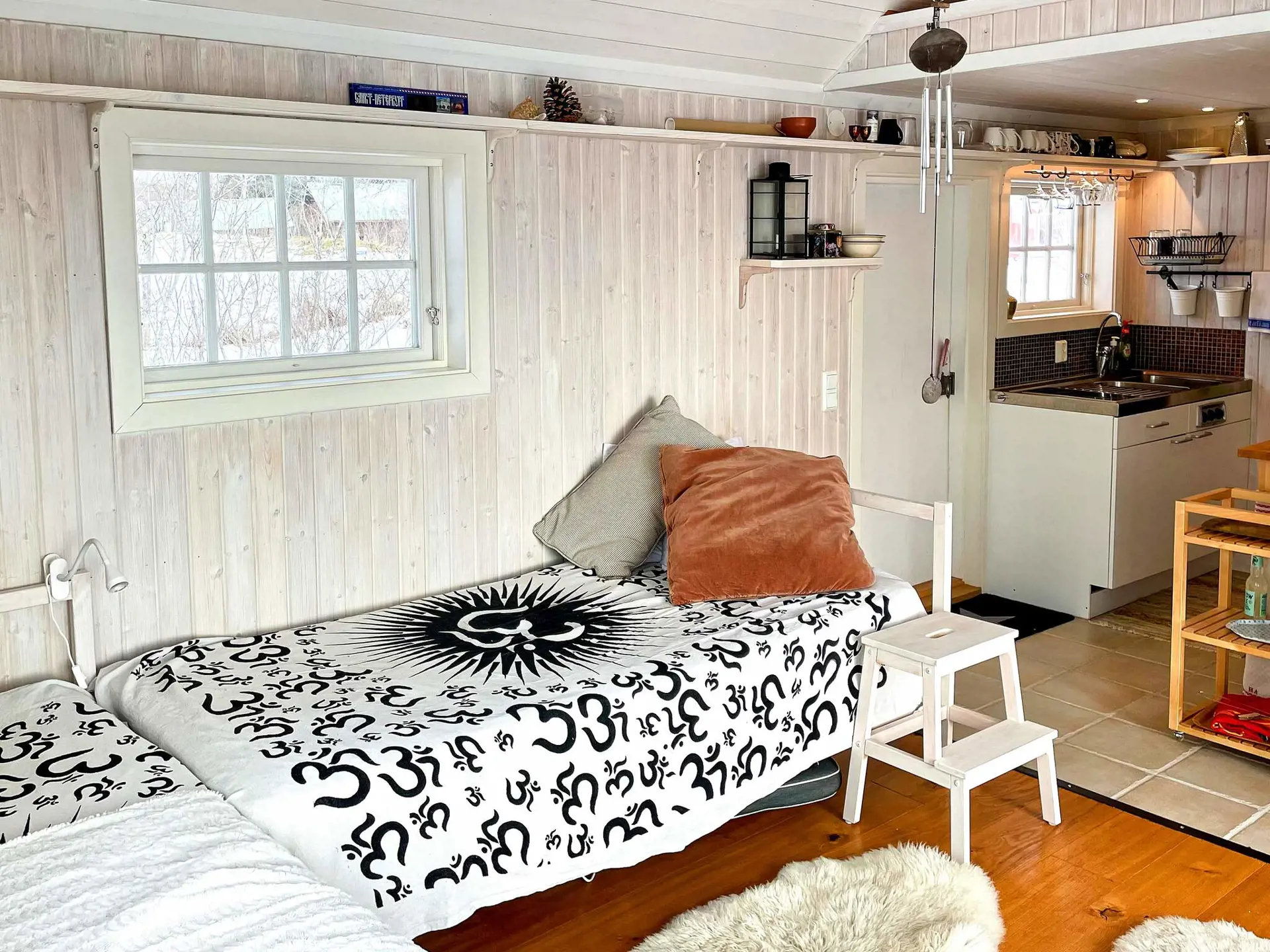 Die Decke im Häuschen ist bis zum Dachfirst offen, so gibt es Platz und große Glasflächen, damit Sie den herrlichen Seeblick genießen können. Es gibt zwei Betten im Wohnzimmer vor dem Kamin. Sie haben eine kleine trinettküche mit zwei Induktionskochfeldern, Mikrowelle, Kaffeemaschine und Kühlschrank mit Gefrierfach. Neben der schönen holzbefeuerten Sauna im Bad gibt es auch eine Dusche, WC und Waschbecken. Eine bestimmte Menge Brennholz ist im Preis inbegriffen.