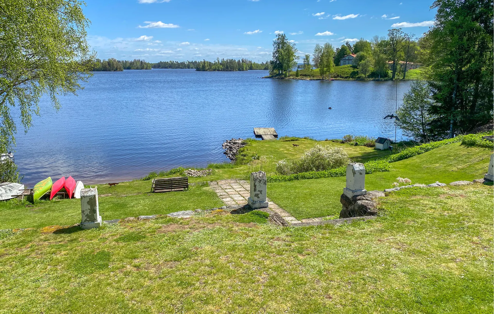 Verweilen Sie auf einer der großzügigen Terrassen, grillen Sie gemeinsam oder lesen Sie ein Buch in den Loungemöbeln mit Blick aufs Wasser. Spielen Sie mit Ihren Kindern auf der gepflegten Rasenfläche mit Schaukel oder setzen Sie sich an das Ufer auf die Bank und lassen Sie den Blick über den See schweifen. Der eigene Bootssteg mit Boot lädt zu Ausflügen auf dem Wasser ein.