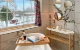 Das liebevoll eingerichtete Ferienhaus vereint rustikale Gemütlichkeit mit modernem Komfort. Die hellen Räume, die freundliche Dekoration und der einladende Wohnbereich mit Kamin sorgen für eine entspannte Atmosphäre. Gönnen Sie sich ein wenig Wellness, schwitzen in der Sauna oder nehmen ein Schaumbad in der Badewanne. In der gut ausgestatteten Küche können Sie regionale Spezialitäten zubereiten und Ihre Mahlzeiten anschließend auf der schönen Holzterrasse genießen – ideal für entspannte Stunden an der frischen Luft. Der weitläufige Garten lädt Sie zu Spielen und Erholung ein.