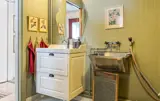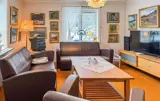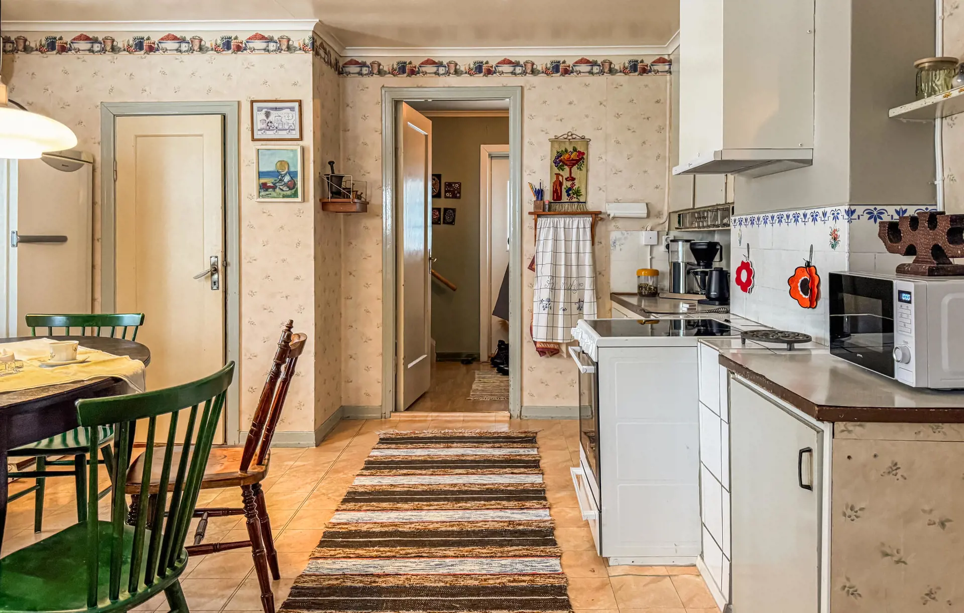 Treten Sie ein und fühlen Sie sich sofort willkommen. Nehmen Sie im behaglichen Wohnbereich mit Sofas, Couchtisch und Fernseher Platz und verbringen Sie entspannte Abende in wohnlicher Atmosphäre. Die Einrichtung ist klassisch und persönlich, mit Bildern an den Wänden und warmen Farben, die dem Haus seinen Charakter verleihen. Nutzen Sie die geräumige Küche mit Essplatz für gemeinsame Mahlzeiten. Genießen Sie hier das gemütliche Zusammensein bei Frühstück oder Abendessen.