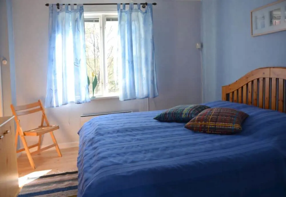 Da es sich bei diesem Haus um ein ehemaliges Wohnhaus handelt, bietet es wirklich alles, was man zum Leben braucht. Auf 80 m² Wohnfläche hat eine Gruppe oder eine Familie von bis zu 5 Personen ausreichend Platz. Die Raumaufteilung ist - typisch für historische Häuser - auf beiden Etagen ringförmig um den zentralen Schornstein herum angeordnet. Sie betreten das Haus über einen Eingangsbereich, von dem aus Sie linker Hand in die gemütliche, typisch schwedische Küche gelangen. Diese bietet Ihnen neben einem großen Kühl- und Gefrierschrank, Ofen, E-Herd, Mikrowelle und Filterkaffeemaschine alles, was Sie zum Zubereiten und Servieren gängiger Gerichte benötigen. Durch die Küche hindurch gelangen Sie ins große Wohnzimmer, wo Sie sich auf zwei Sofas und einem Sessel beim Gespräch, bei einem guten Buch oder vor dem Satelliten-Fernseher entspannen können. Gehen Sie weiter im Uhrzeigersinn um den zentralen Schornstein herum, gelangen Sie in einen kleinen Flur, auf dessen einer Seite das Badezimmer mit Dusche und auf der anderen Seite das WC liegt. Noch weiter geradeaus erreichen Sie durch eine Schiebetür das große erste Schlafzimmer mit Doppelbett, von dem aus Sie wieder im Uhrzeigersinn in den Eingangsbereich gelangen.