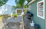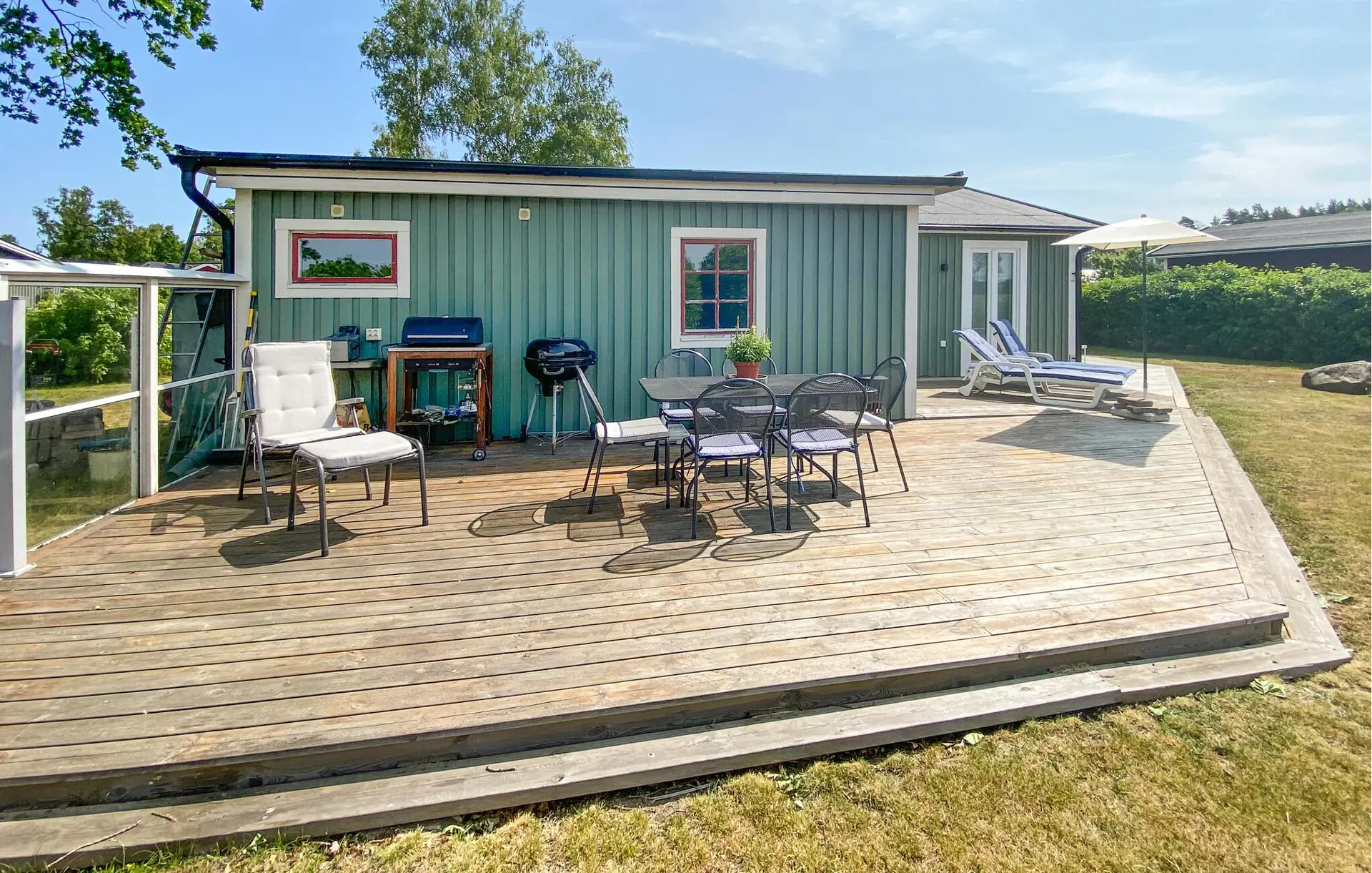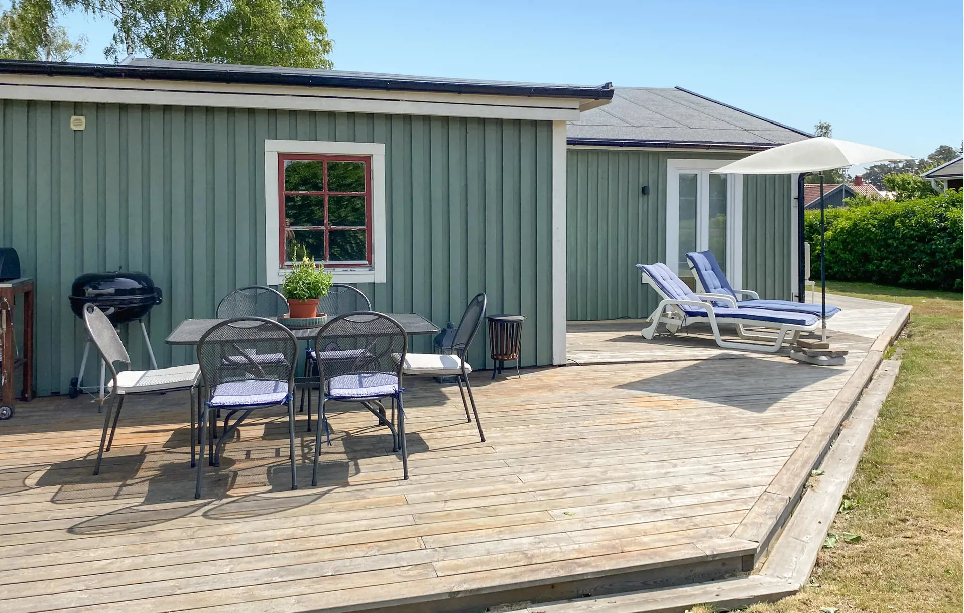 Die gemütliche Holzterrasse lädt zu jeder Tageszeit zu einem Aufenthalt ein: schon morgens mit einer Tasse Tee, zum Sonnenbaden am Vormittag oder zum Lesen im Schatten des Sonnenschirms am Nachmittag. Versammeln Sie abends die Familie beim Grillen und lassen Sie den Tag entspannt ausklingen.