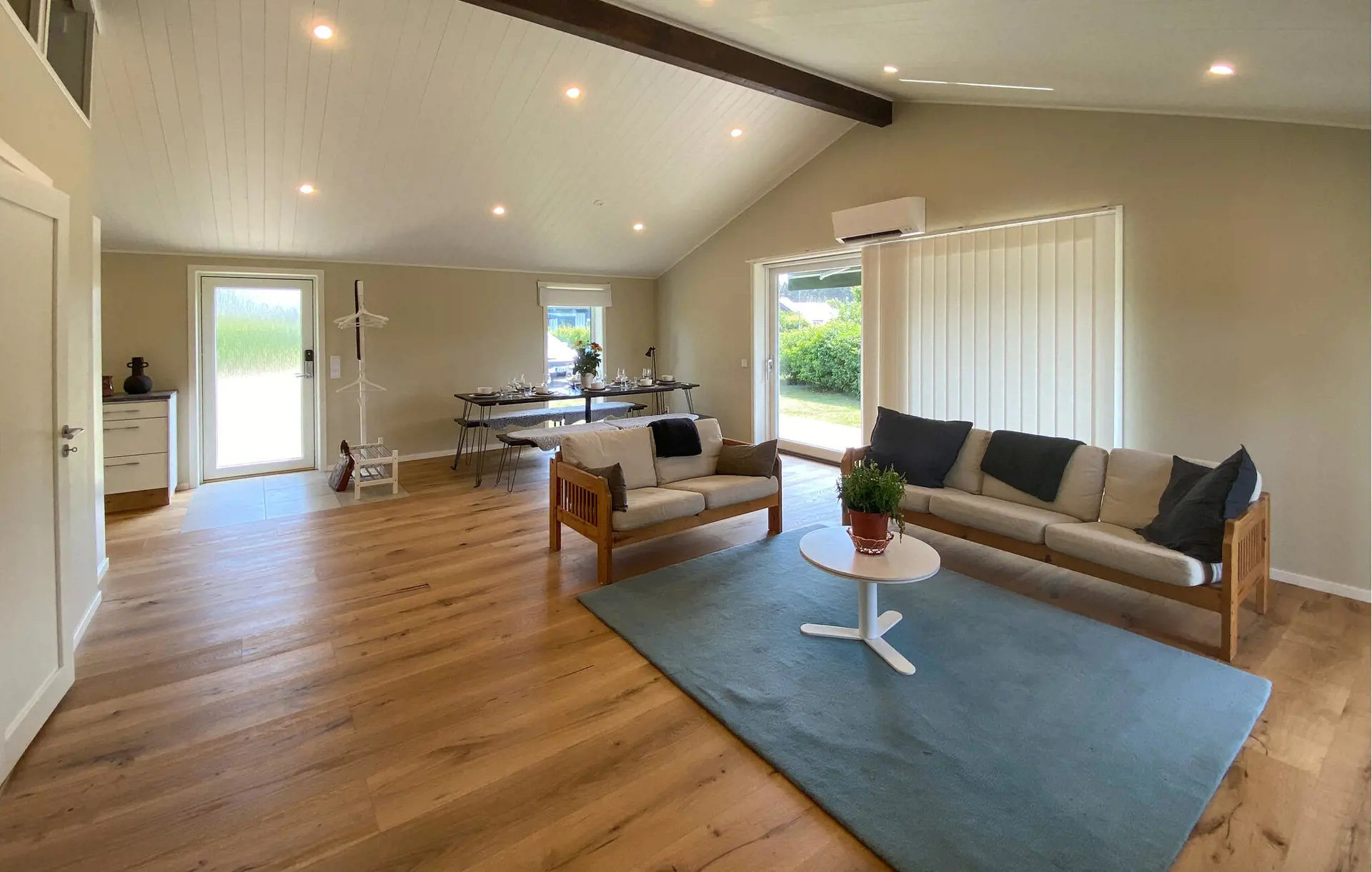 Dieses großzügige Ferienhaus bietet Ihnen einen behaglichen Rückzugsort für Ihren Urlaub. Große, helle Räume, warmes Holz und gemütliche Sofas schaffen eine Atmosphäre, in der Sie schnell entspannen können. Bereiten Sie sich in der modernen Küche frische Mahlzeiten zu und servieren Sie diese mit einem guten Glas Wein.