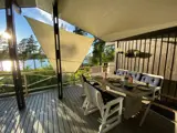 Das Wohnzimmer verfügt über einen bequemen Sitzbereich, einen großen Essbereich, einen Fernseher und einen Kamin. Durch die großen Glasfenster haben Sie einen herrlichen Blick auf das Meer und direkten Zugang zur großen Terrasse. Die offene Terrasse ist ungefähr 60 m2 groß und ungefähr 25 m2 der Terrasse ist überdacht.