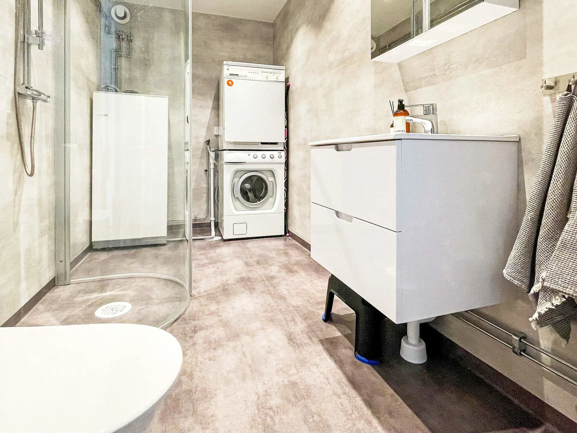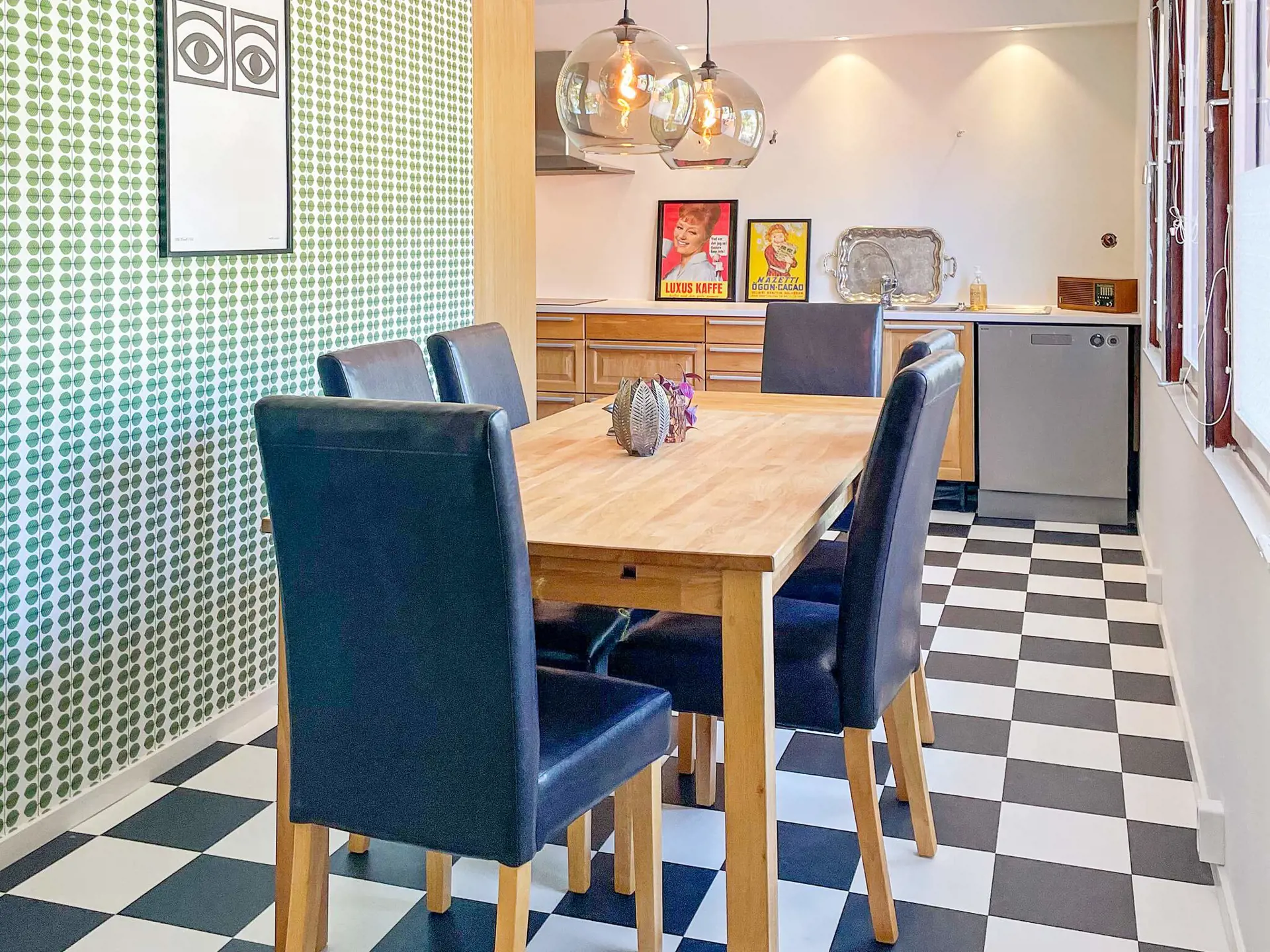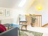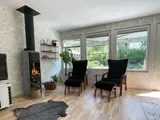 An der Rückseite des Hauses finden Sie einen Rasenfläche sowie Terrasse, Gartenmöbeln und Markise vor. In der stilvollen Küche gibt es einen Essbereich, einen Geschirrspüler und eine allgemein gute Ausstattung. Schönes Wohnzimmer mit großen Fenstern für viel Licht und einer Terrassentür nach hinten. Es gibt sowohl ein Sofa als auch bequeme Sessel, in denen Sie sich zurücklehnen und vor dem Fernseher mit Chromecast oder vielleicht mit einem guten Buch entspannen können.