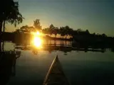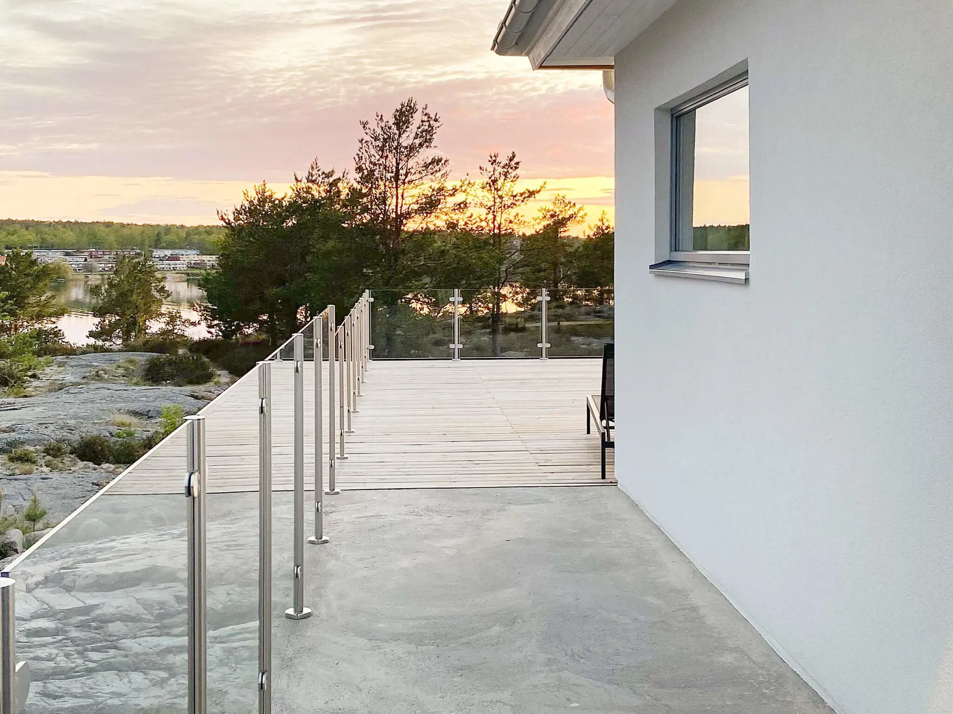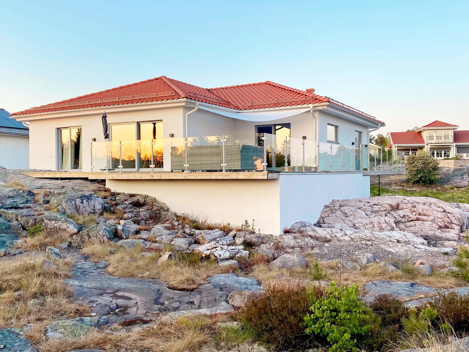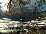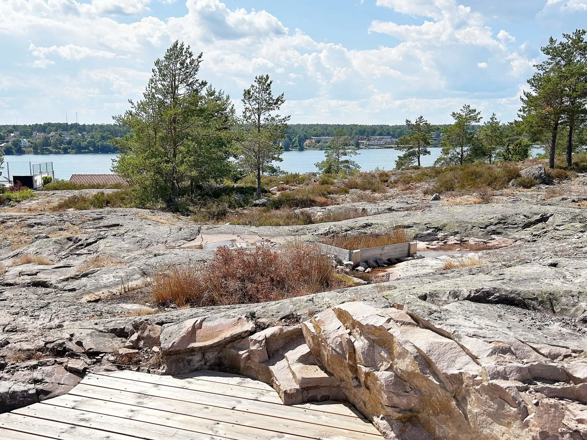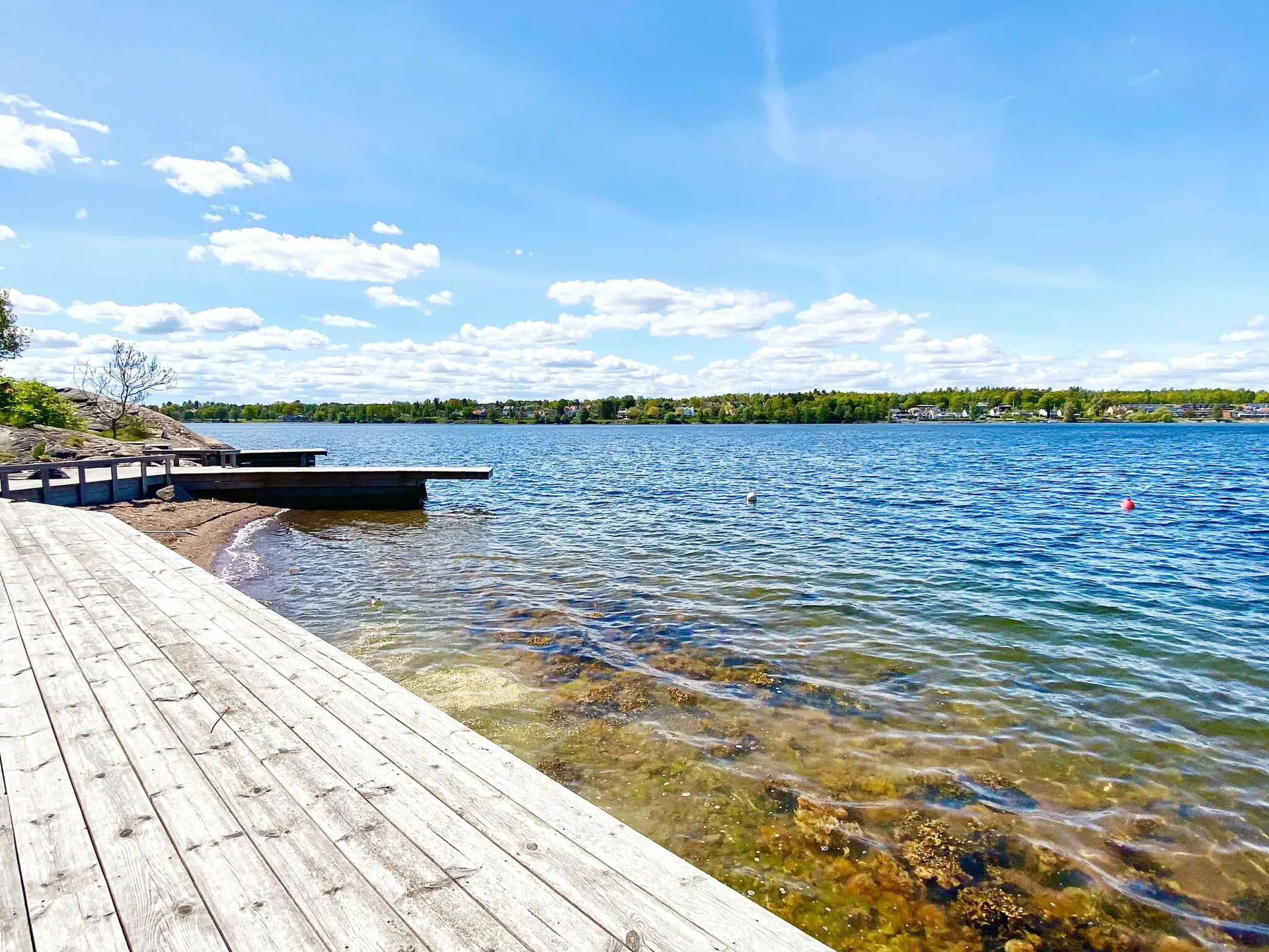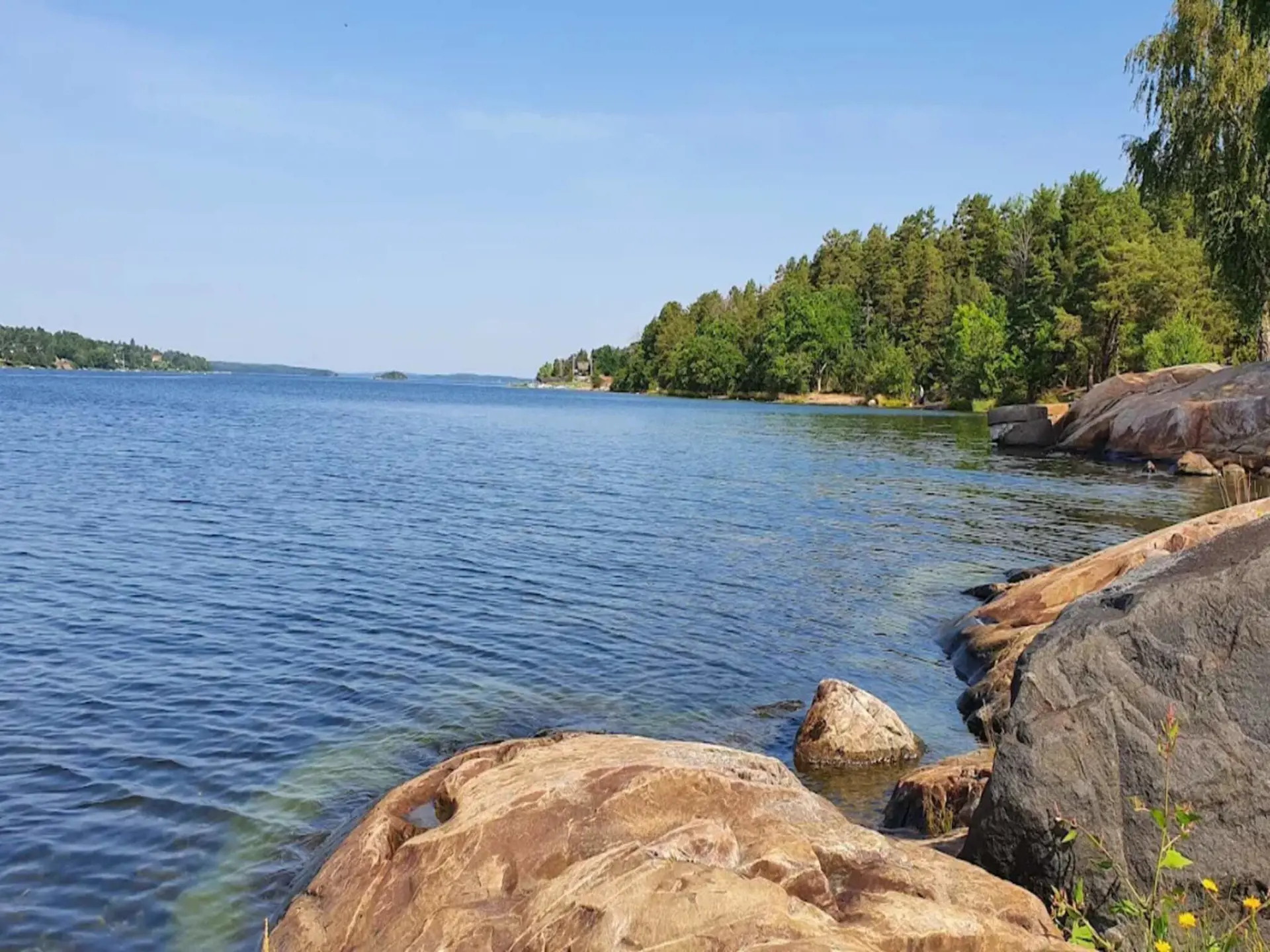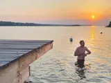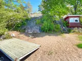 Da das Haus oben auf einer Anhöhe steht, gibt es auch hügeliges Terrain hinunter zum Badeufer. Der Badebereich gehört zu allen Ferienhäusern in der Umgebung.
