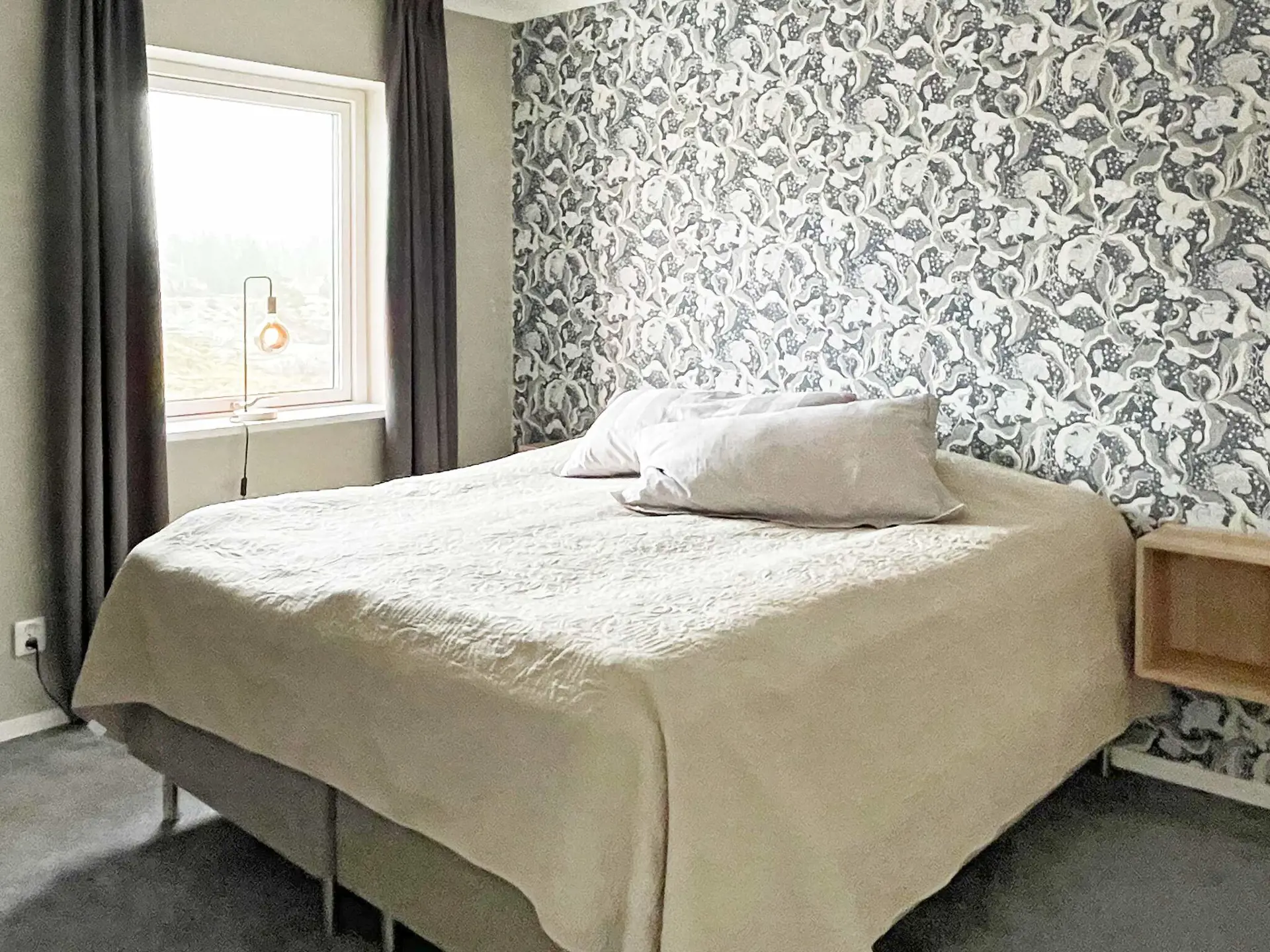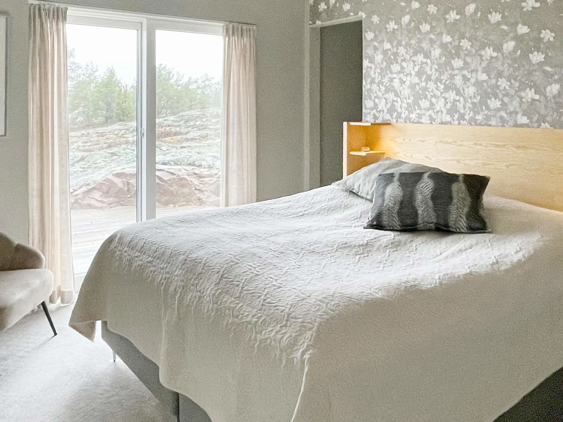 Es stehen insgesamt vier Schlafzimmer zur Auswahl, drei davon sind jeweils mit einem Doppelbett ausgestattet. Im vierten Schlafzimmer, in der unteren Etage, kann eine Familie zusammen übernachten, verteilt auf ein Doppelbett und ein Etagenbett mit zwei Kojen.