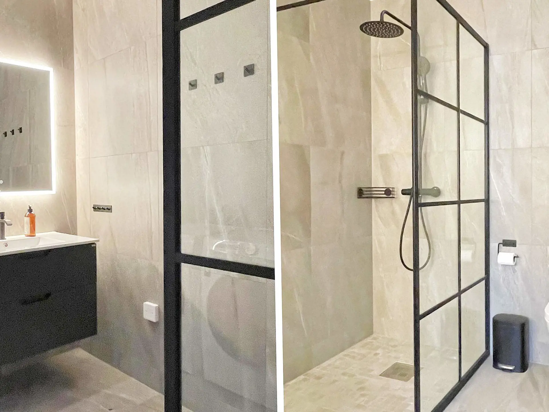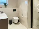 Das Ferienhaus bietet zwei luxuriöse Badezimmer mit WC, Waschbecken und Dusche. Auf der unteren Ebene befindet sich außerdem ein weiteres Gäste-WC mit Waschbecken.\