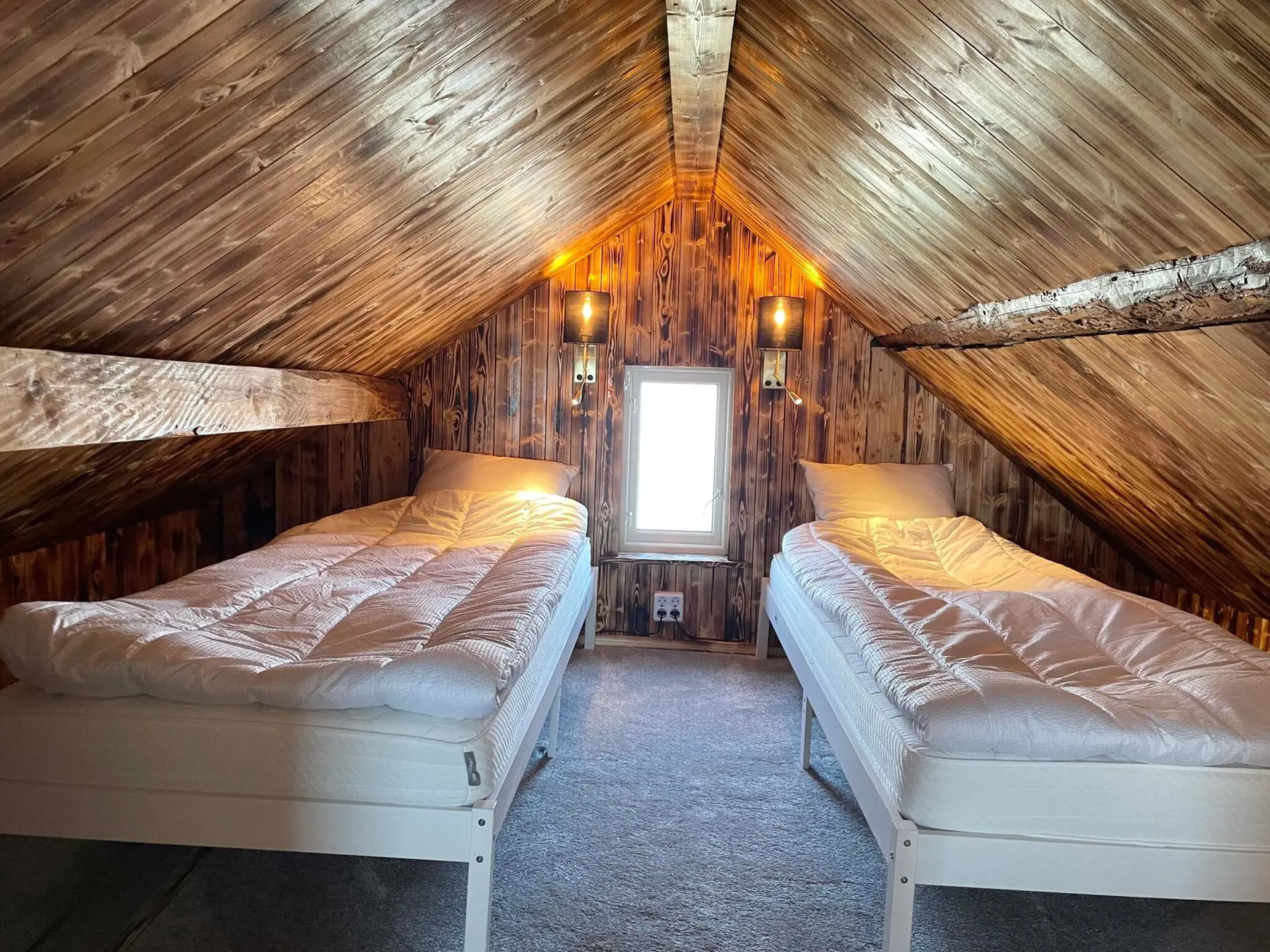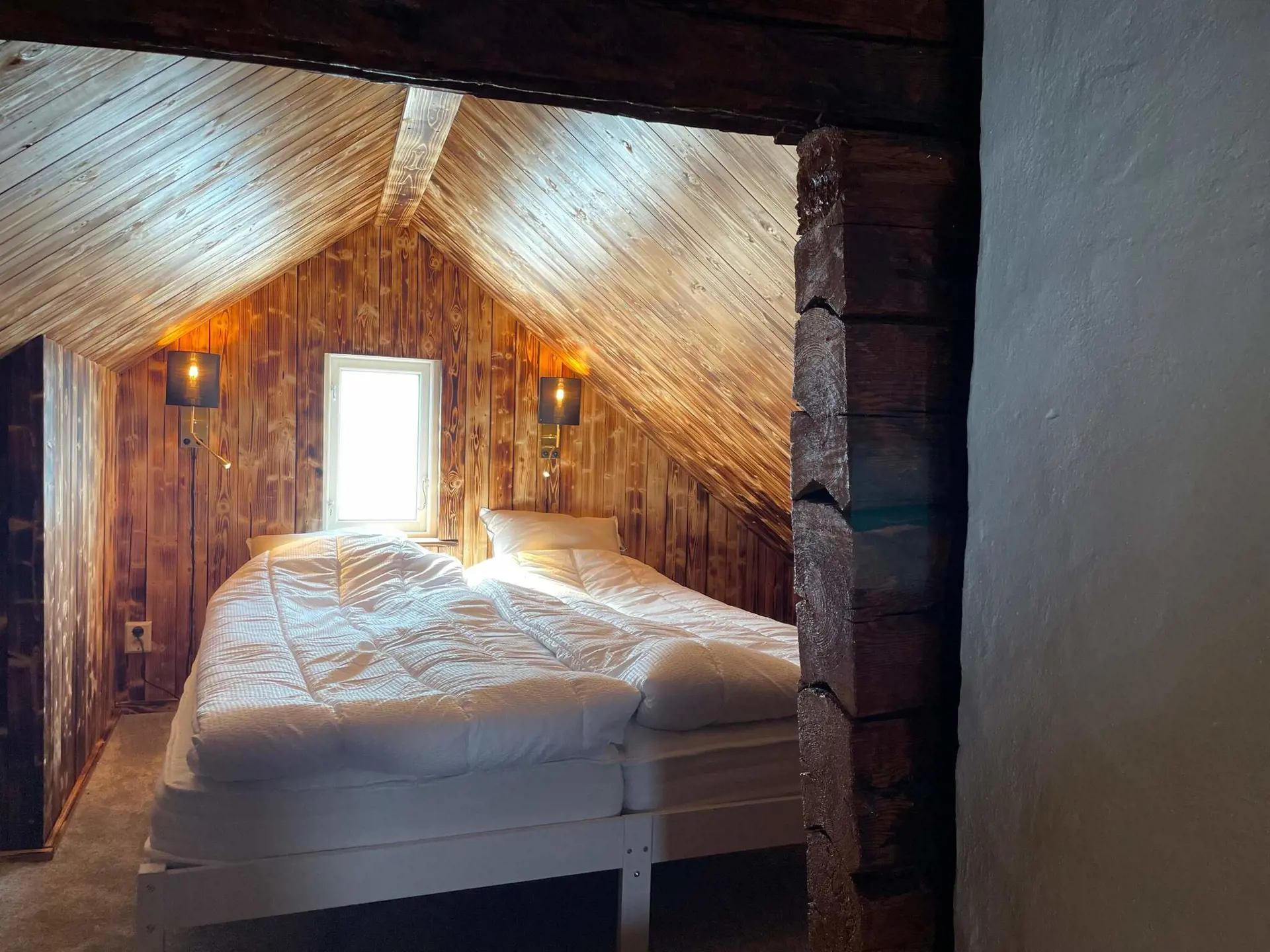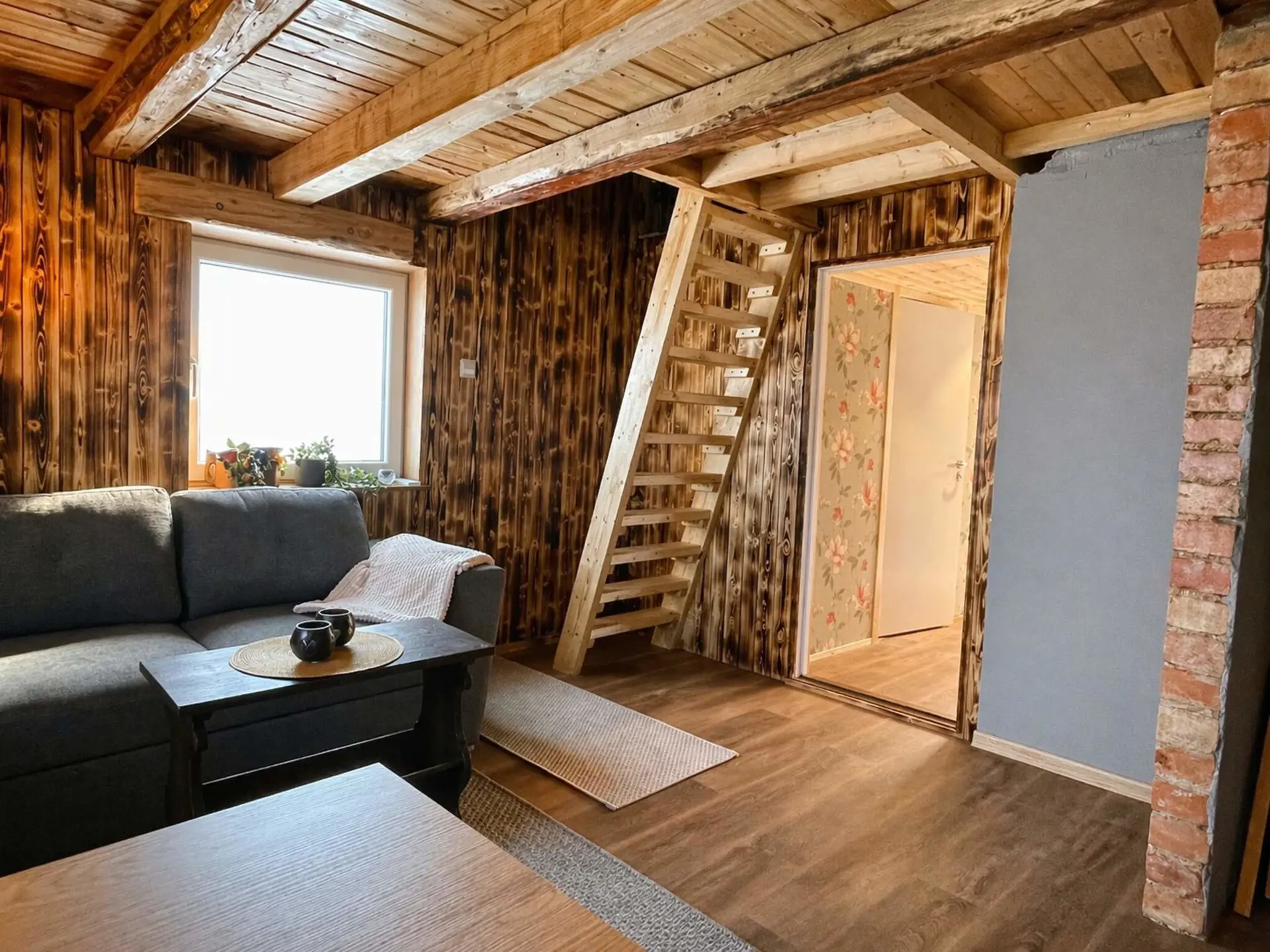 Über eine steile Treppe gelangen Sie zum gemütlichen Schlafboden mit einem Doppelbett und zwei Einzelbetten.