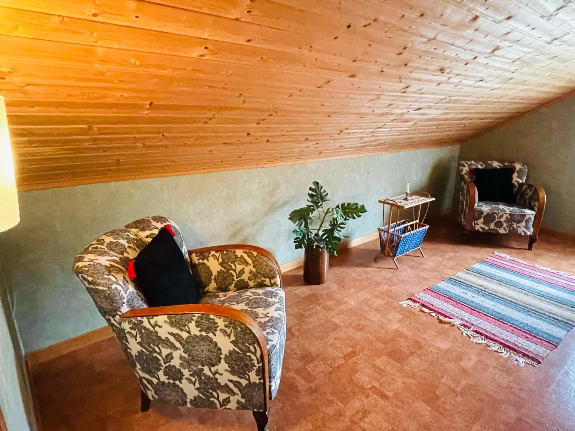 The kitchen is a compact kitchenette equipped with hotplates, a coffee maker, and a microwave. In the living room, there is an open fireplace that creates a cozy atmosphere and invites you to relaxing evenings if the weather turns chilly. The cottage dates back to the 1800s and has preserved its historic charm. The ceiling height upstairs is 185 cm, typical for houses of that time. Please note that the staircase to the upper floor is steep.