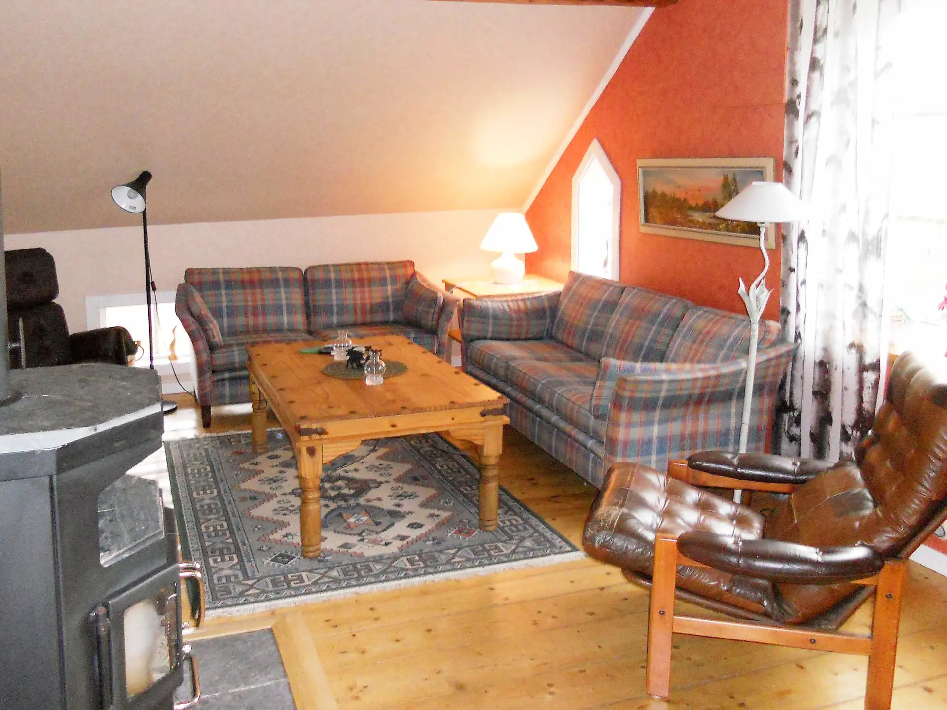Nur etwa 100 m weiter liegt ein eigener Angelsee, aus dem man Forellen angeln und dann gleich unten am Ufer grillen kann. Noch zwei weitere Seen in der näheren Umgebung, an beiden liegt ein Boot für Sie bereit. Schwimmwesten für 6 Erw. + 4 Ki. stehen zur Verfügung. Früh morgens lassen sich vom Balkon des Hauses aus evtl. Rehe oder Elche beobachten. Abends kann man es sich im großen Aufenthaltsraum, mit sichtbarem Dachgebälk und Kaminofen, so richtig gemütlich machen.